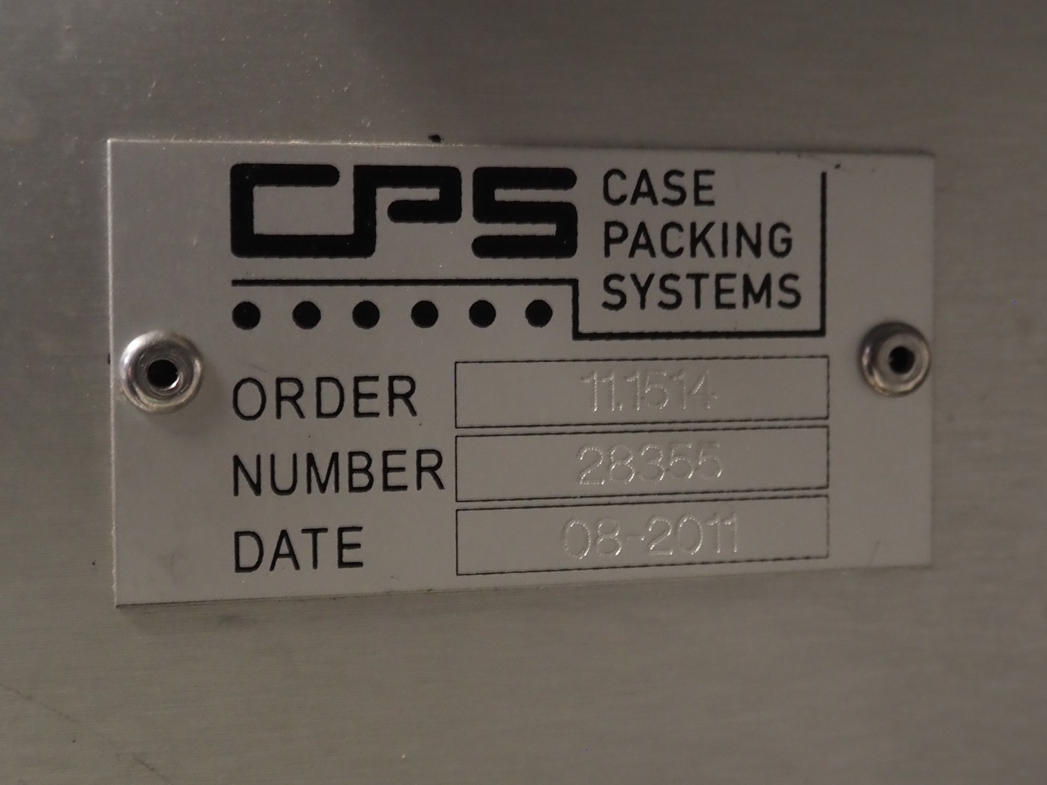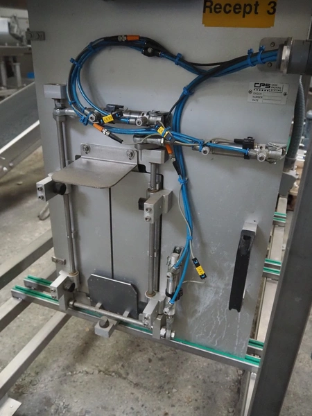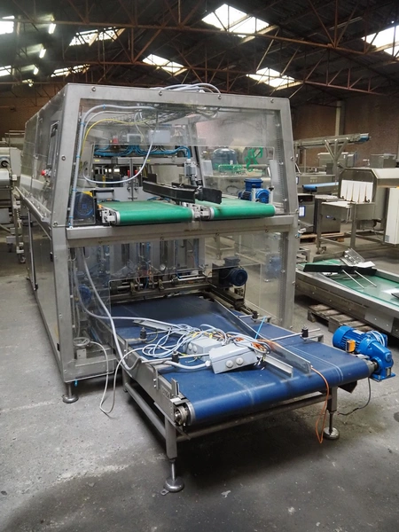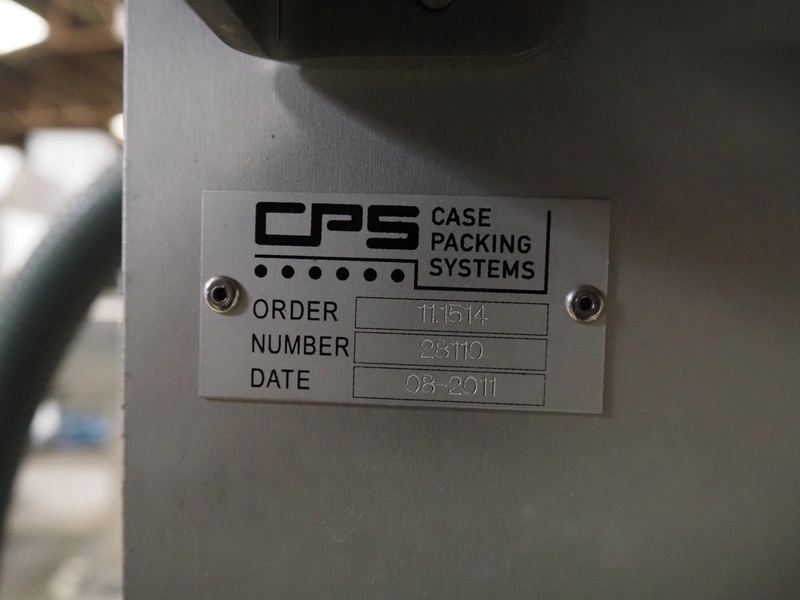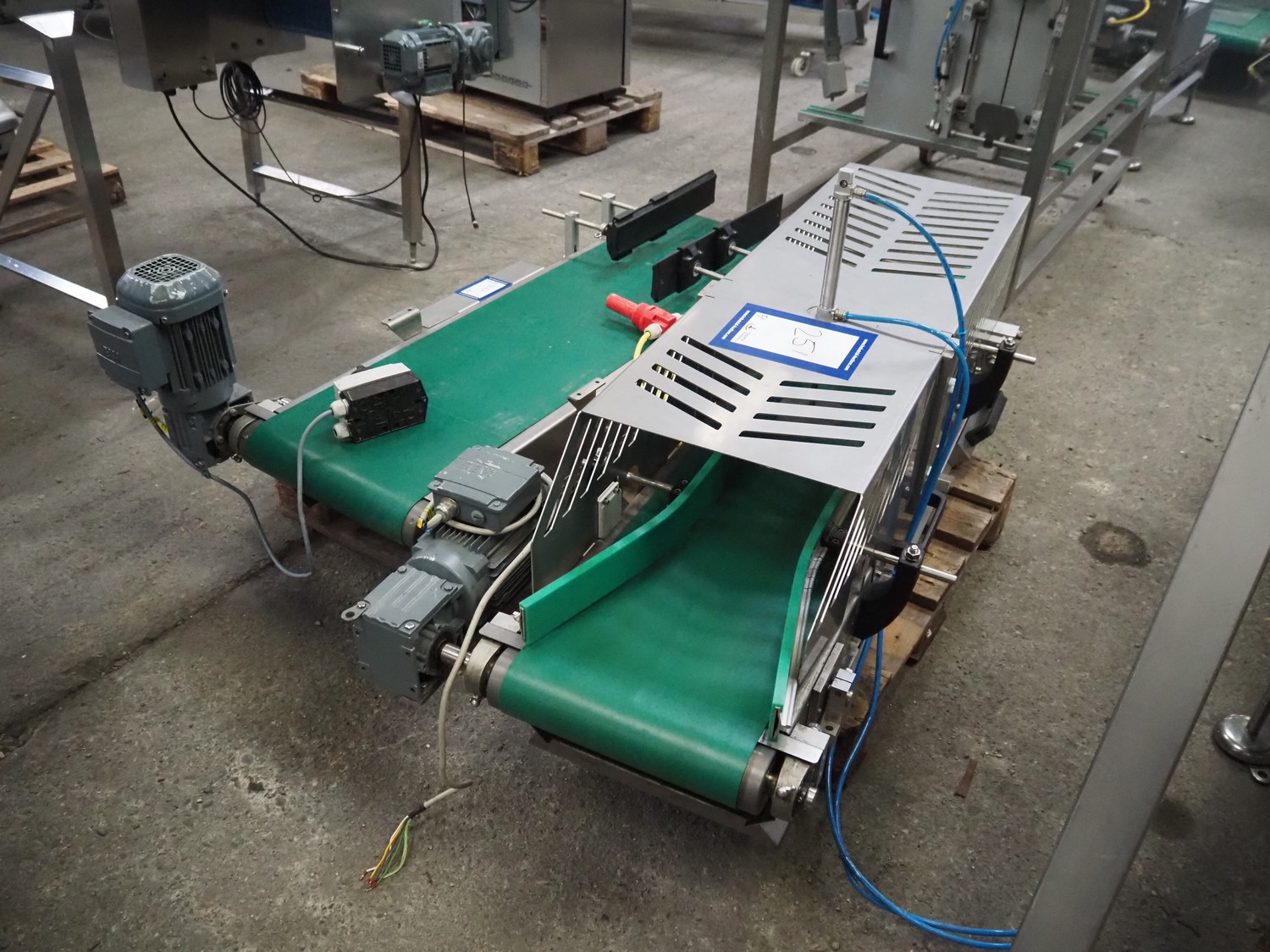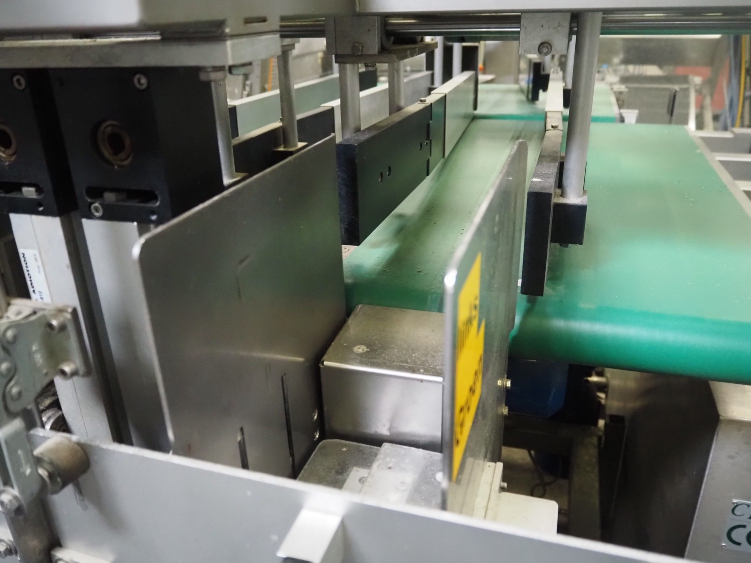 Case Packing Systems sideloader, model: SL 105, year of construction: 2006, infeed belt, s/s frame, plastic belt, belt width: 750 mm, infeed belt, dimensions: (2x) 450 mm, outfeed belt, belt width: 950 mm, total dimensions: 4800 mm x 3000 mm x 2600 mm, 90˚ roller conveyor with elevating belt, s/s frame, plastic belt, belt width: 450 mm, elevating height: 960 mm, total dimensions: 3400 mm x 850 mm x 1000 mm, 2 spare transport belts and trolley with parts.