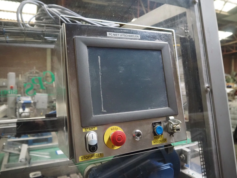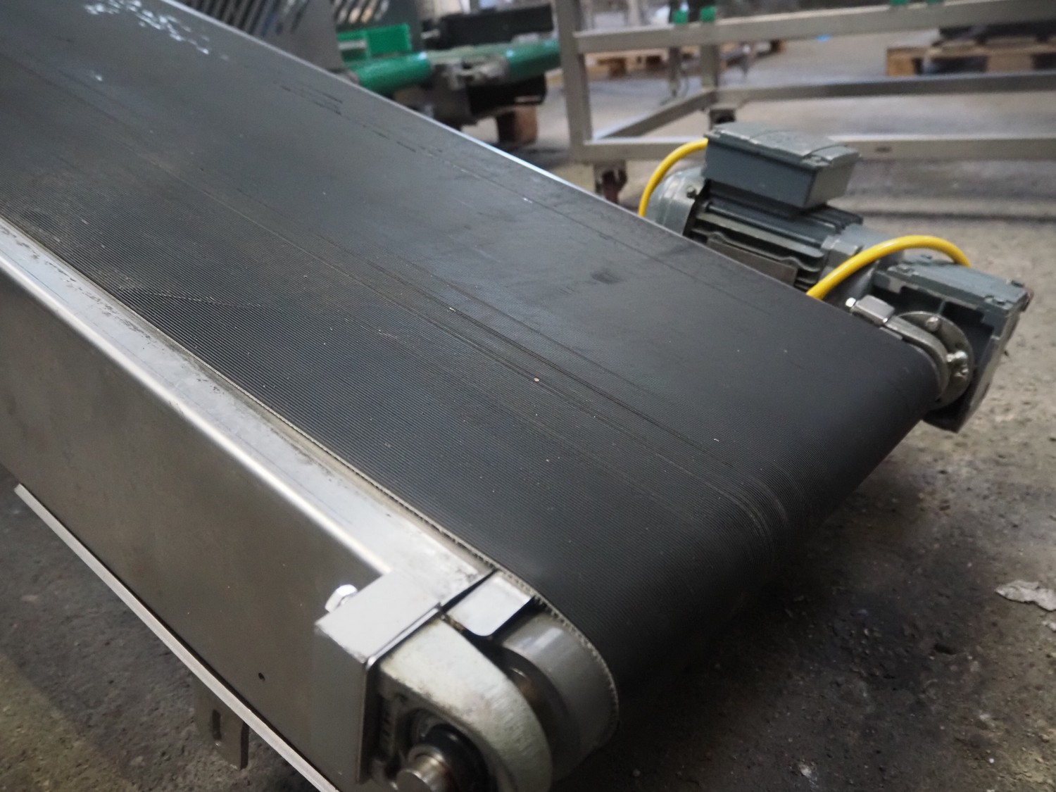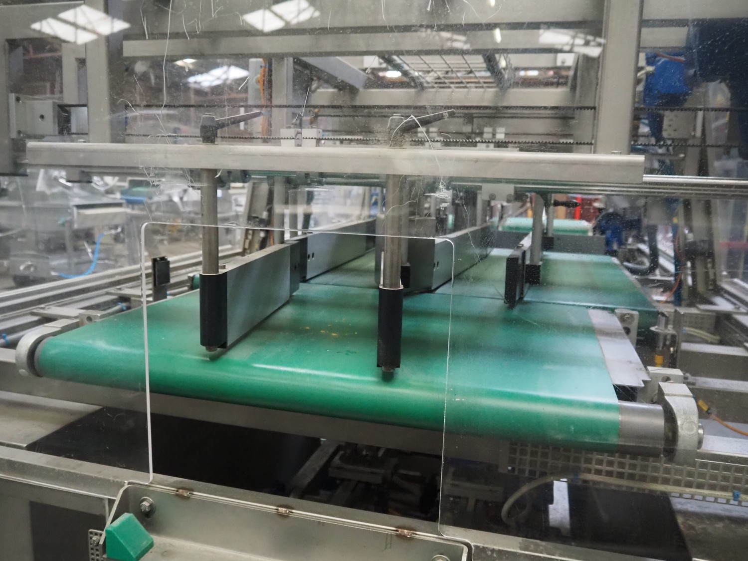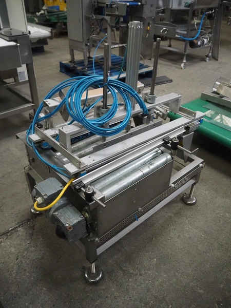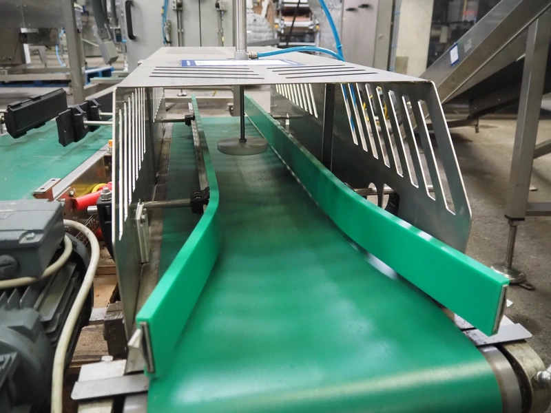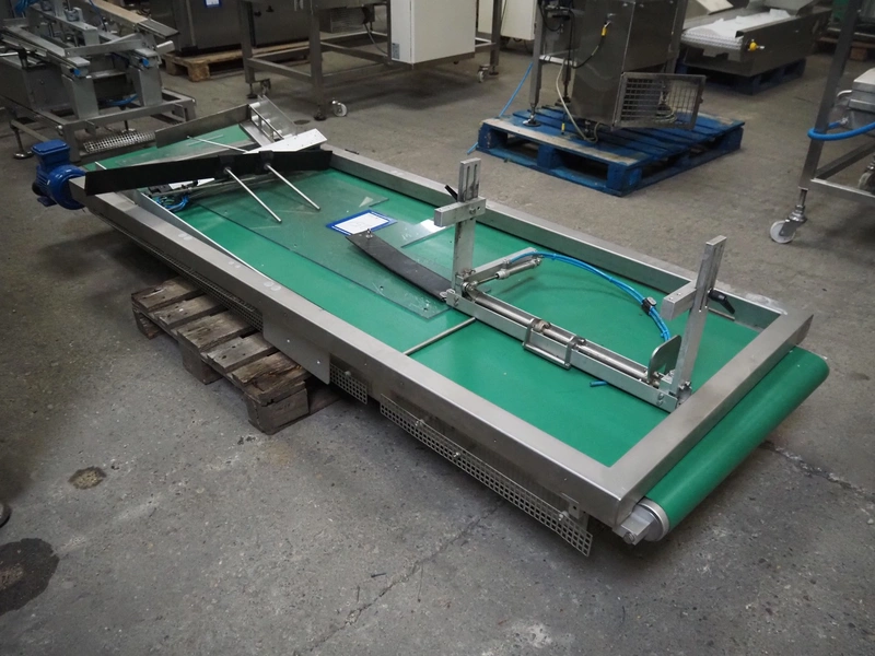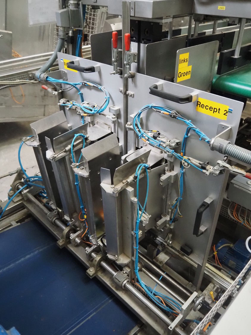 Case Packing Systems sideloader, model: SL 105, year of construction: 2006, infeed belt, s/s frame, plastic belt, belt width: 750 mm, infeed belt, dimensions: (2x) 450 mm, outfeed belt, belt width: 950 mm, total dimensions: 4800 mm x 3000 mm x 2600 mm, 90˚ roller conveyor with elevating belt, s/s frame, plastic belt, belt width: 450 mm, elevating height: 960 mm, total dimensions: 3400 mm x 850 mm x 1000 mm, 2 spare transport belts and trolley with parts.
