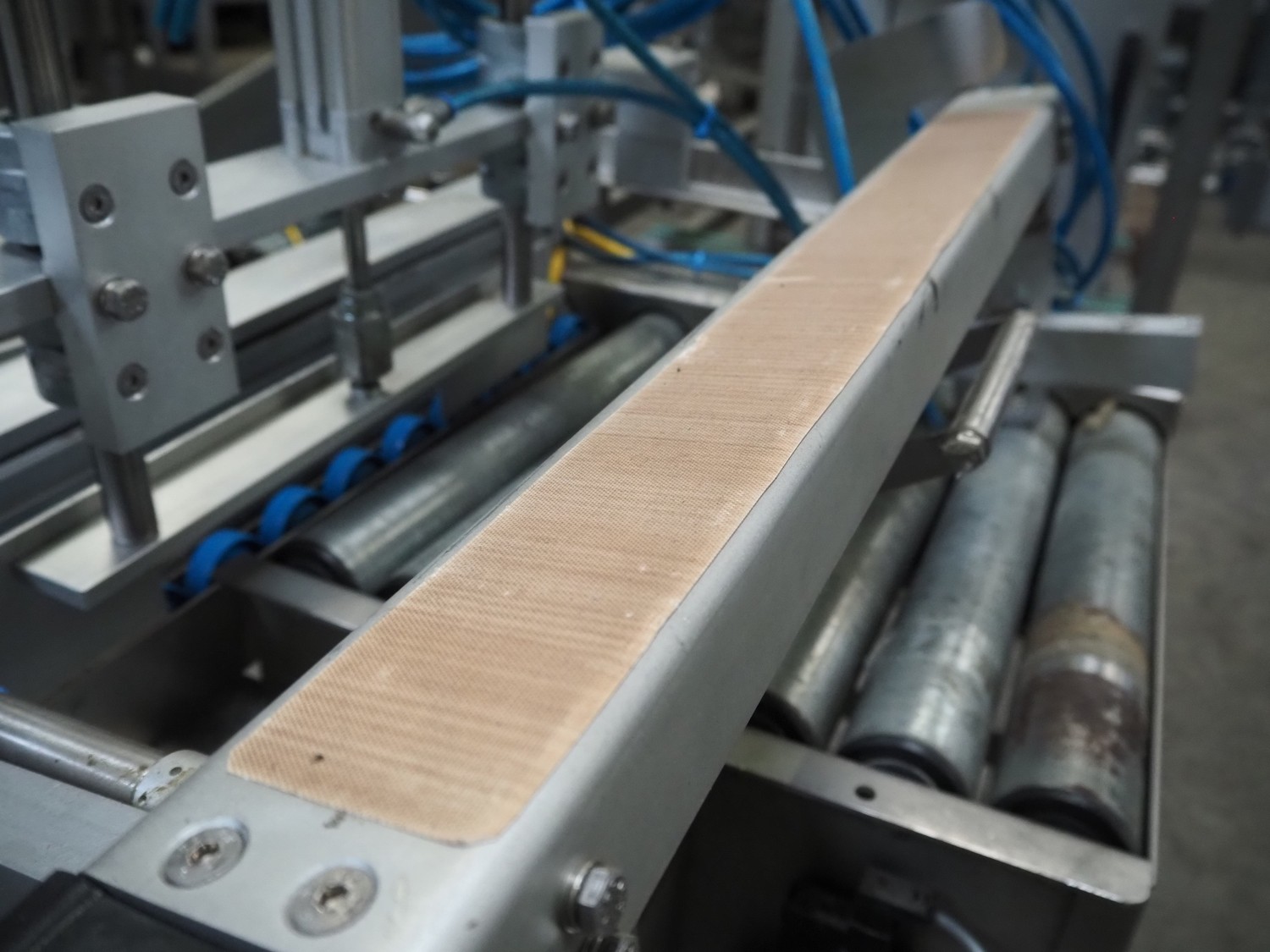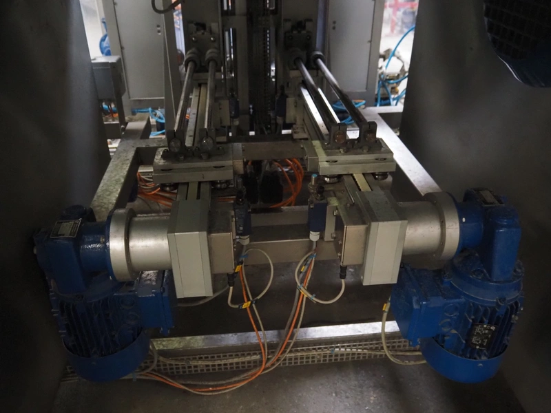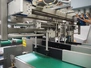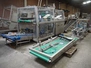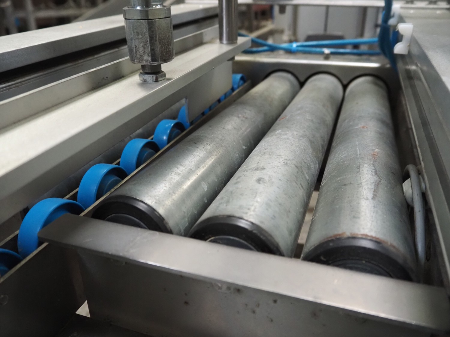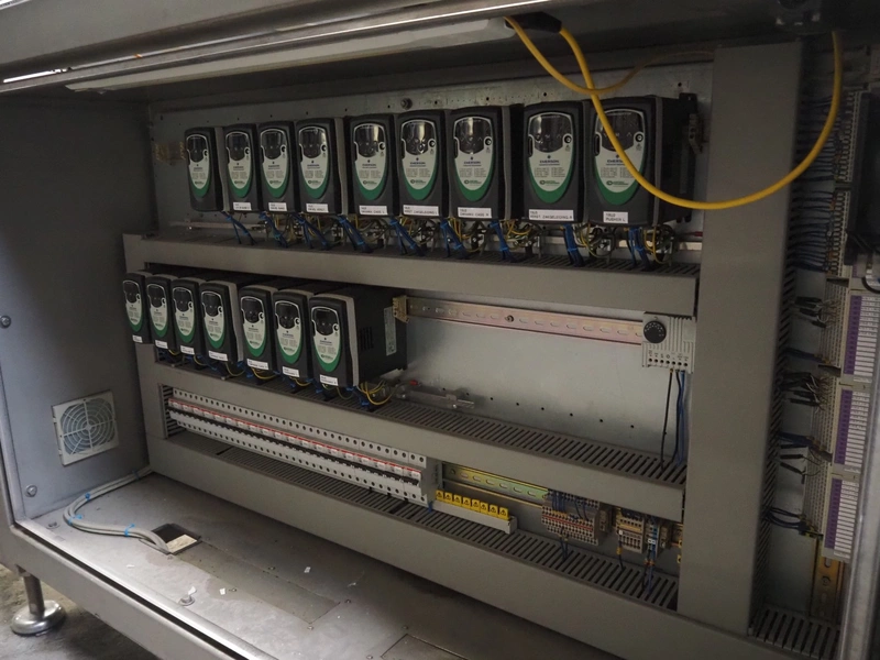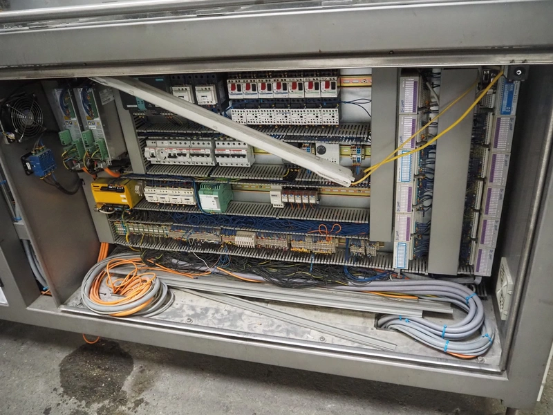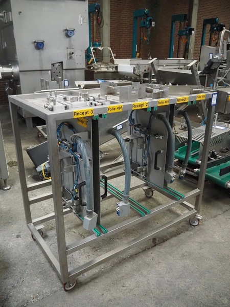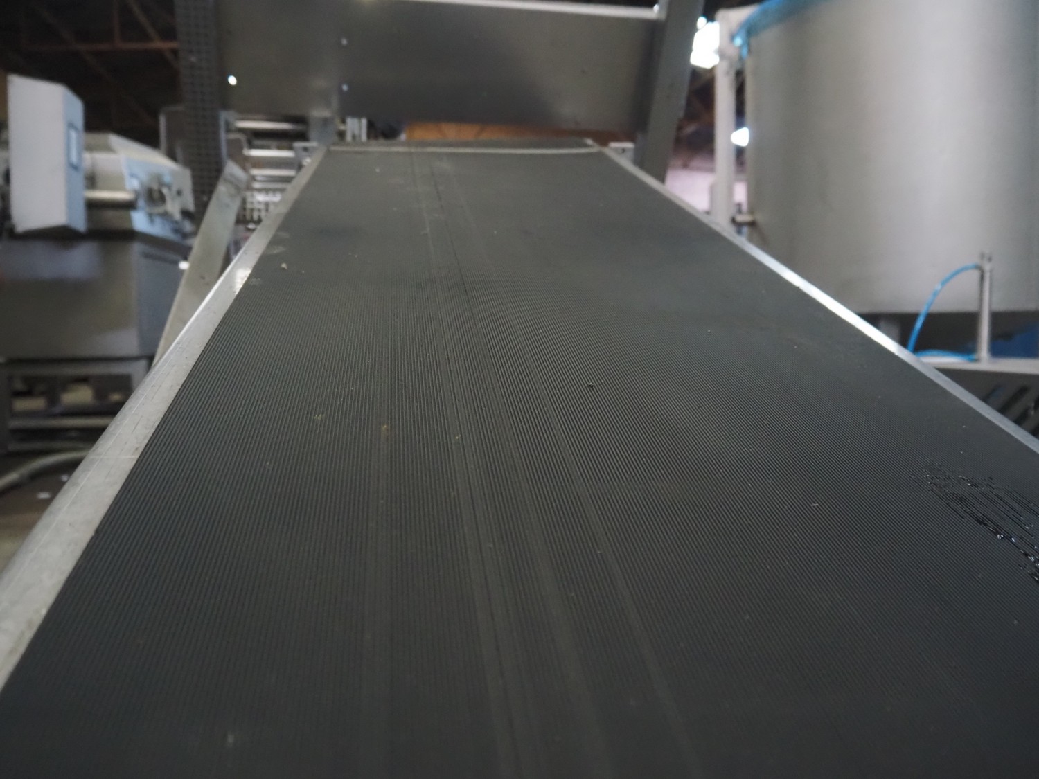 Case Packing Systems sideloader, model: SL 105, year of construction: 2006, infeed belt, s/s frame, plastic belt, belt width: 750 mm, infeed belt, dimensions: (2x) 450 mm, outfeed belt, belt width: 950 mm, total dimensions: 4800 mm x 3000 mm x 2600 mm, 90˚ roller conveyor with elevating belt, s/s frame, plastic belt, belt width: 450 mm, elevating height: 960 mm, total dimensions: 3400 mm x 850 mm x 1000 mm, 2 spare transport belts and trolley with parts.