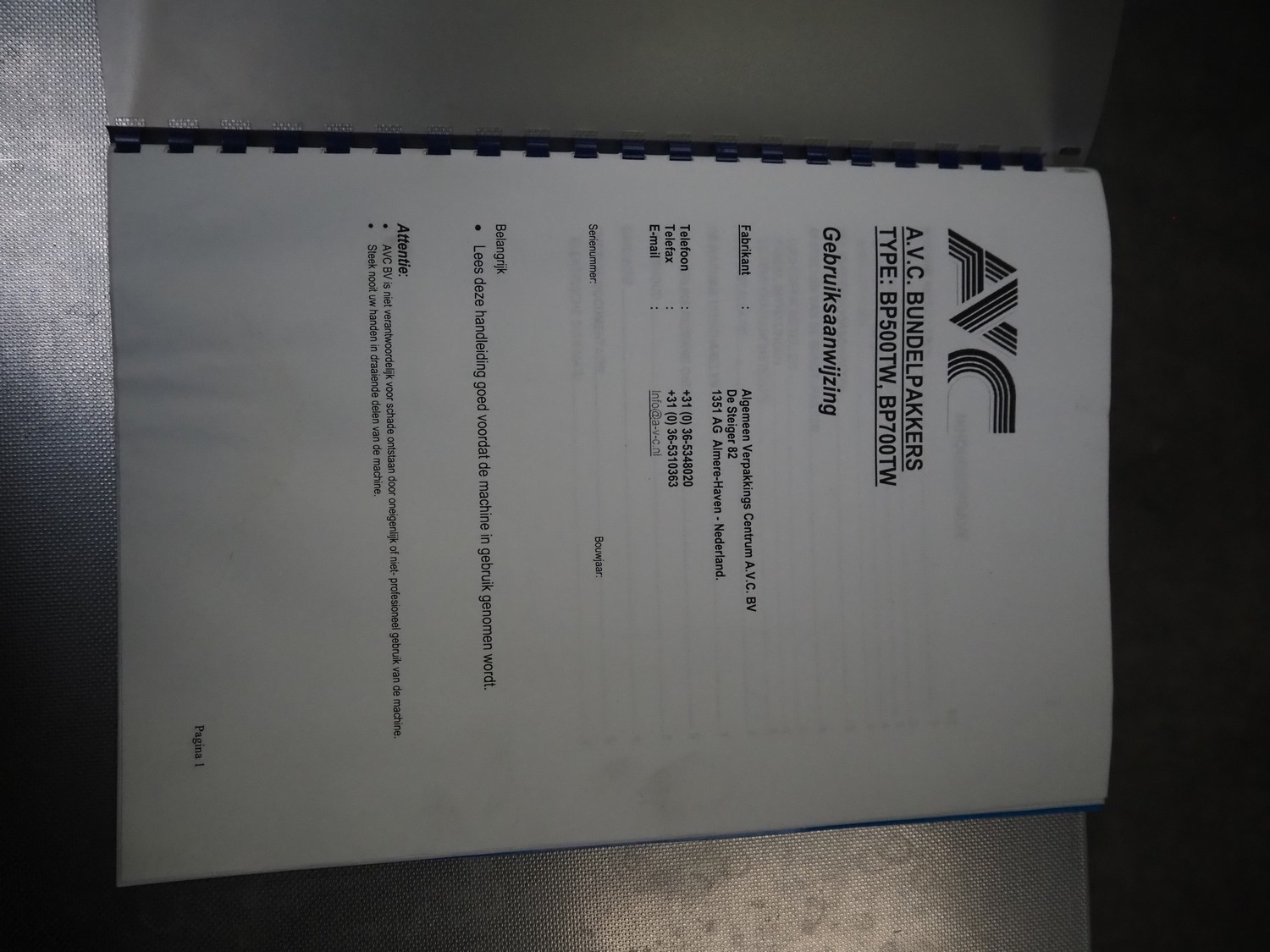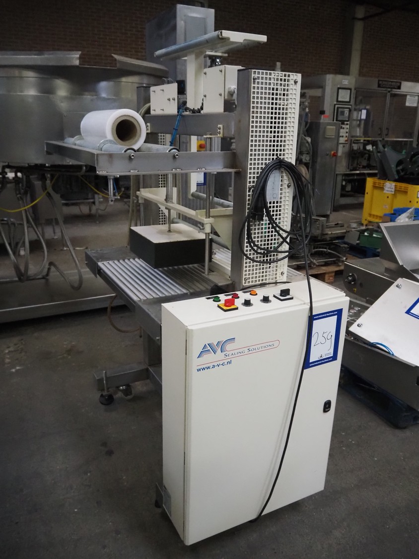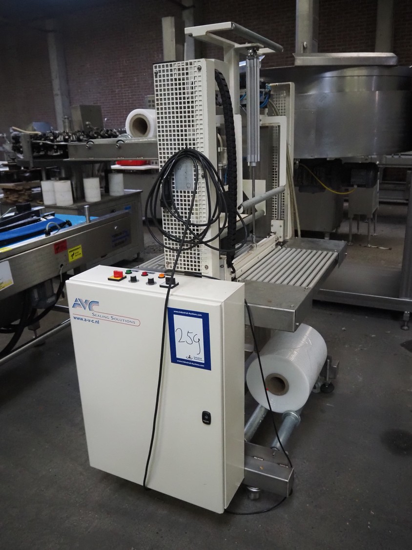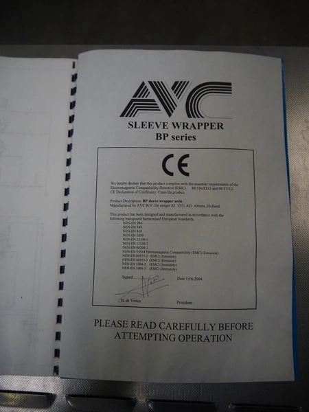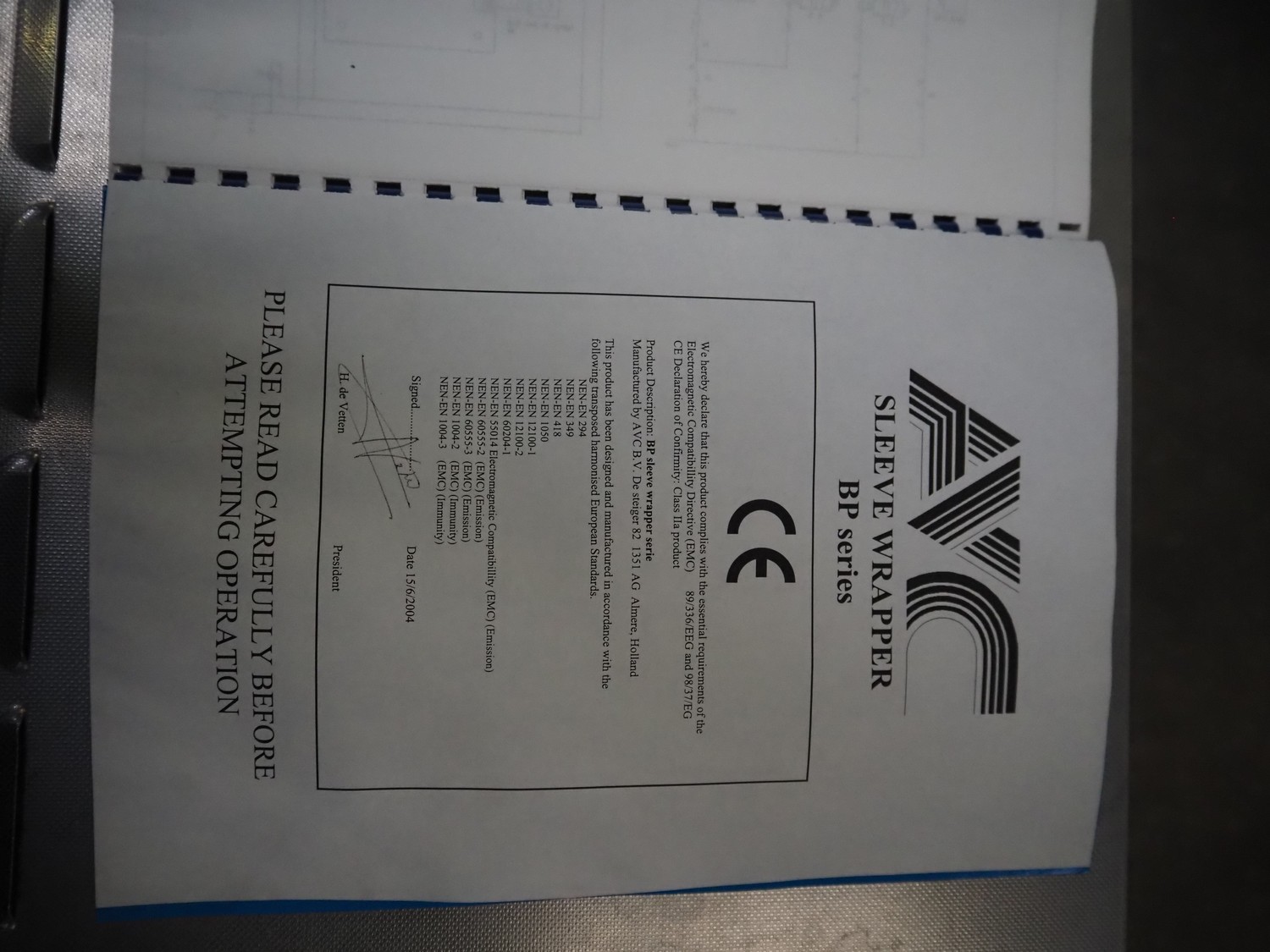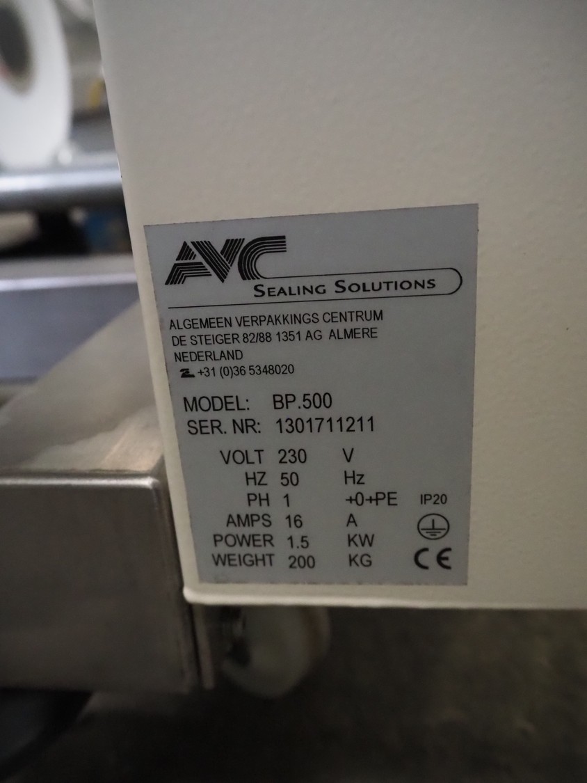 AVC mobile sleeve wrapper, model: BP.500, serial number: 1301711211, 230 V, 1 Ph, 50 Hz, 16 A, 1.5 kW, weight: 200 kg, aluminium rollers, roller width: 520 mm, total dimensions: 1230 mm x 950 mm x 1800 mm.