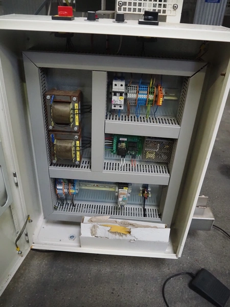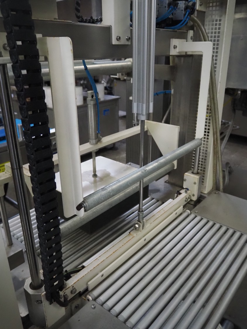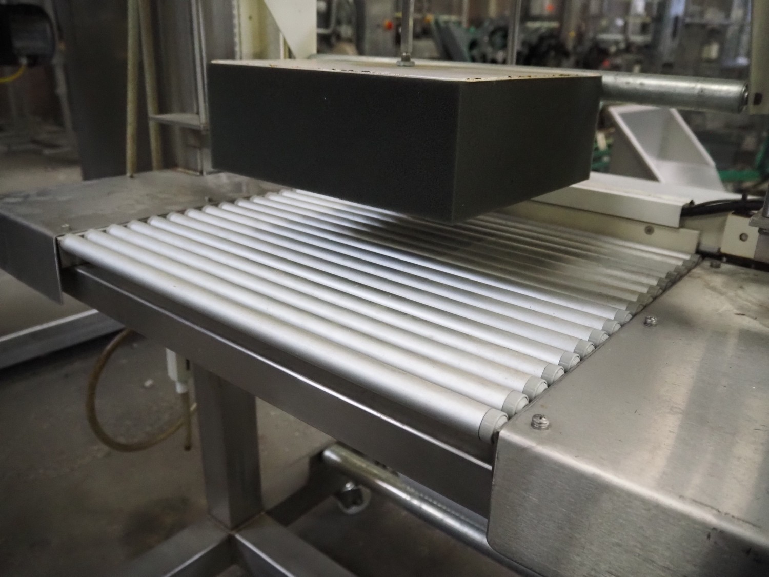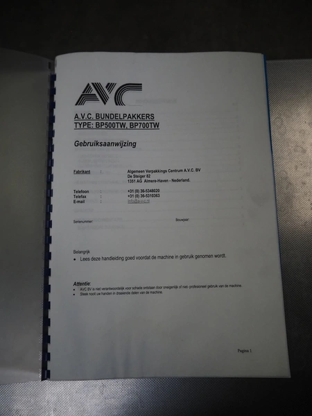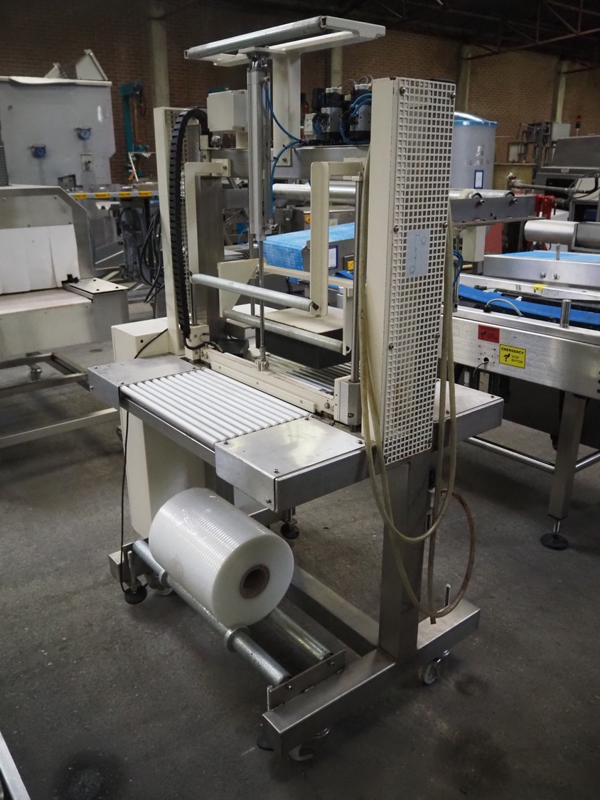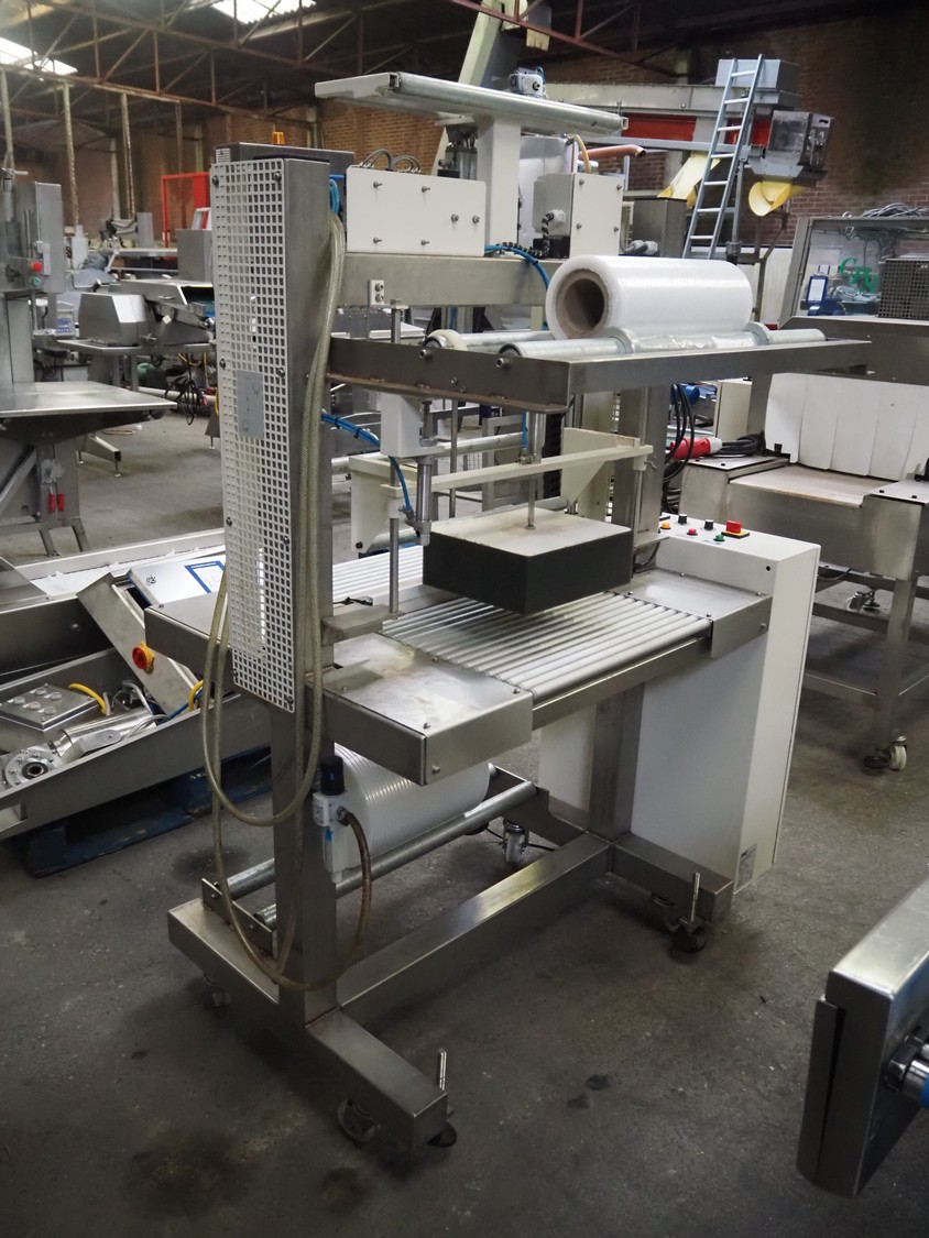 AVC mobile sleeve wrapper, model: BP.500, serial number: 1301711211, 230 V, 1 Ph, 50 Hz, 16 A, 1.5 kW, weight: 200 kg, aluminium rollers, roller width: 520 mm, total dimensions: 1230 mm x 950 mm x 1800 mm.