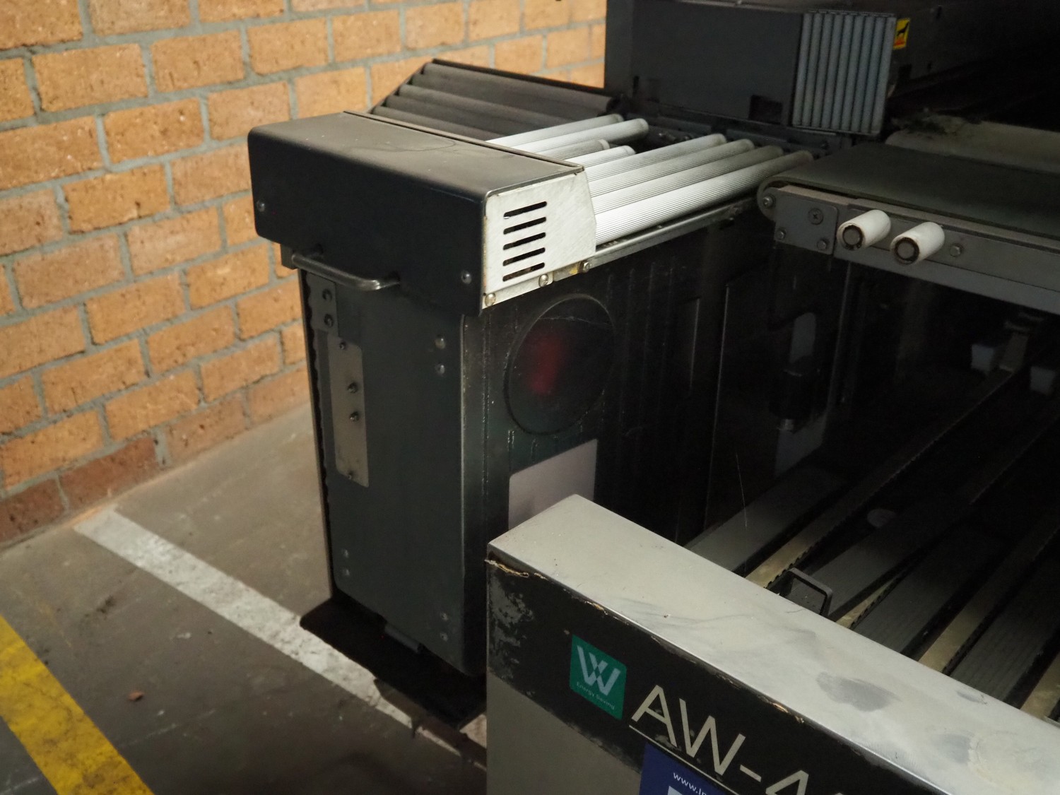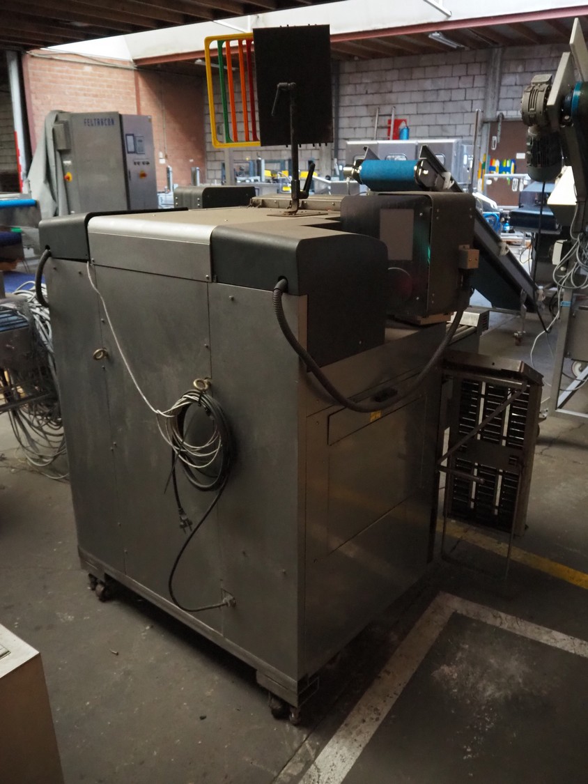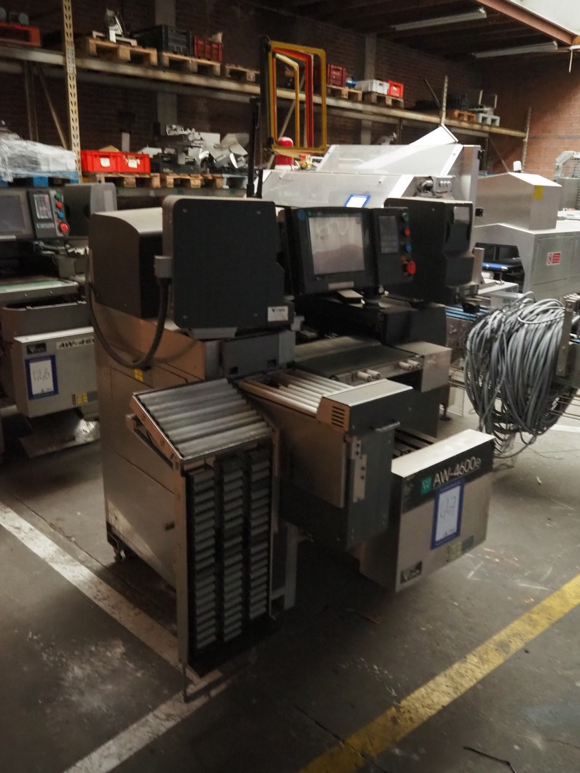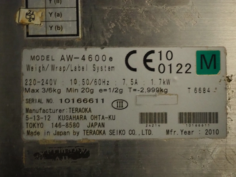 Teraoka Seiko Co., LTD automatic weigh/wrap/label system, model: AW-4600e, serial number: 10166611, year of construction: 2010, 220-240 V, 1 Ph, 50 Hz, 7.5 A, 1.7 kW, maximum weight: 3/6 kg, minimum weight: 20 gram, e=1/2 gram, T=2.999 kg, plastic belts, belt width: 400 mm and 150 mm, total dimensions: 1350 mm x 1250 mm x 1500 mm.