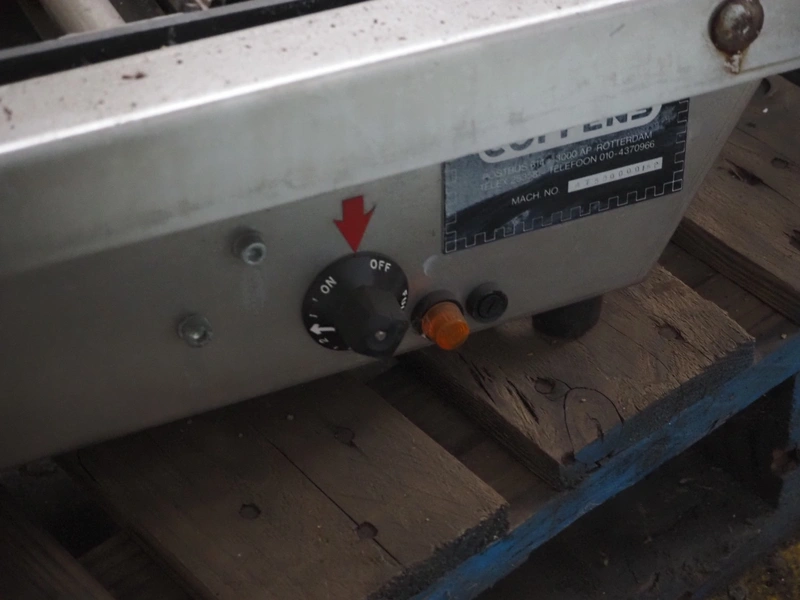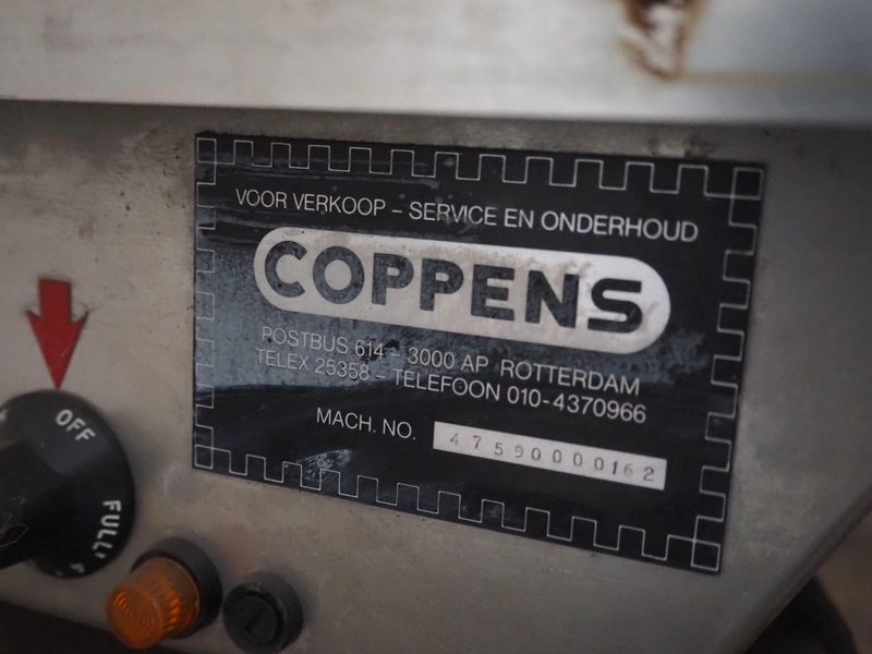 Coppens packaging machine, machine number: 47590000162, dimensions dye: 215 mm x 145 mm, total dimensions: 770 mm x 400 mm x 250 mm.