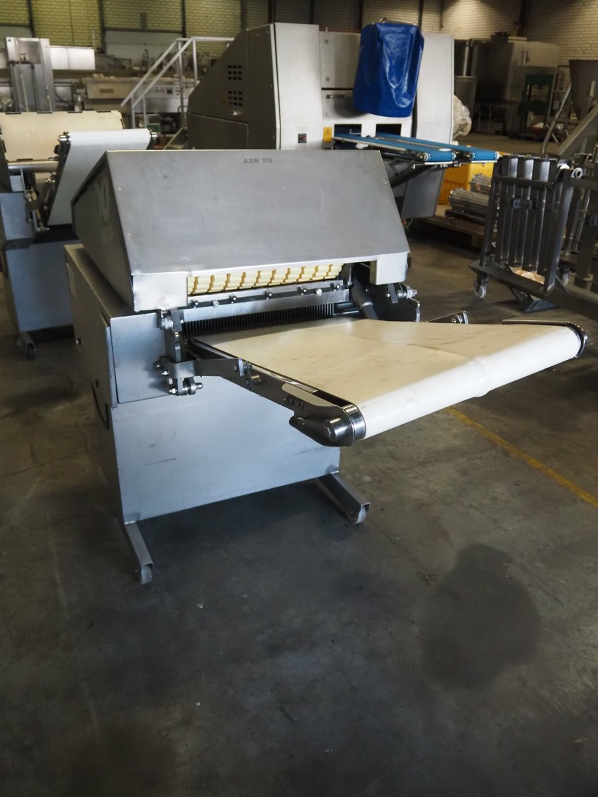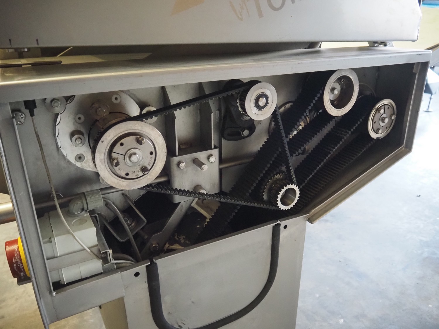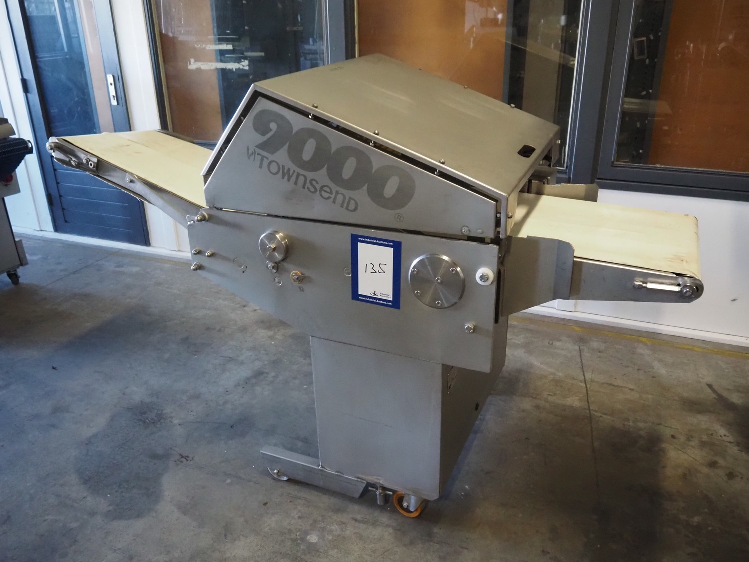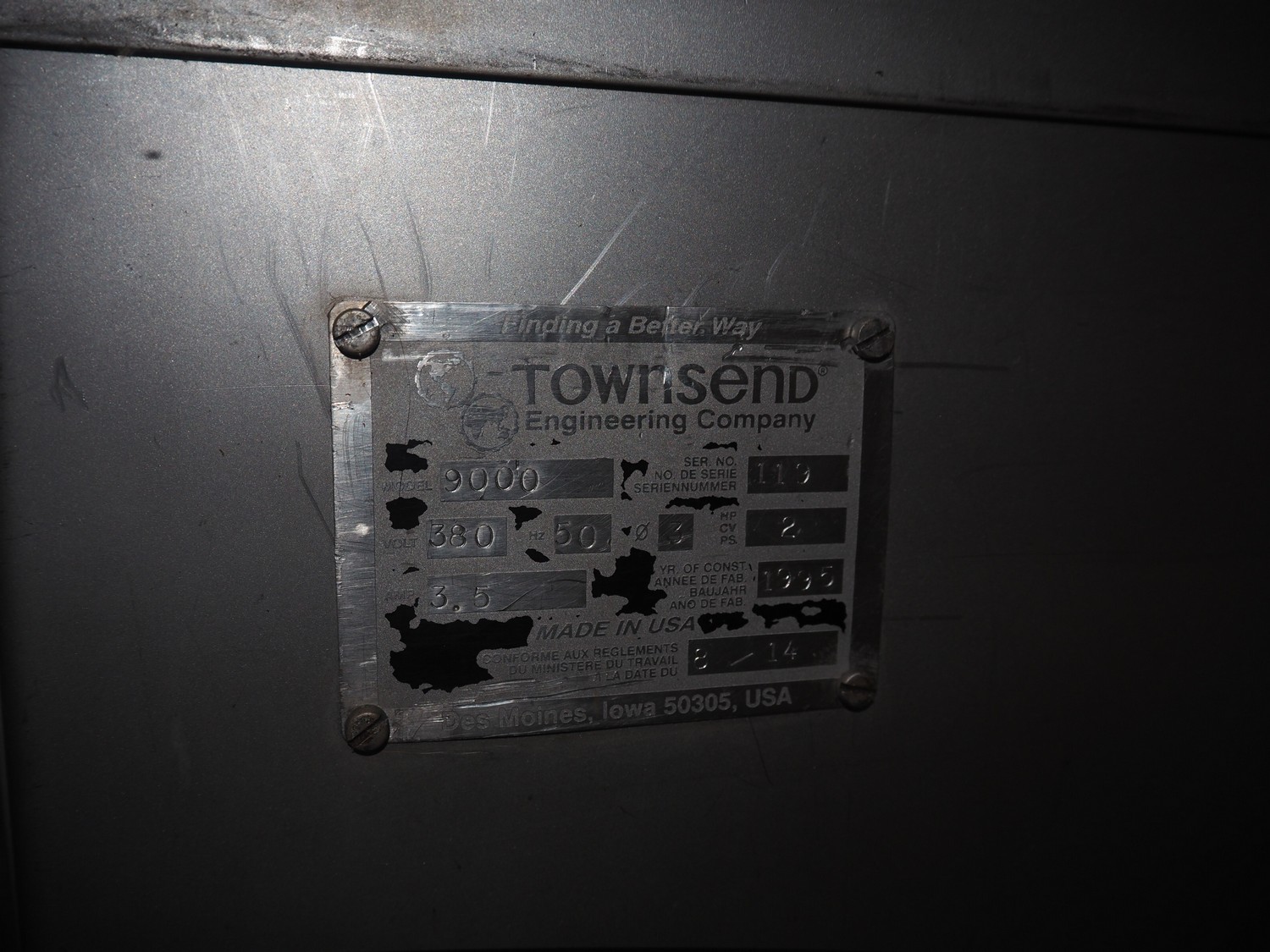 Townsend mobile skinning and derinding machine, model: 9000, serial number: 119, year of construction: 1995, 380 V, 3 Ph, 50 Hz, 3.5 A, belt width: 510 mm, working width: 510 mm, total dimensions: 2100 mm x 900 mm x 1330 mm. Outfeed belt is broken.