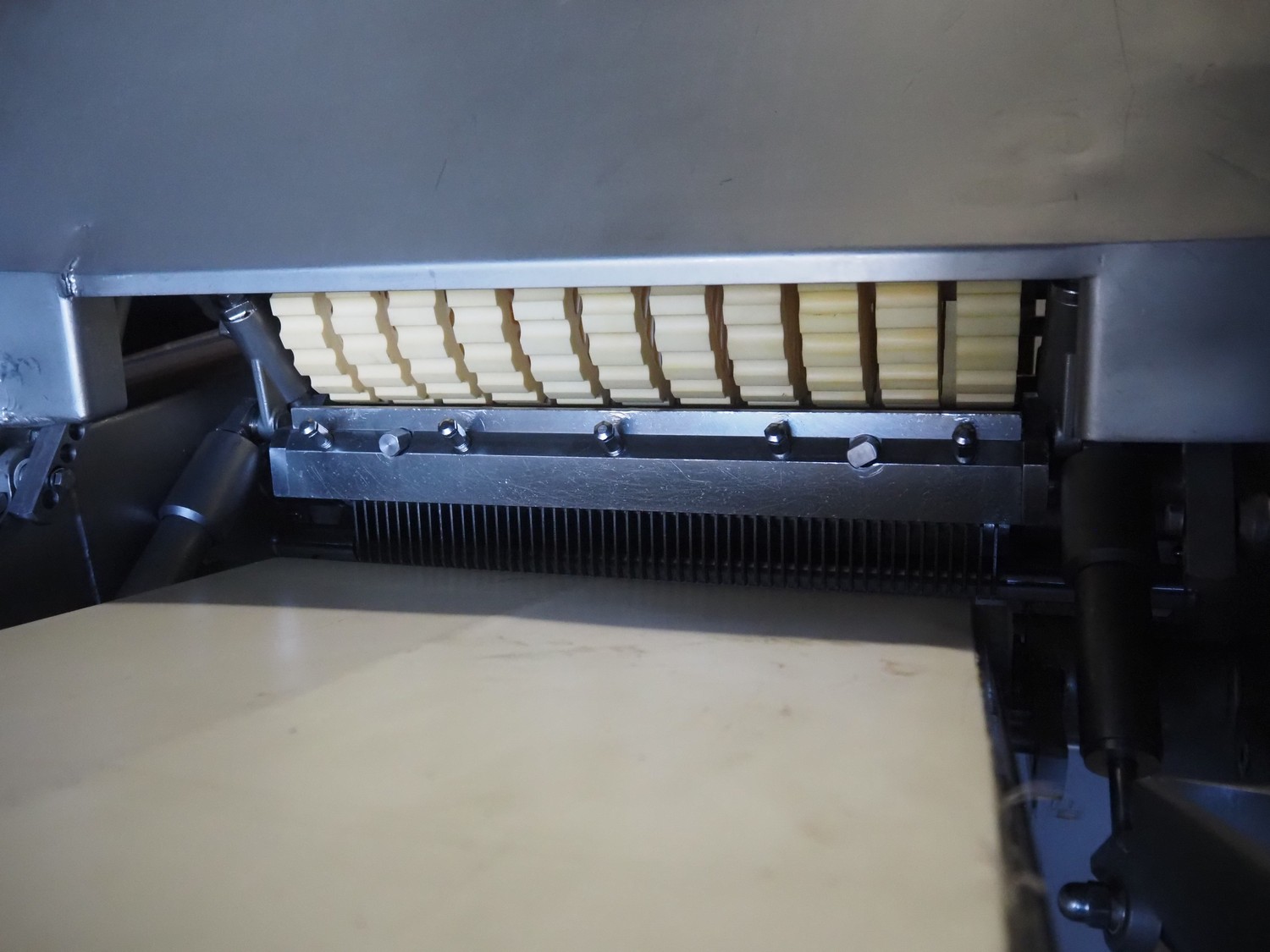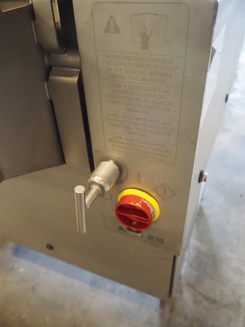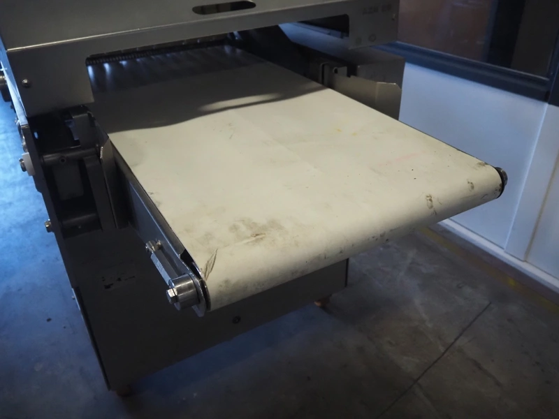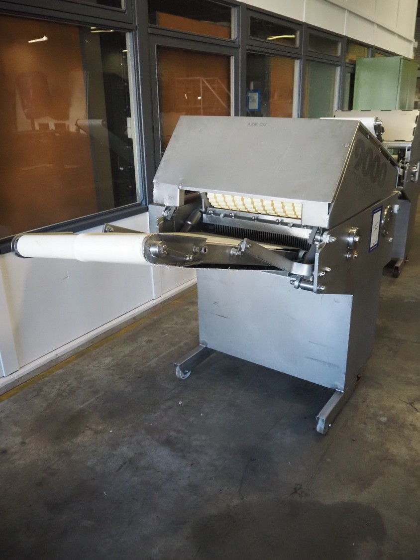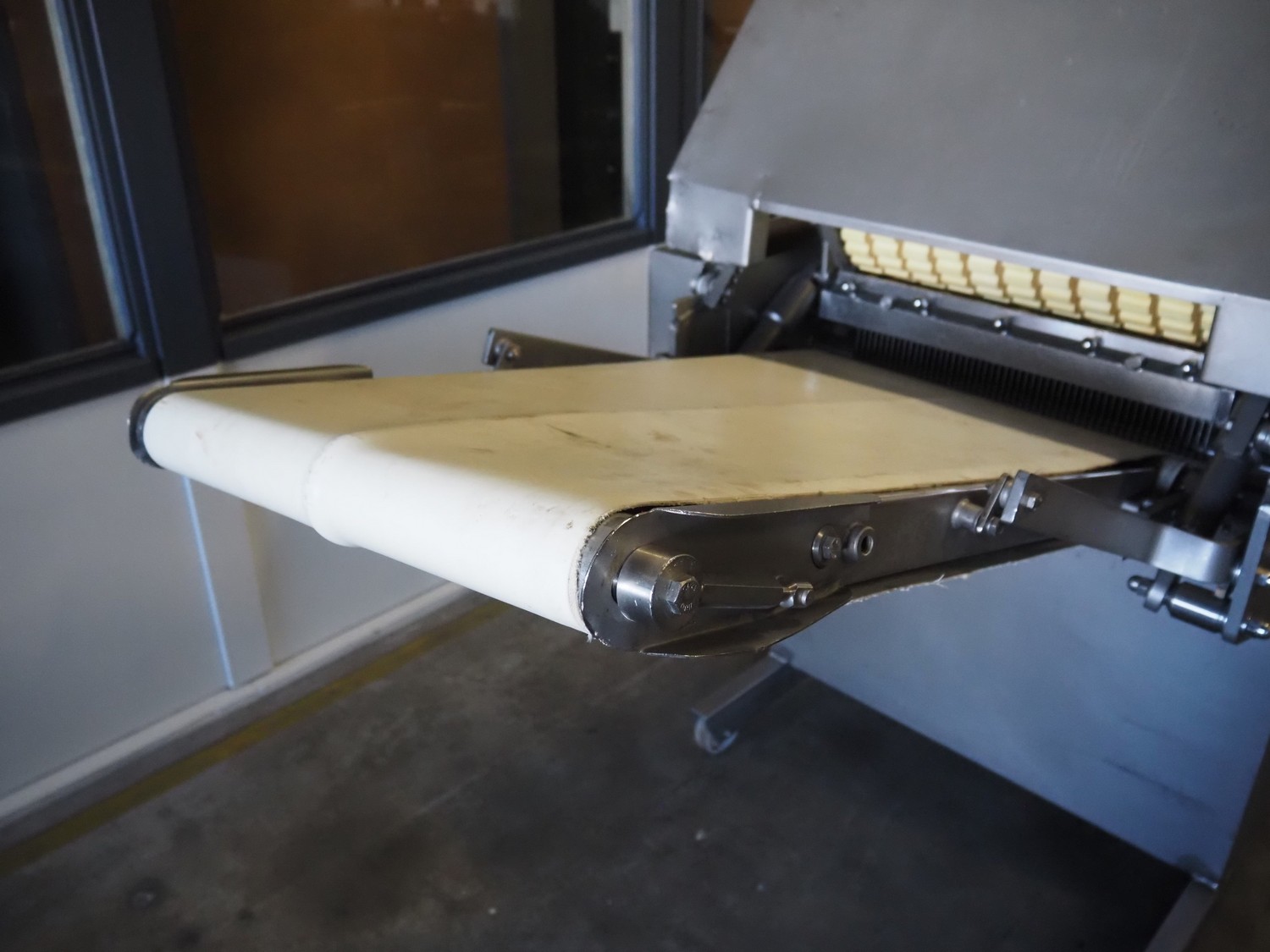 Townsend mobile skinning and derinding machine, model: 9000, serial number: 119, year of construction: 1995, 380 V, 3 Ph, 50 Hz, 3.5 A, belt width: 510 mm, working width: 510 mm, total dimensions: 2100 mm x 900 mm x 1330 mm. Outfeed belt is broken.