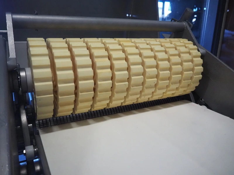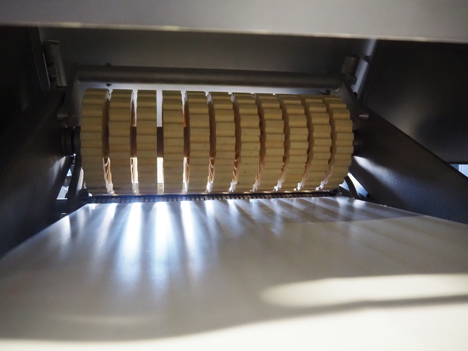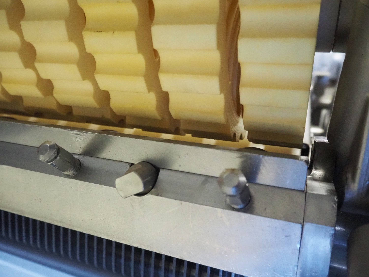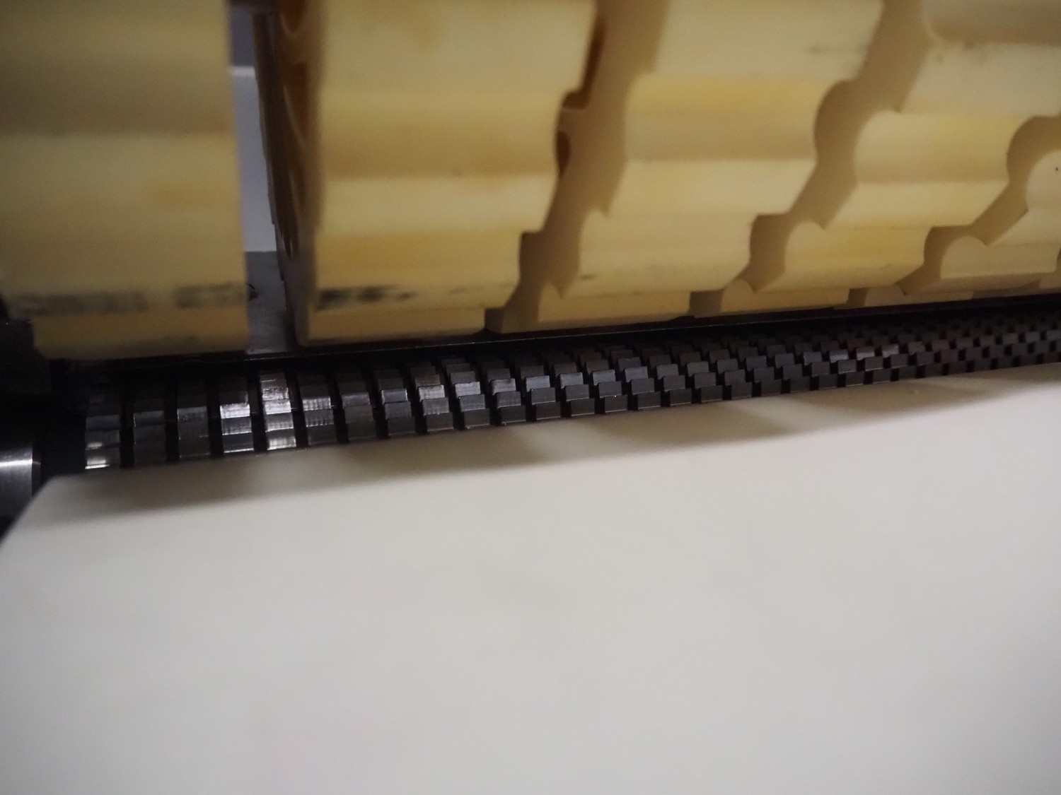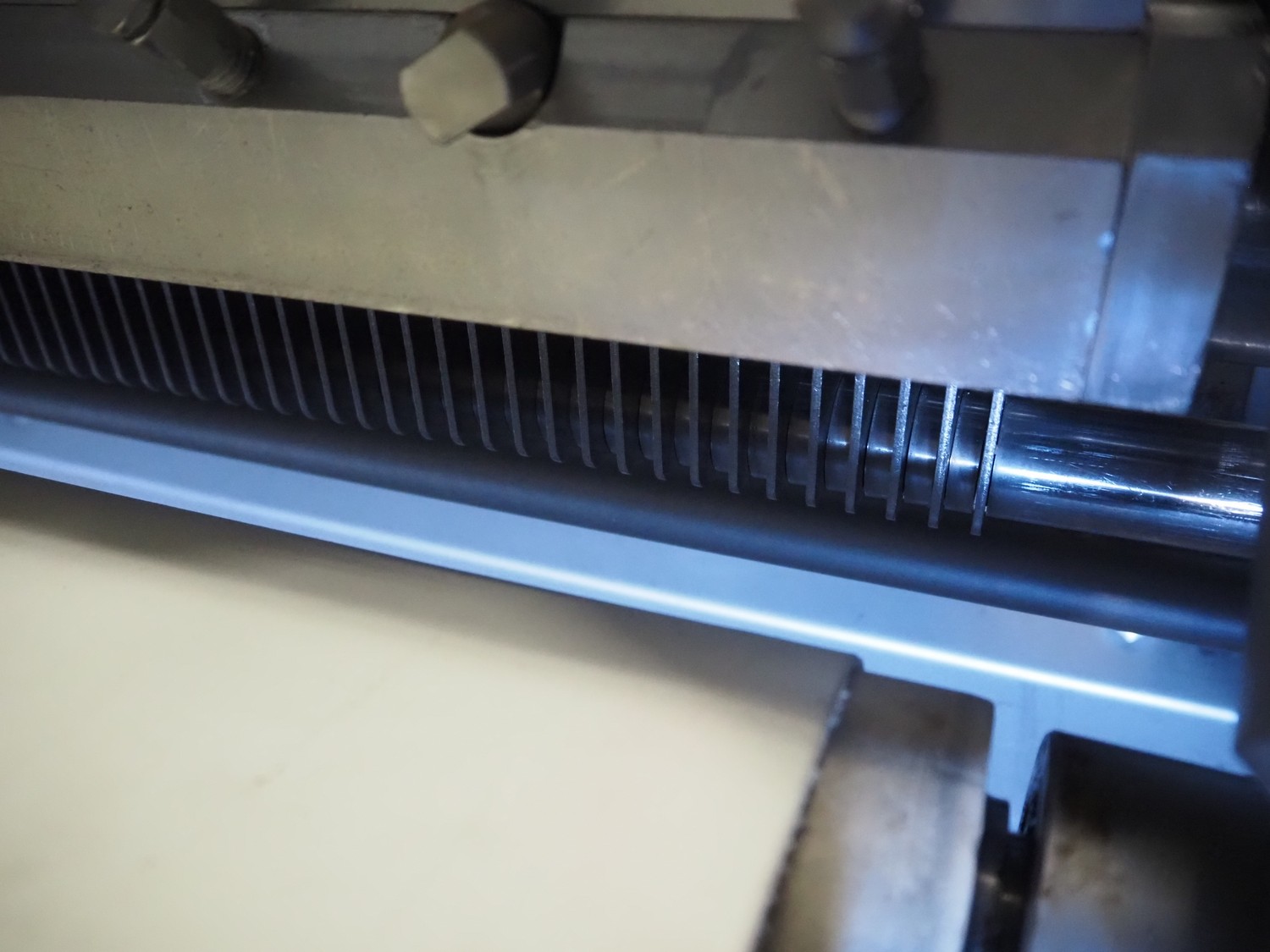 Townsend mobile skinning and derinding machine, model: 9000, serial number: 119, year of construction: 1995, 380 V, 3 Ph, 50 Hz, 3.5 A, belt width: 510 mm, working width: 510 mm, total dimensions: 2100 mm x 900 mm x 1330 mm. Outfeed belt is broken.