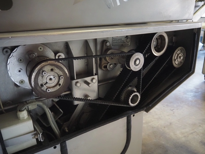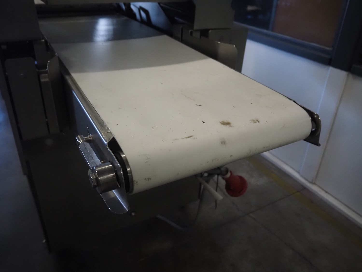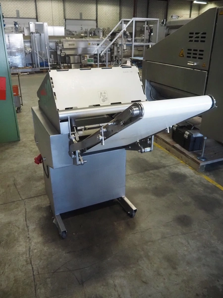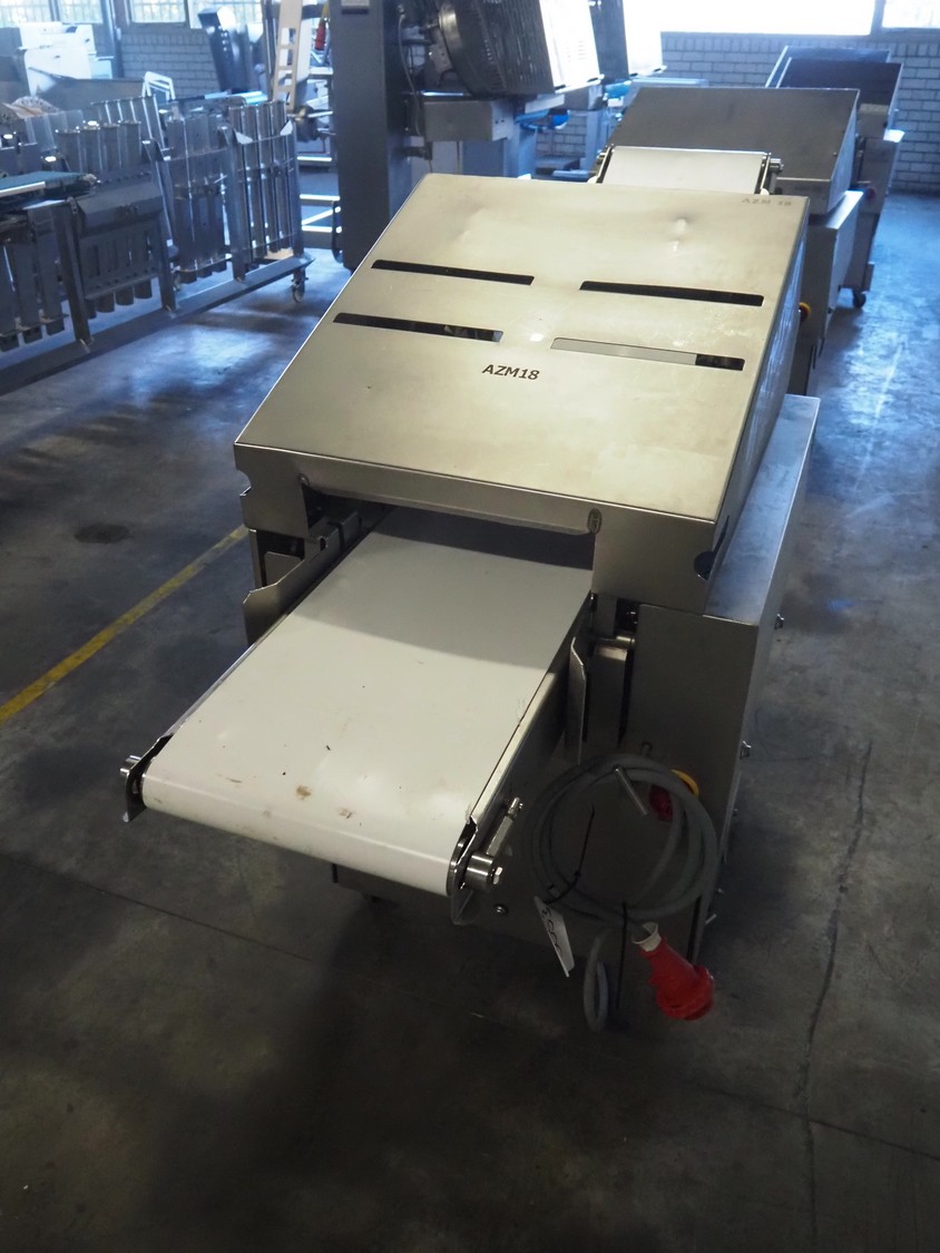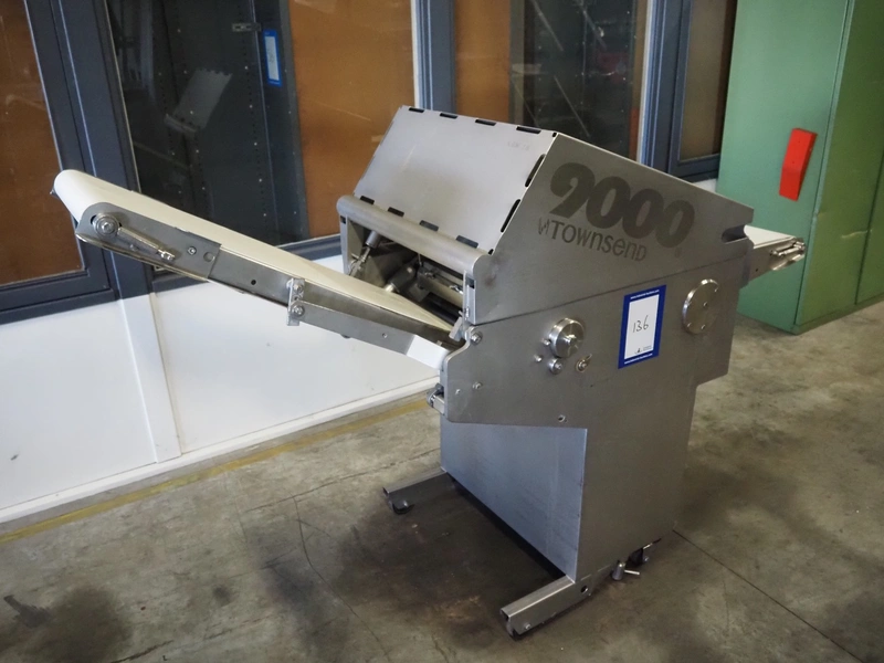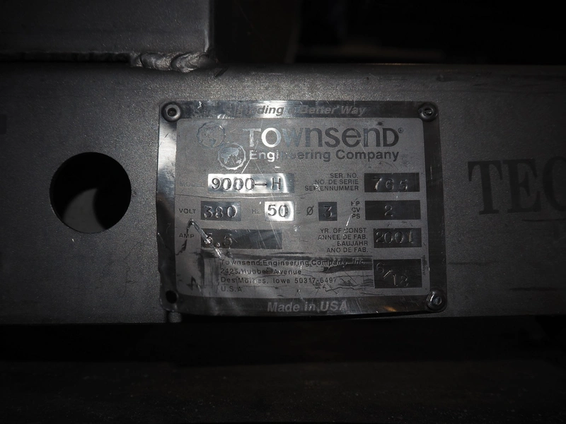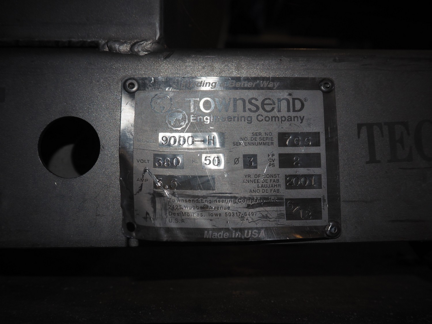 Townsend mobile skinning and derinding machine, model: 9000-H, serial number: 765, year of construction: 2001, 380 V, 3 Ph, 50 Hz, 3.5 A, belt width: 350 mm, working width: 350 mm, total dimensions: 2000 mm x 750 mm x 1350 mm. Incomplete.