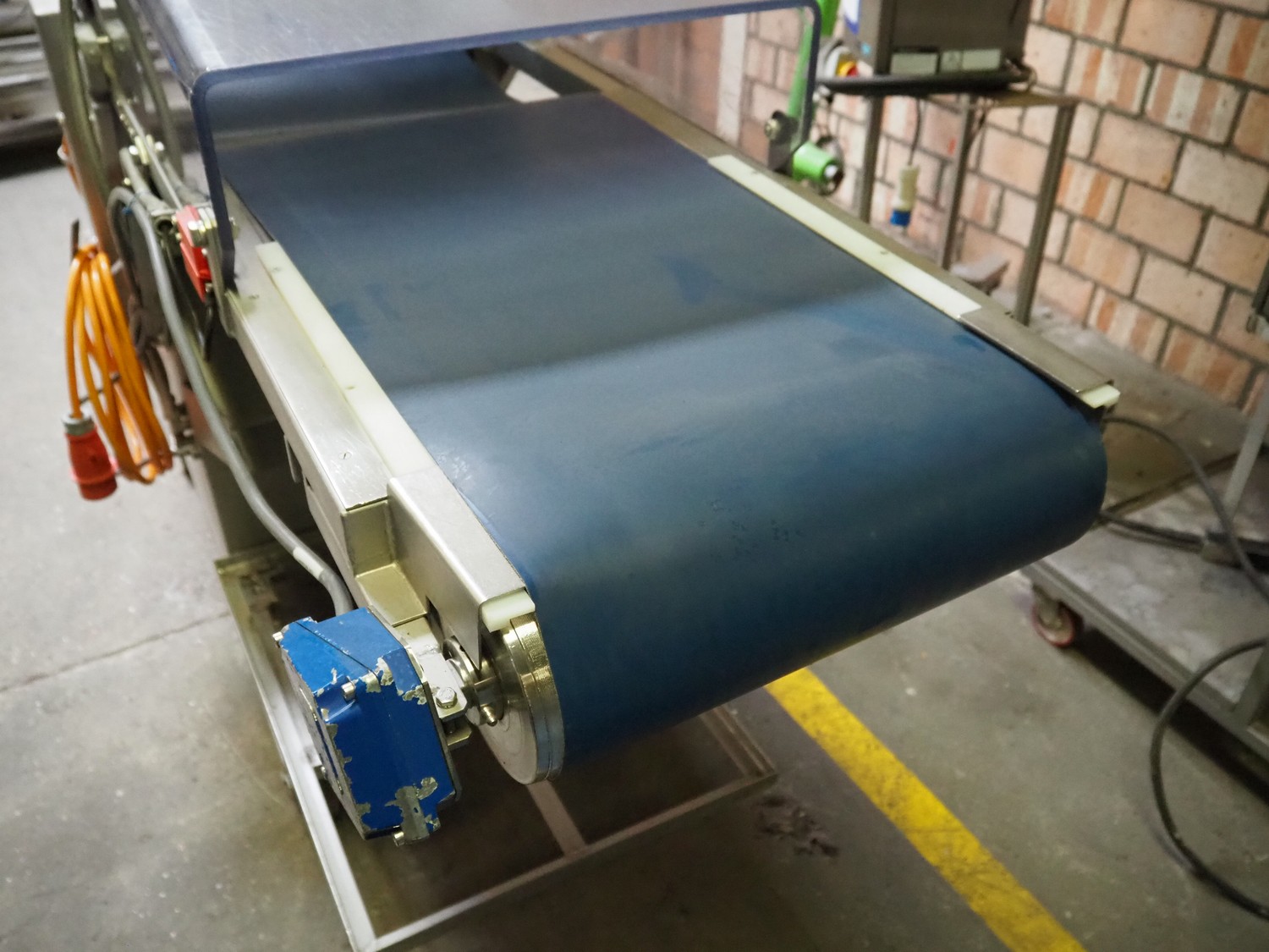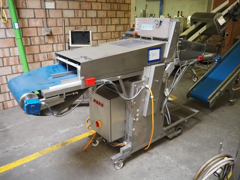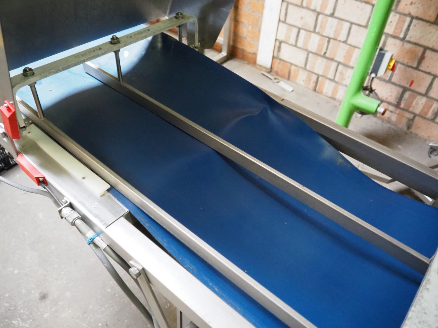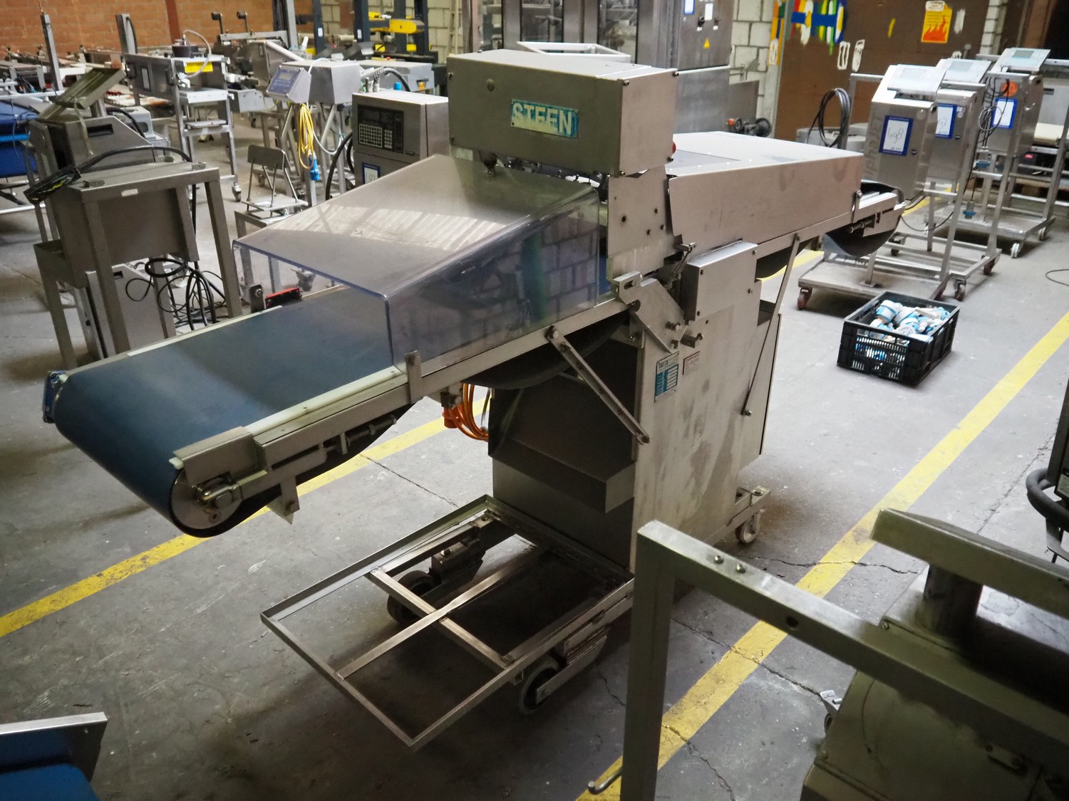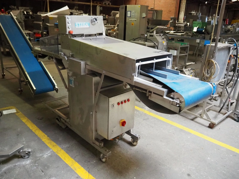 Steen mobile skinning machine, type: ST600/K, serial number: 247100393A, 380 V, 50 Hz, 1200 W, 3.2 A, plastic belt, belt width: 430 mm, total dimensions: 2750 mm x 650 mm x 1600 mm. Incomplete.
