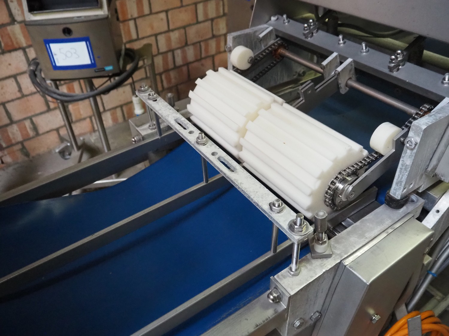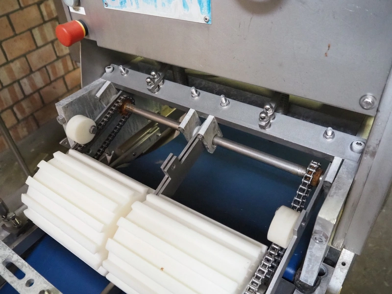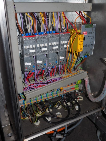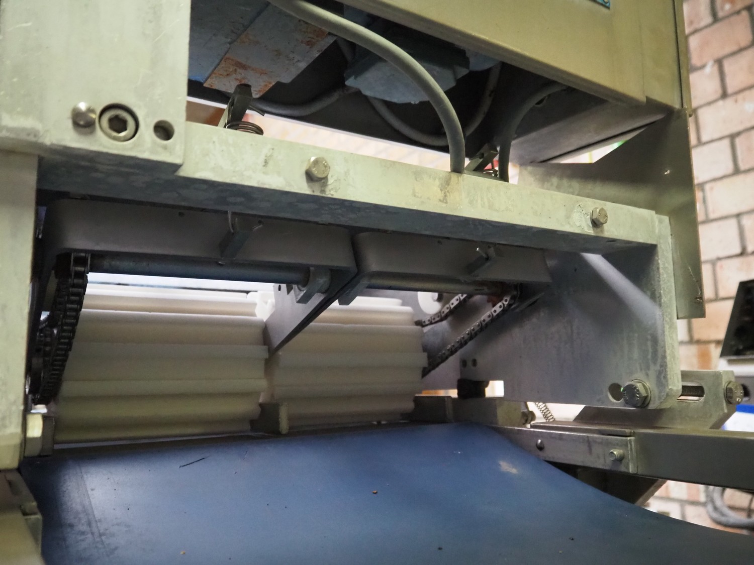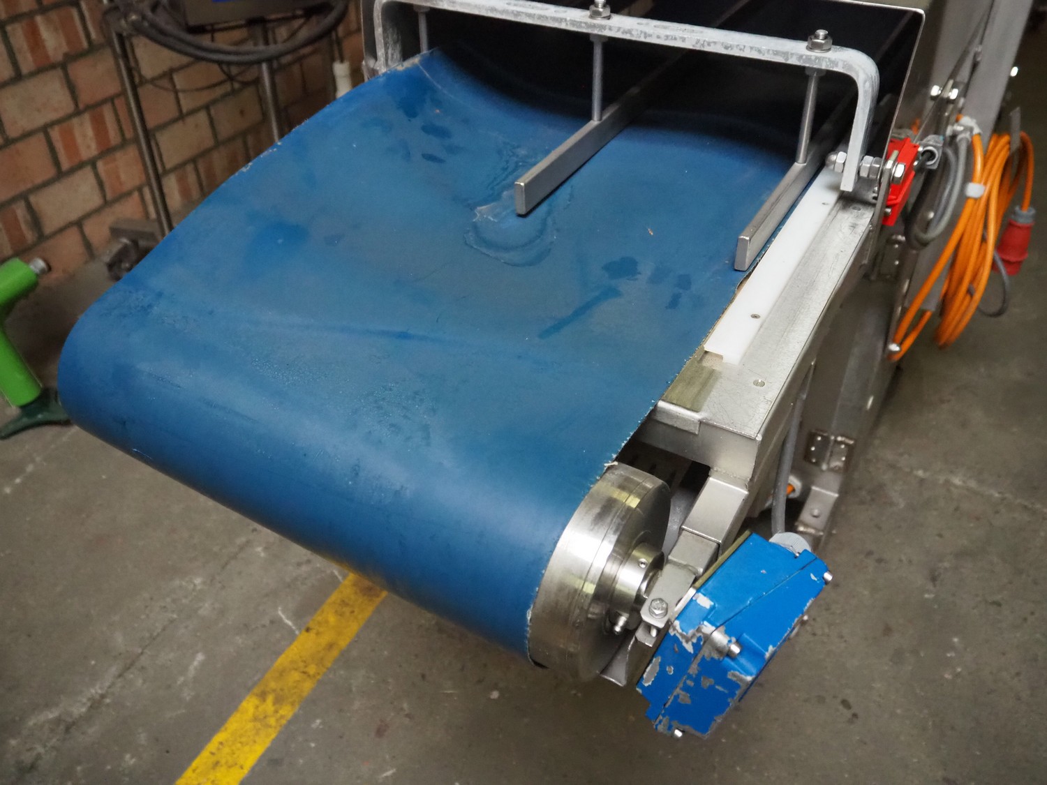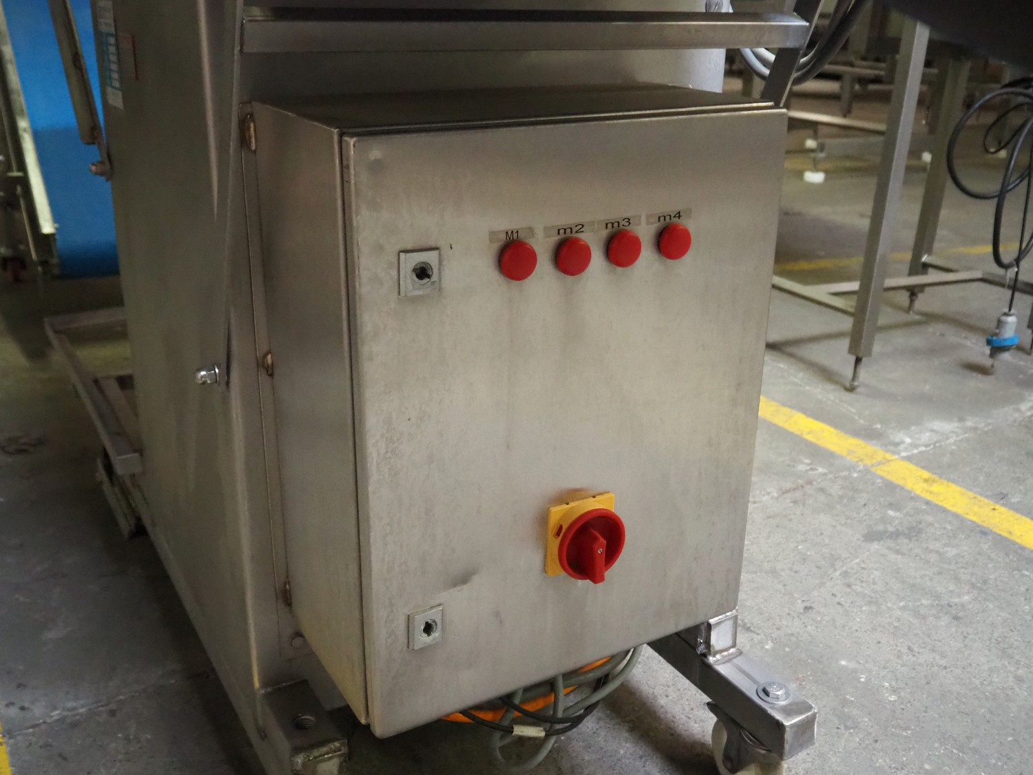 Steen mobile skinning machine, type: ST600/K, serial number: 247100393A, 380 V, 50 Hz, 1200 W, 3.2 A, plastic belt, belt width: 430 mm, total dimensions: 2750 mm x 650 mm x 1600 mm. Incomplete.