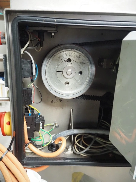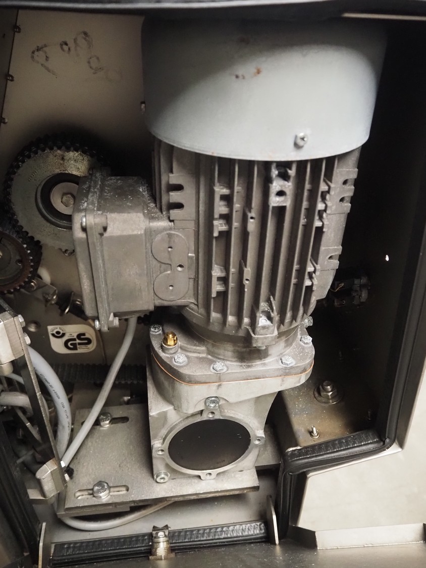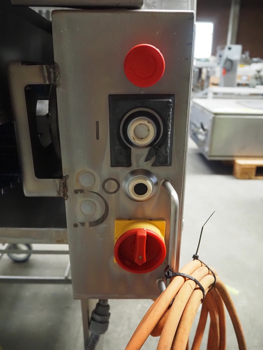 Marel Inc mobile skinning and derinding machine, model: SK 15-350 INCH, type: 9833263, serial number: 10398701, year of construction: 2017, 400 V, 3 Ph, 50 Hz, 3.5 A, 5 kA, weight: 356 kg, plastic mesh belt, belt width: 350 mm, working width: 360 mm, total dimensions: 2100 mm x 900 mm x 1240 mm. Incomplete.