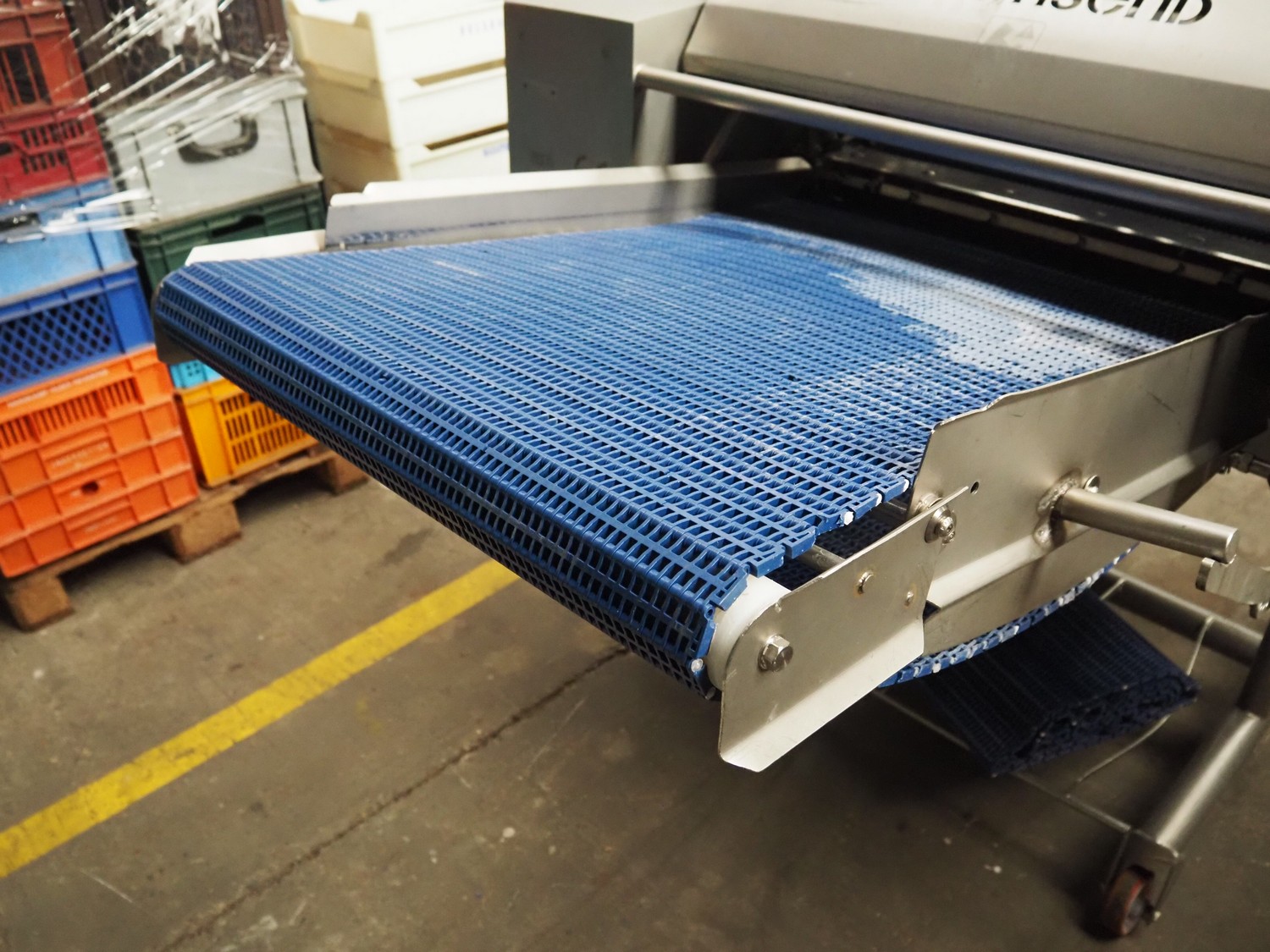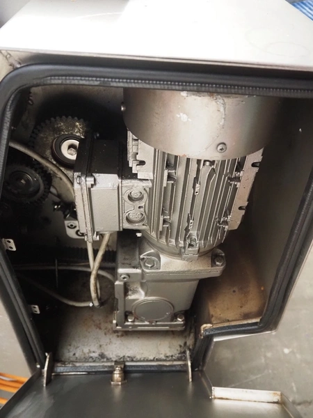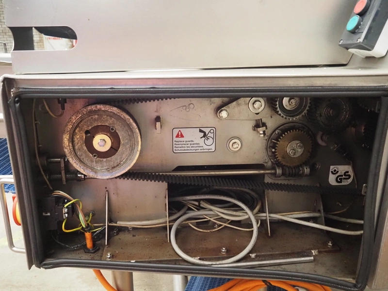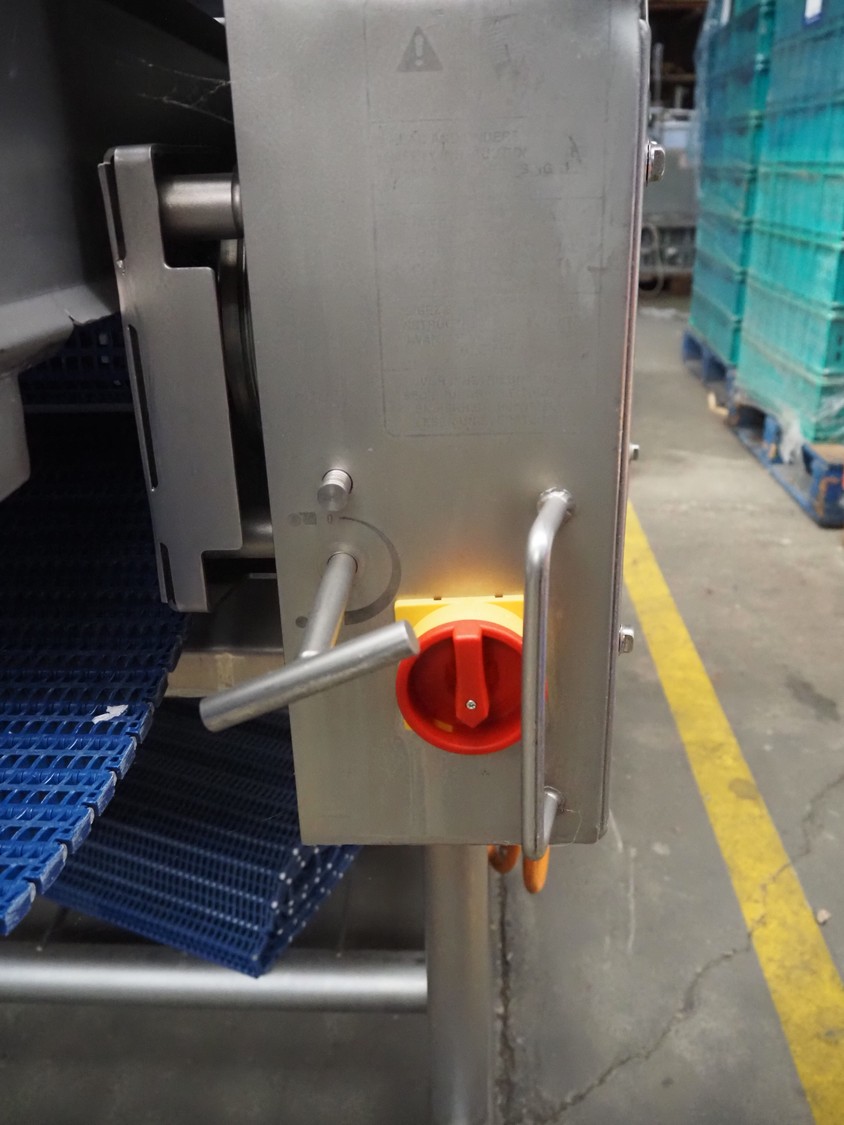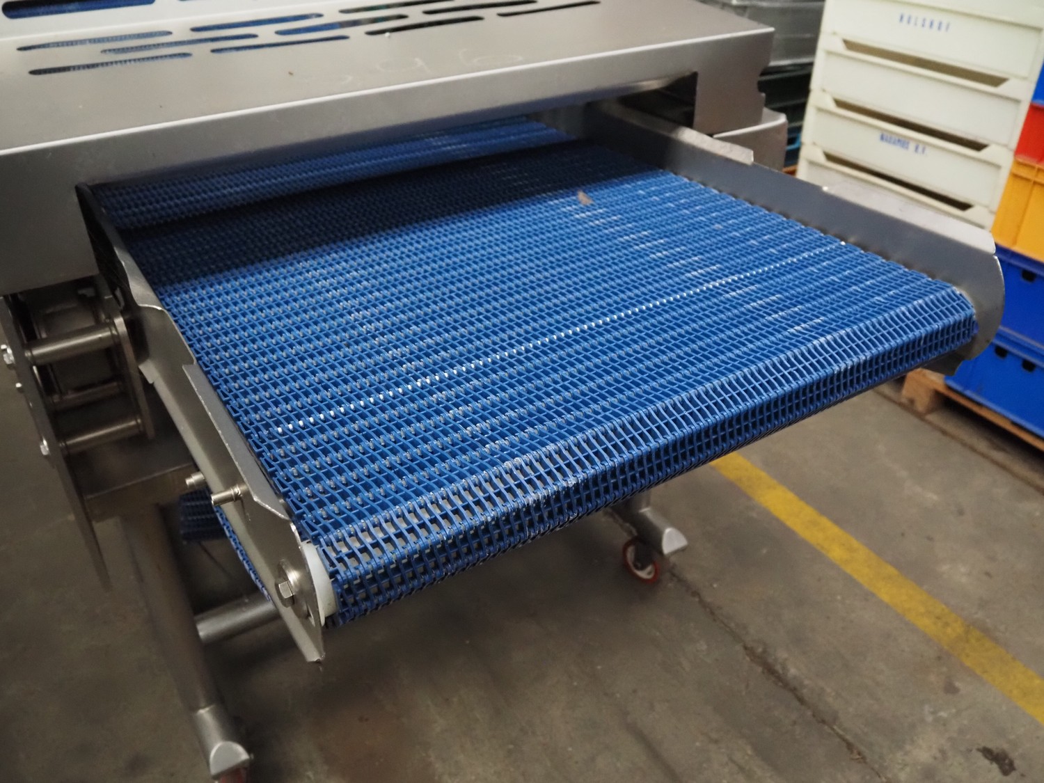 Marel Meat Processing mobile skinning and derinding machine, model: SK15-34 26 Inch, type: 9813403, serial number: 10114564, year of construction: 2013, 415 V, 3 Ph, 50 Hz, 4 A, 5 kA, plastic mesh belt, belt width: 655 mm, working width: 665 mm, total dimensions: 2220 mm x 1150 mm x 1240 mm. Incomplete.