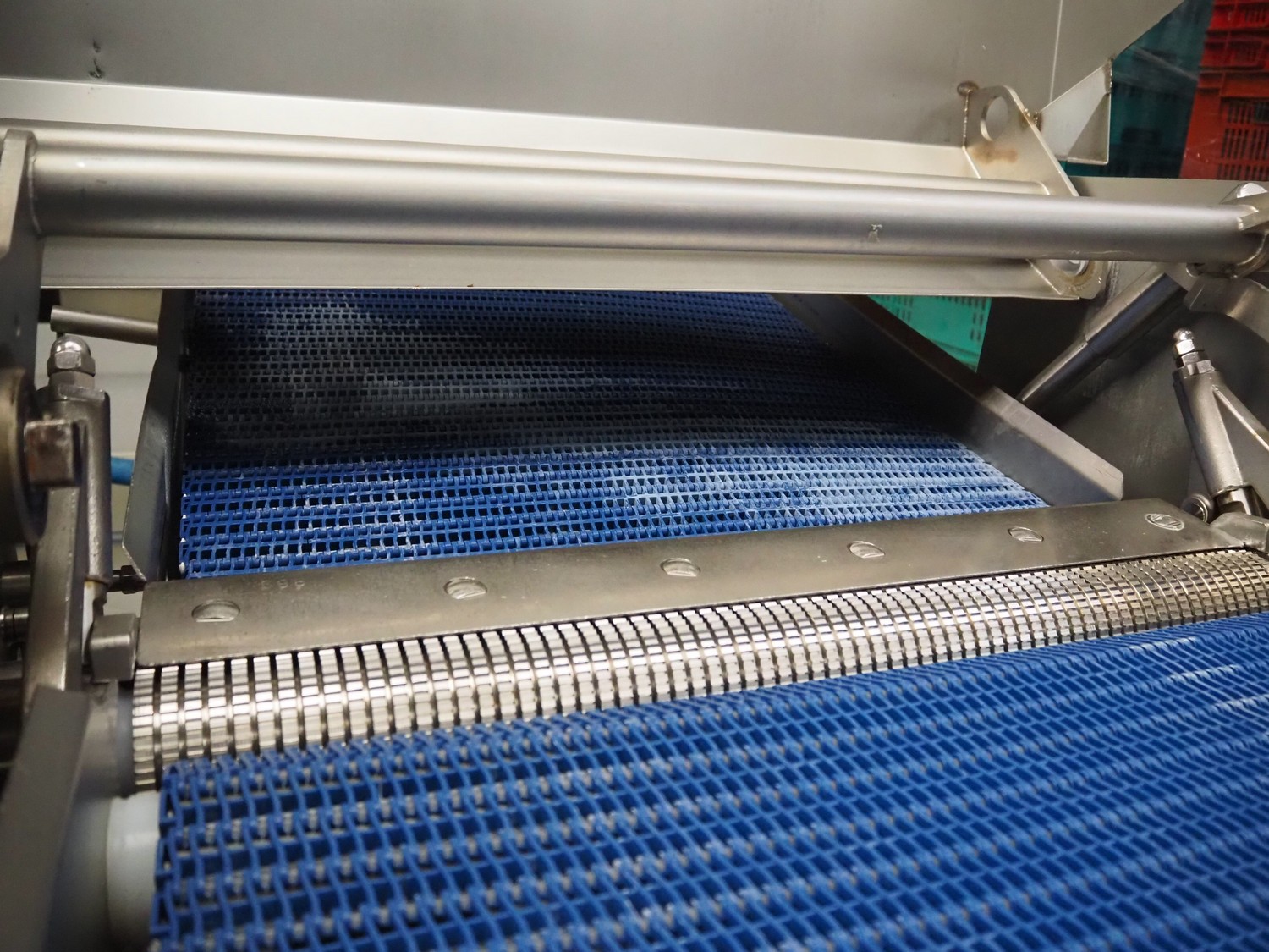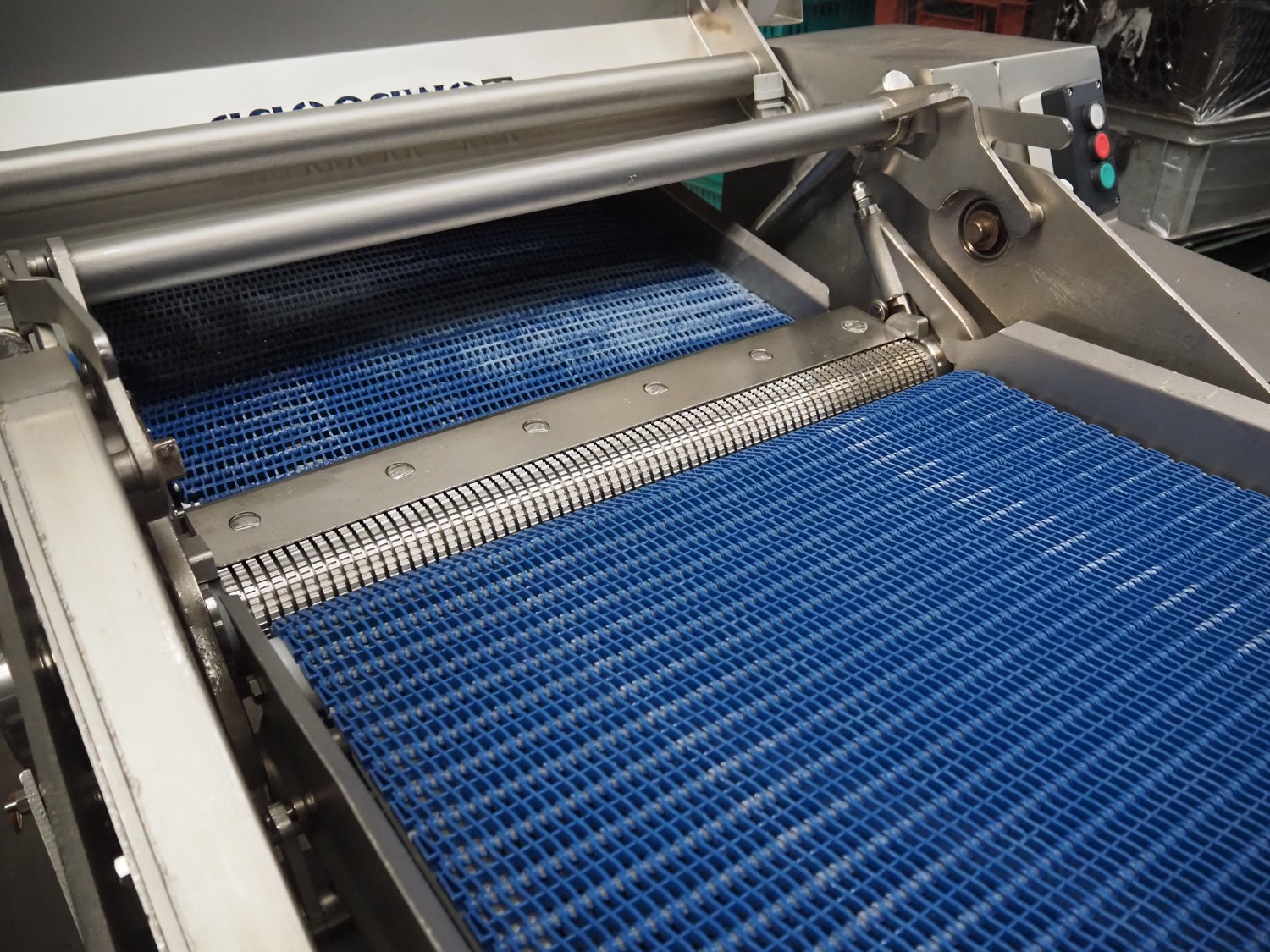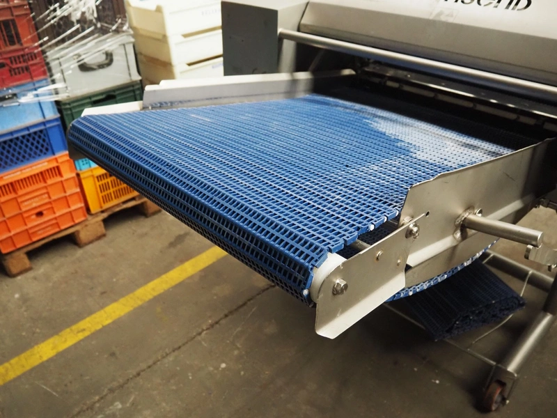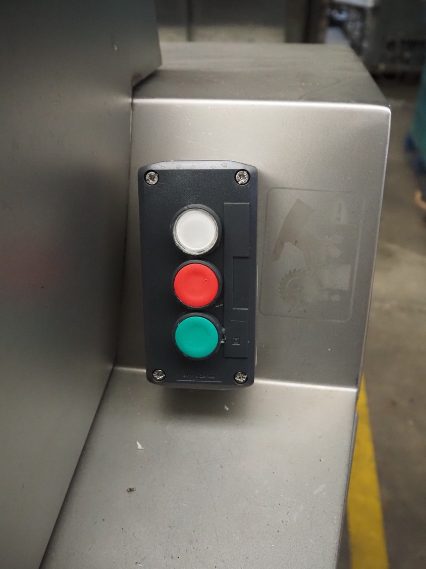 Marel Meat Processing mobile skinning and derinding machine, model: SK15-34 26 Inch, type: 9813403, serial number: 10114564, year of construction: 2013, 415 V, 3 Ph, 50 Hz, 4 A, 5 kA, plastic mesh belt, belt width: 655 mm, working width: 665 mm, total dimensions: 2220 mm x 1150 mm x 1240 mm. Incomplete.