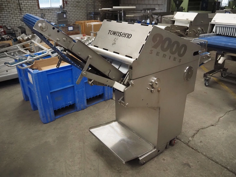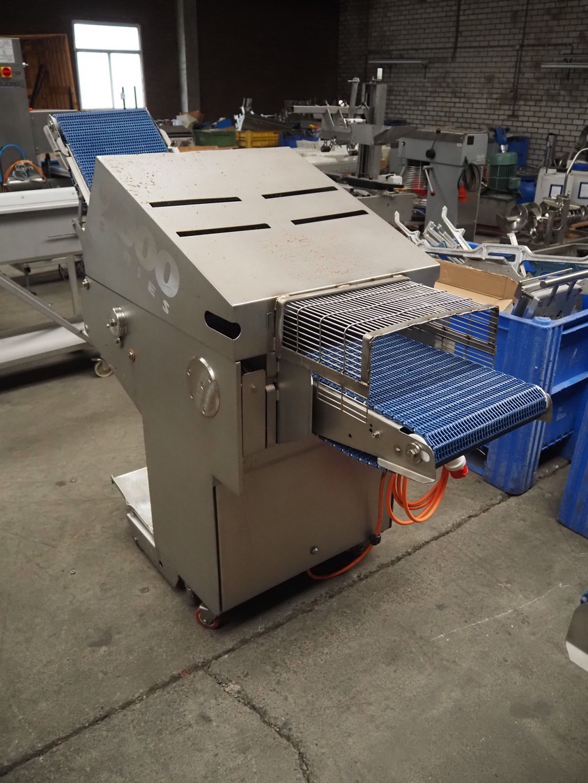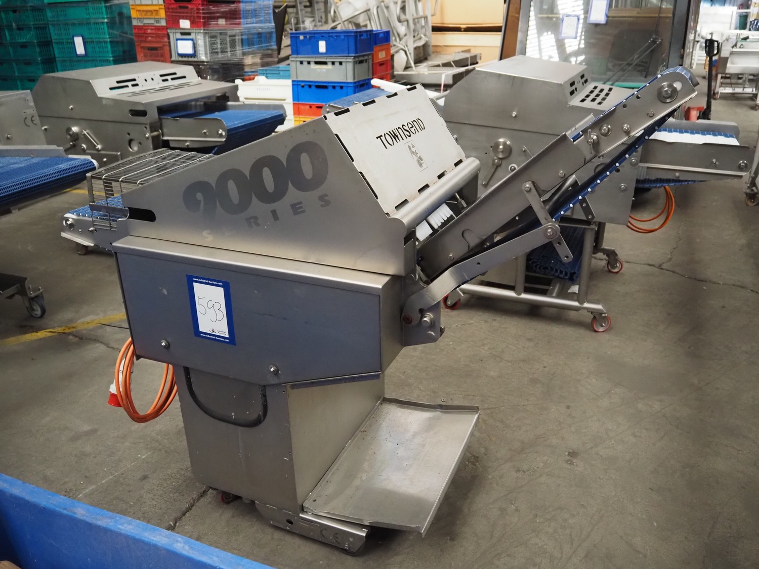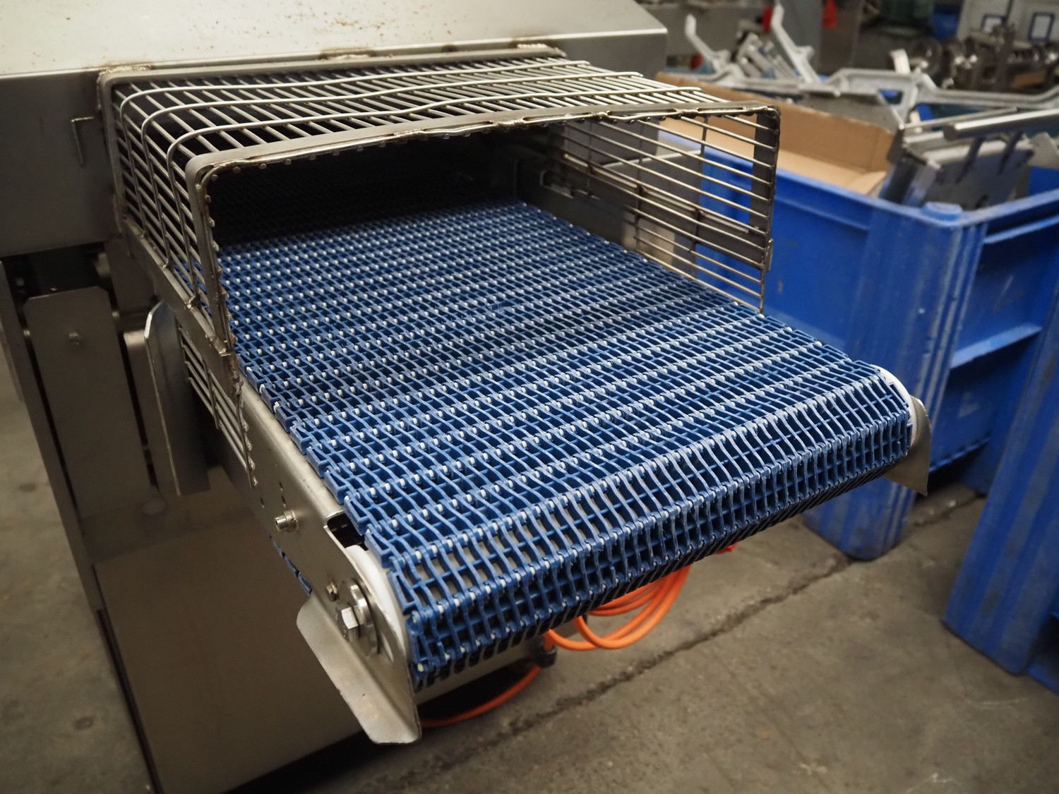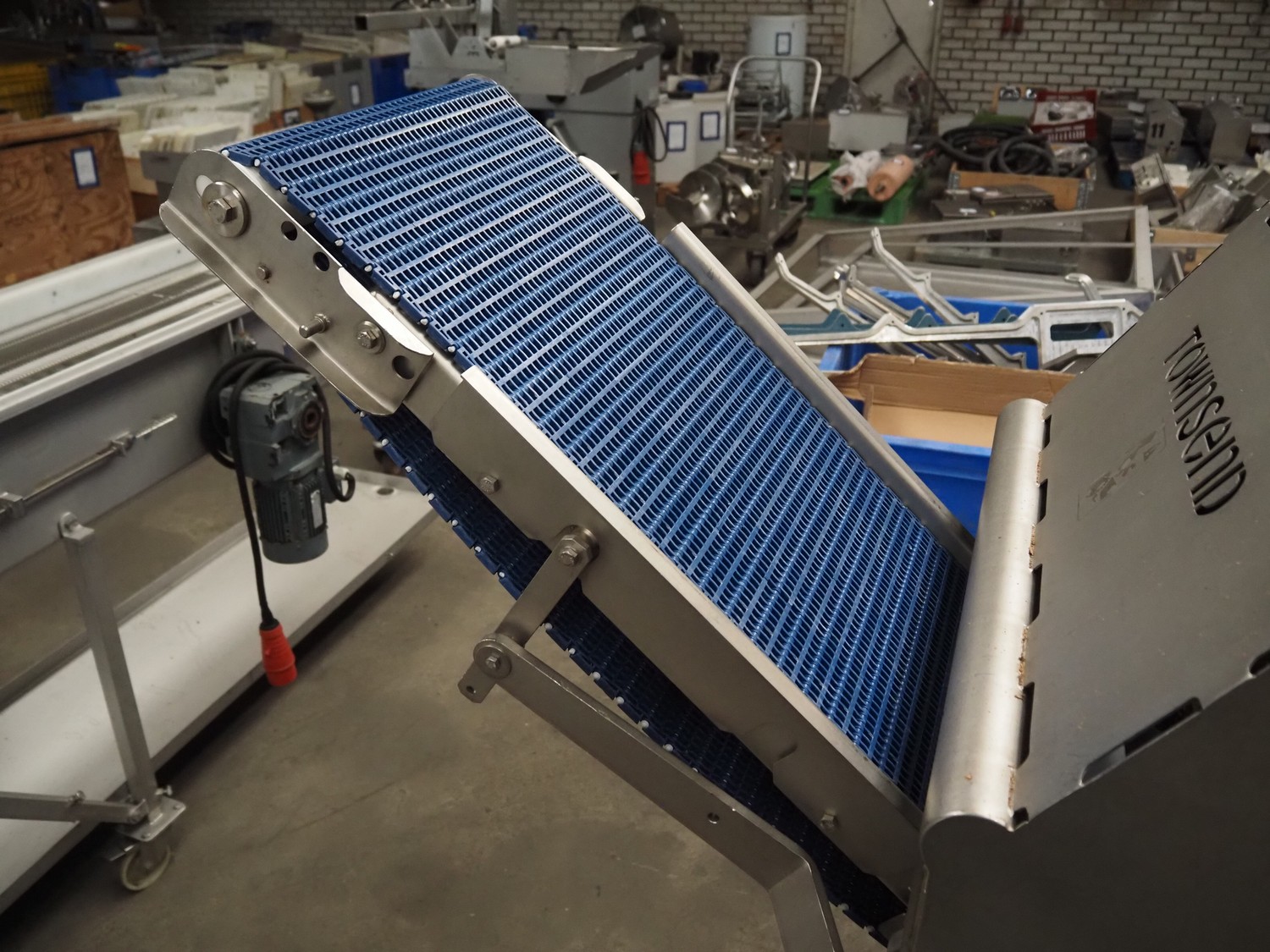 Townsend mobile skinning and derinding machine, working width: 310 mm, plastic mesh belt, belt width: 355 mm, total dimensions: 2000 mm x 840 mm x 1450 mm.