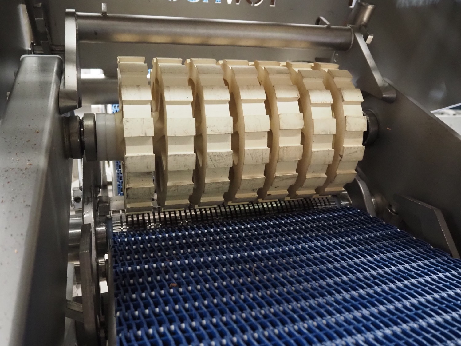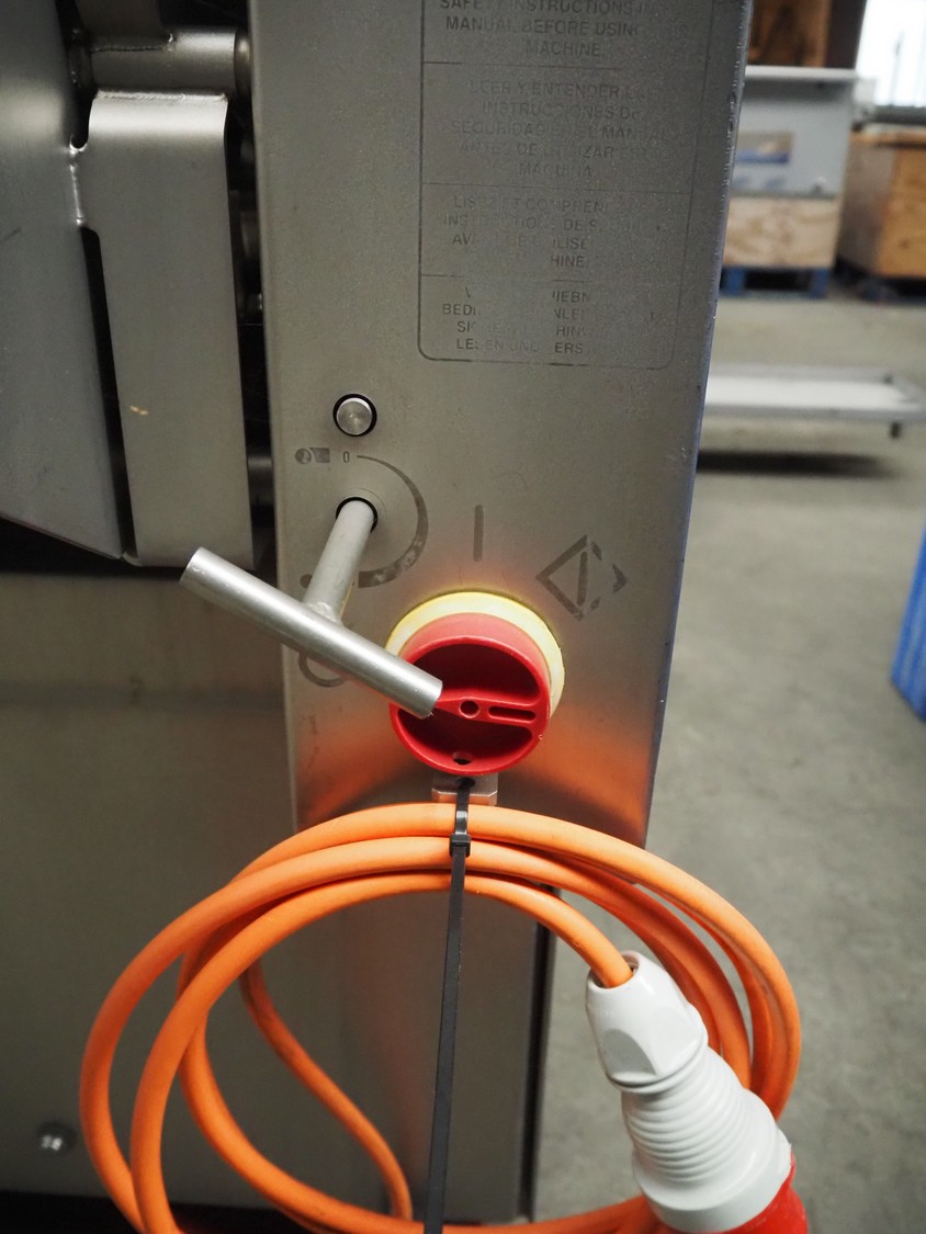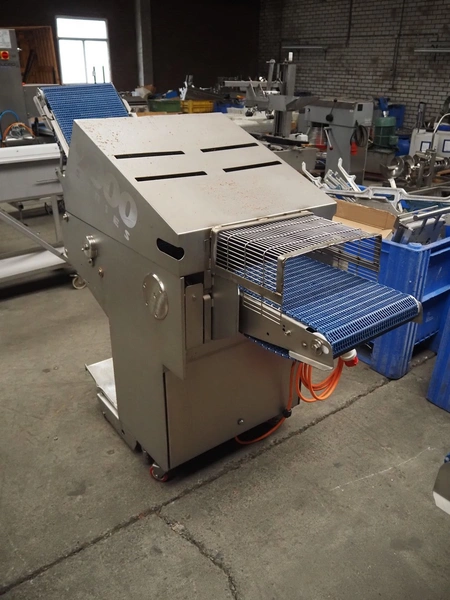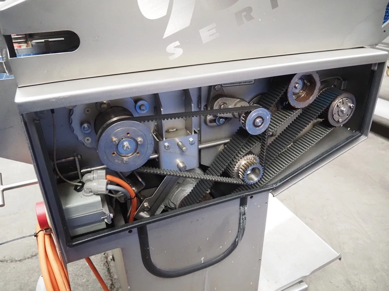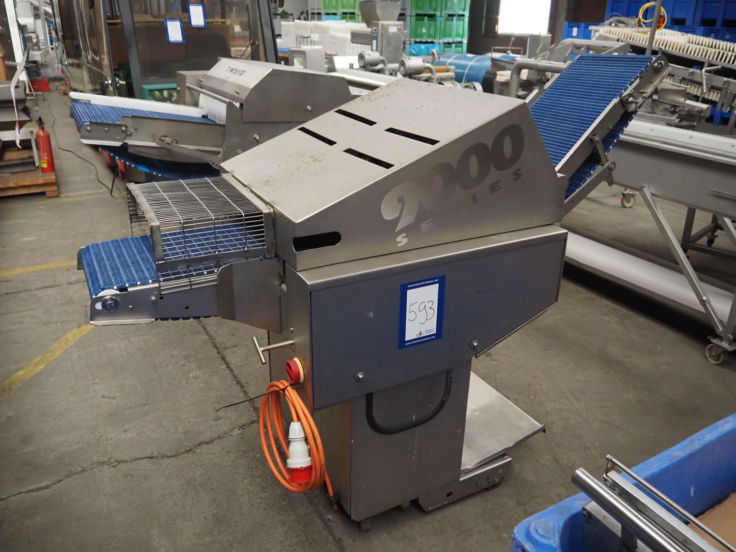 Townsend mobile skinning and derinding machine, working width: 310 mm, plastic mesh belt, belt width: 355 mm, total dimensions: 2000 mm x 840 mm x 1450 mm.