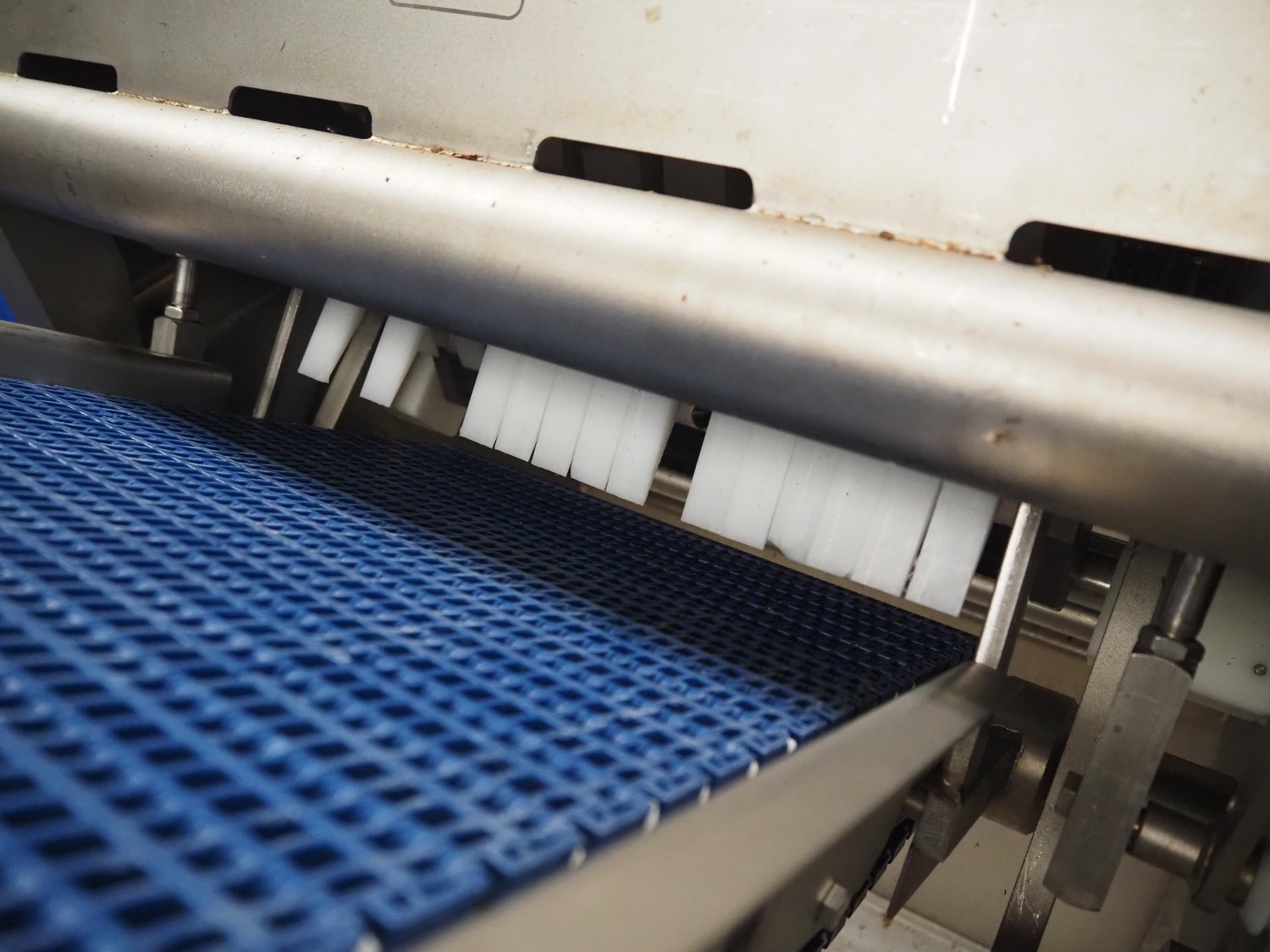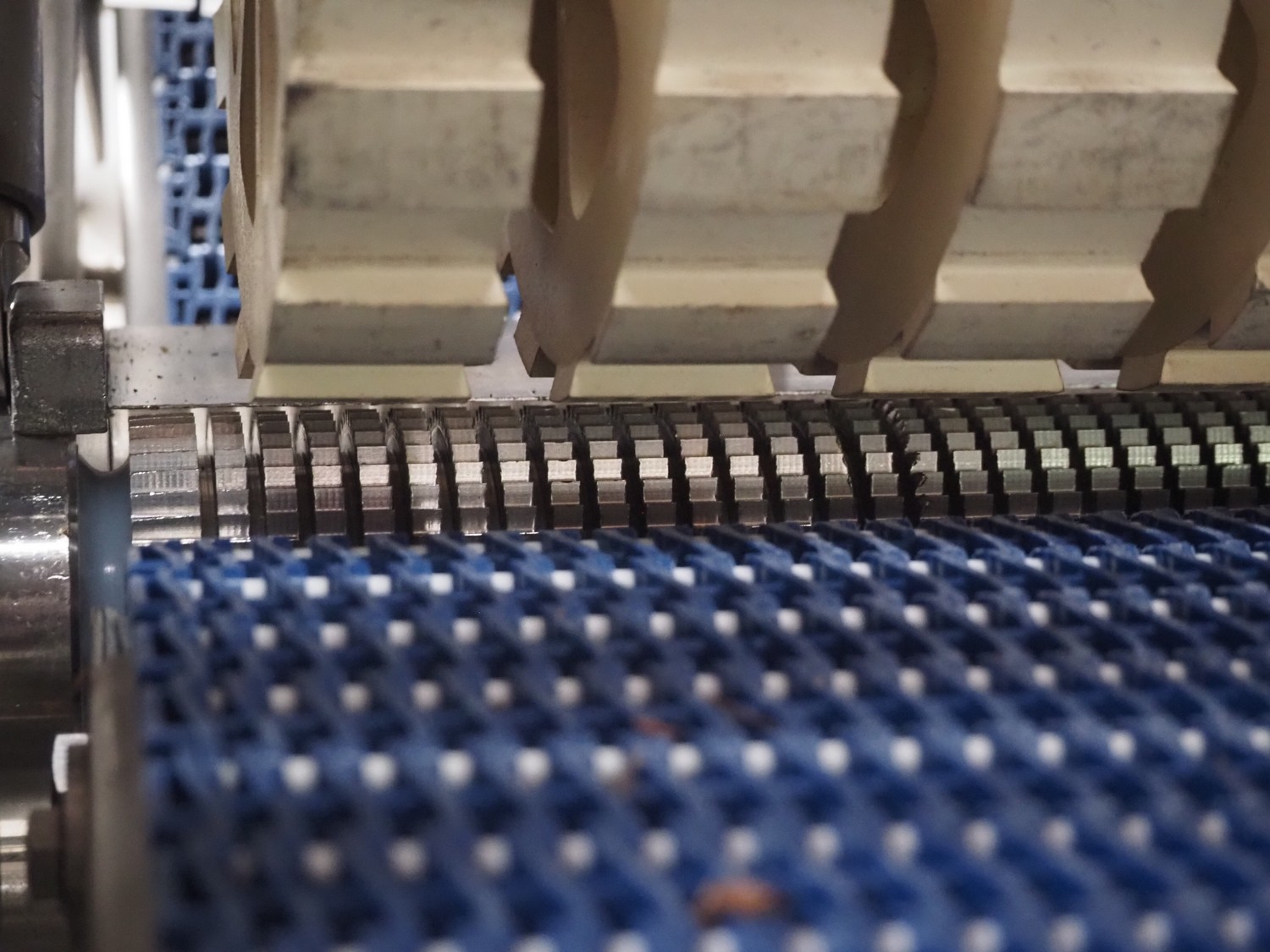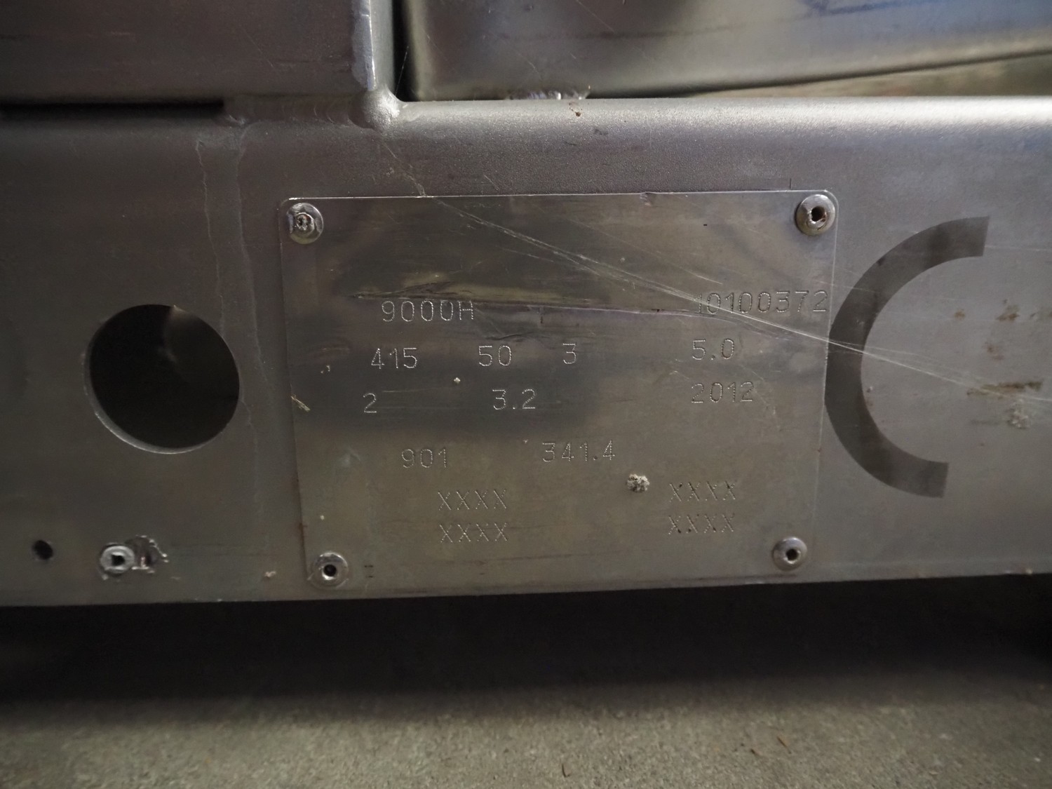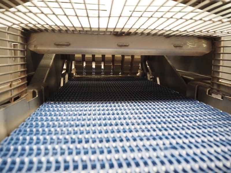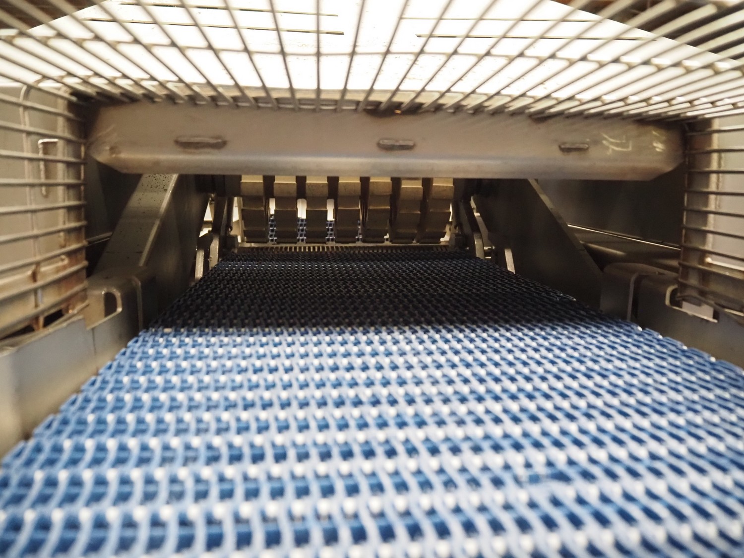Townsend mobile skinning and derinding machine, working width: 310 mm, plastic mesh belt, belt width: 355 mm, total dimensions: 2000 mm x 840 mm x 1450 mm.