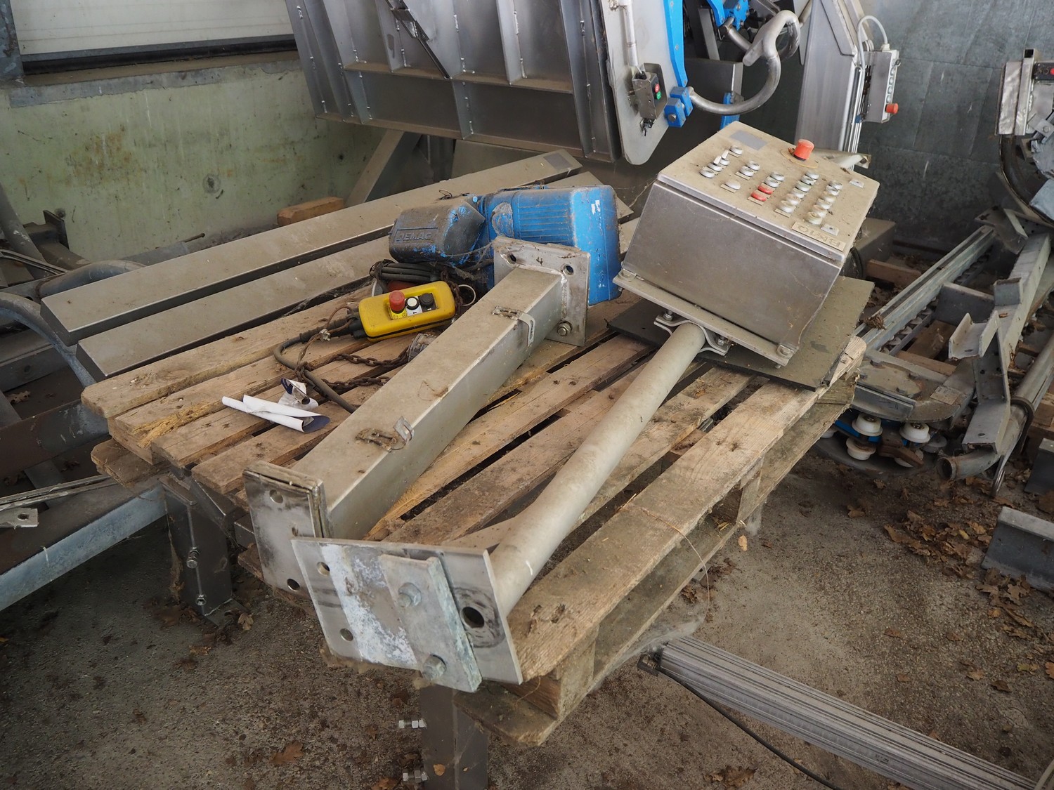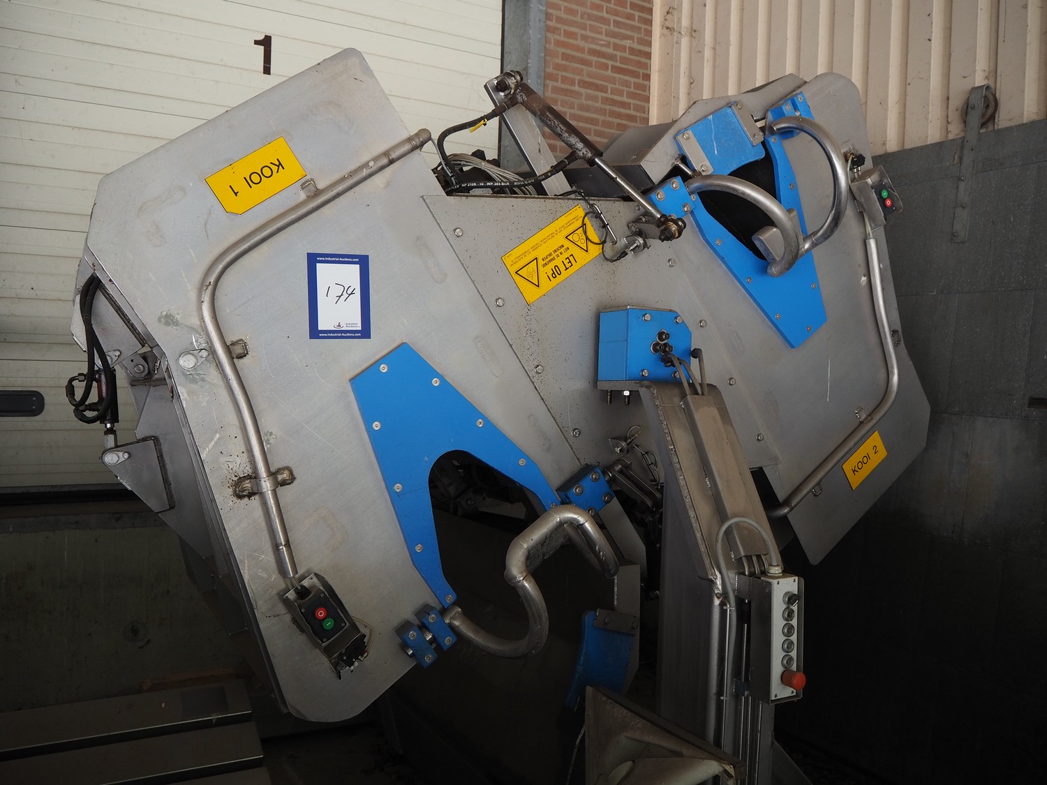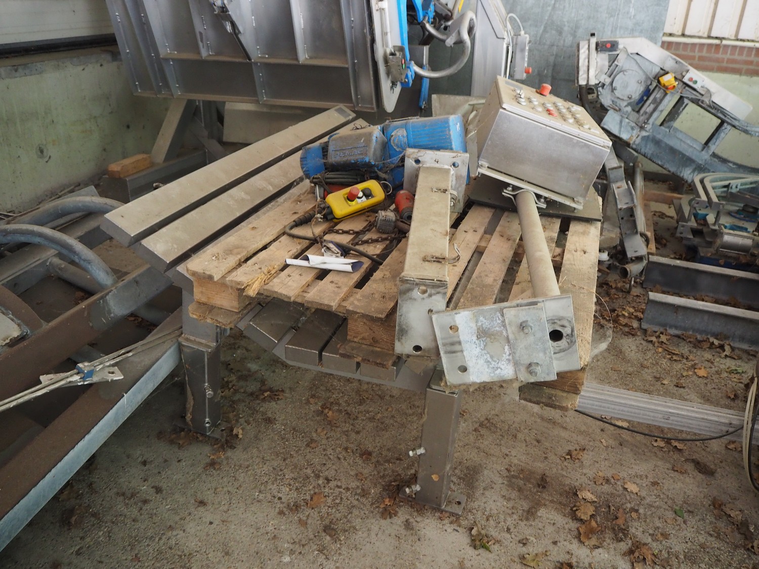 Nawi B.V. double s/s rotating ritual slaughtering box for calves, type: 18000, year of construction: 2007, dimensions slaughtering box: 2600 mm x 3200 mm x 3000 mm, Nawi hydraulic unit, dimensions: 700 mm x 650 mm x 1000 mm, control panel, dimensions: 380 mm x 220 mm x 600 mm, dimensions switch cabinet: 770 mm x 300 mm x 770 mm, including various tube rail elevators and hanging table.