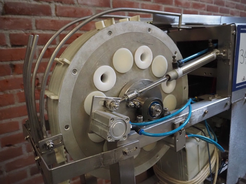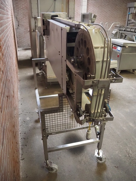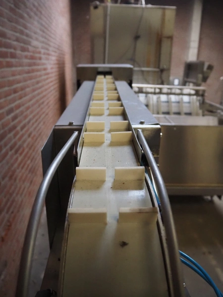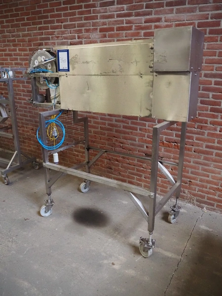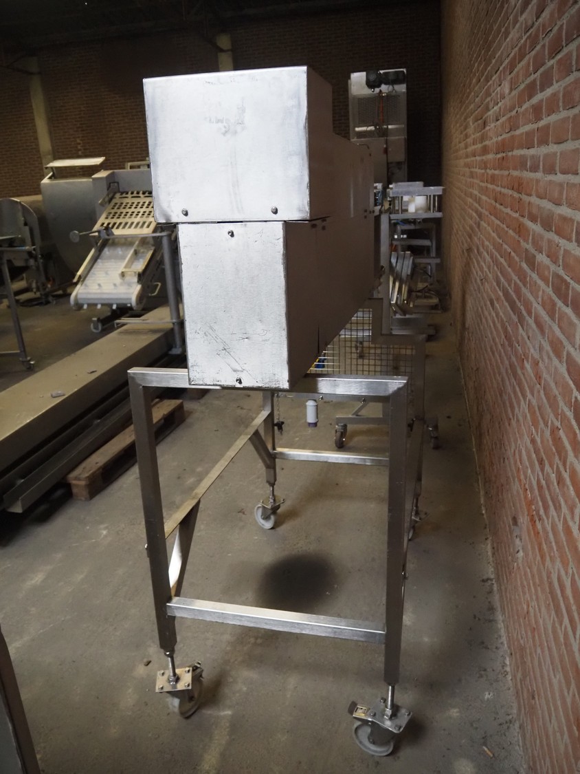 Mobile de-boning conveyor, plastic belt, belt width: 80 mm, divider height: 15 mm, total dimensions: 1900 mm x 800 mm x 1800 mm.