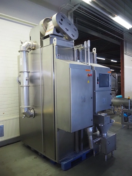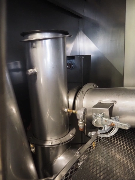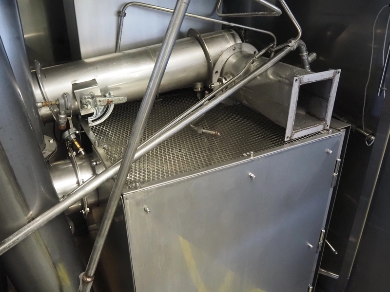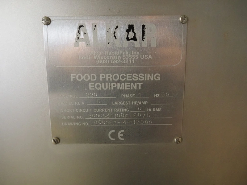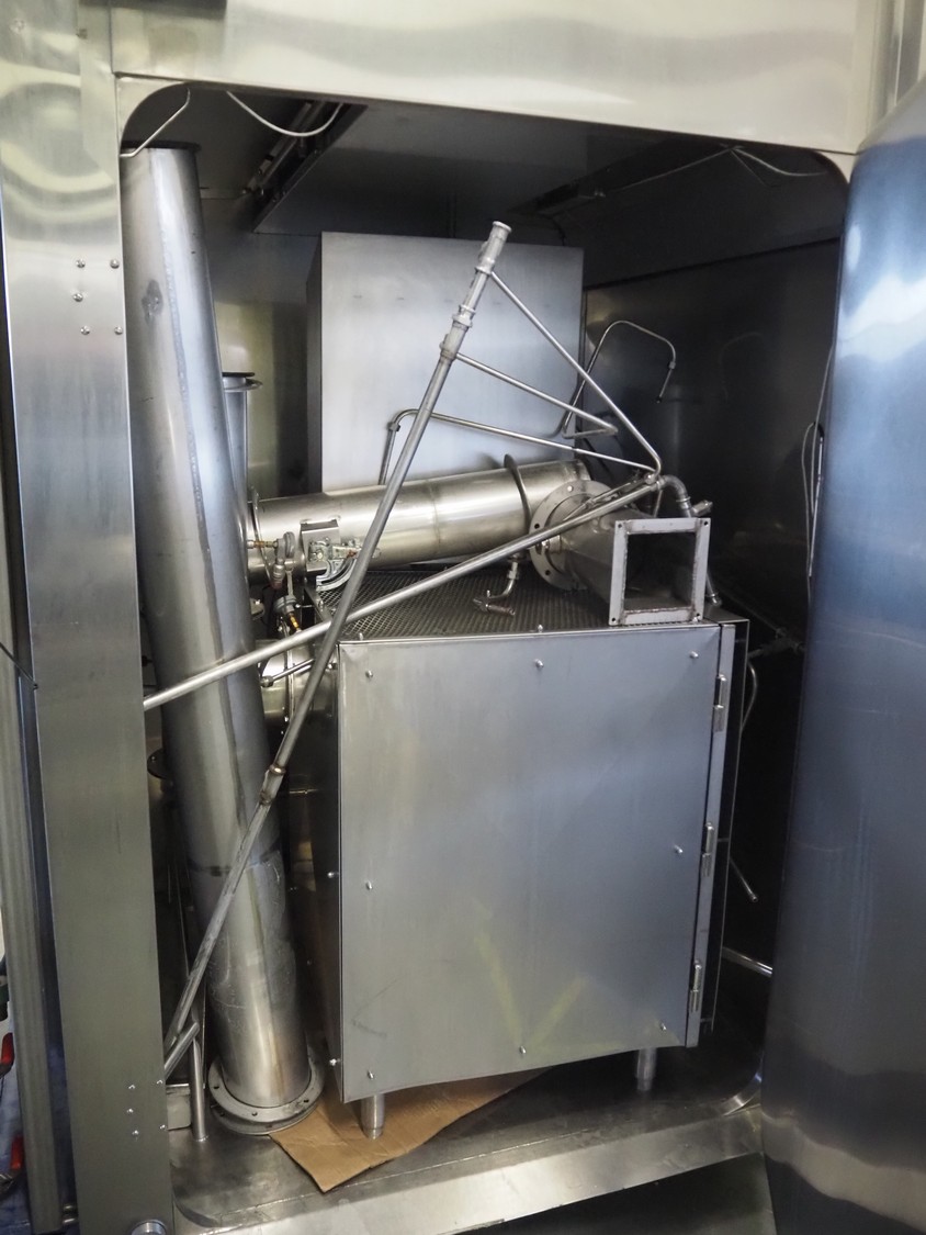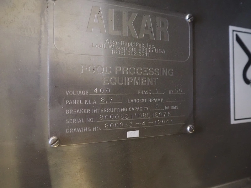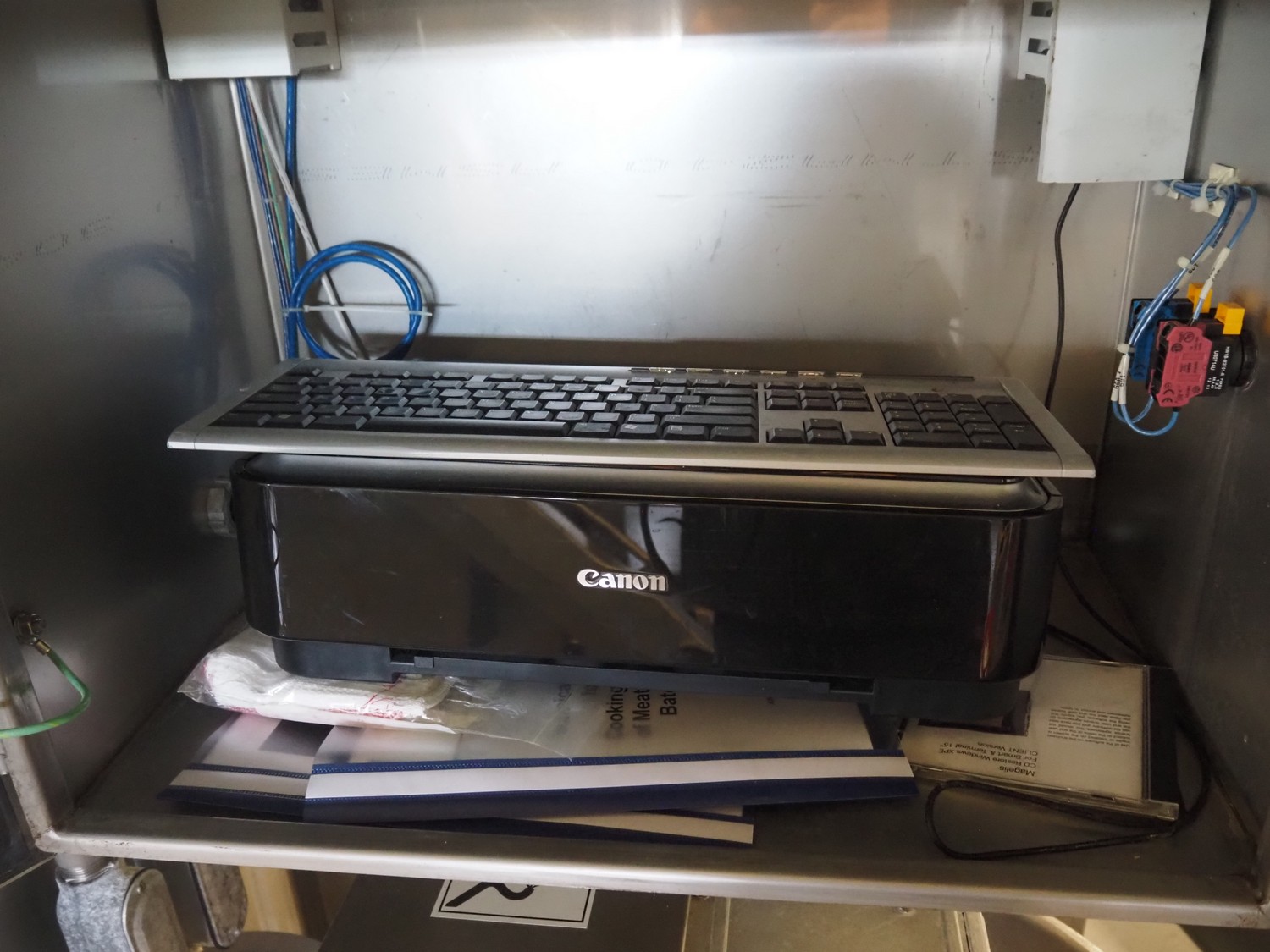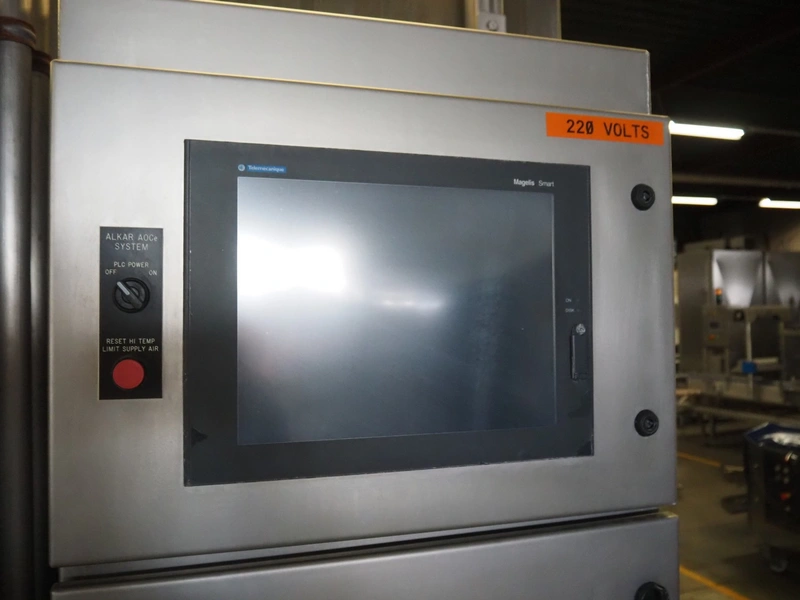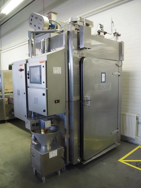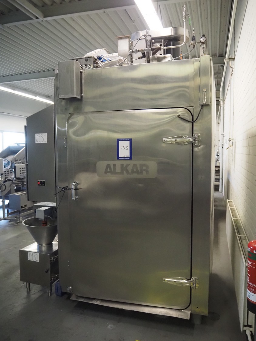 Alkar cooking and smoking chamber for 1 trolley, type: 1000, serial number: 8000531108E1E075, 400 V, 3 Ph, 50 Hz, 2/3.7 A, heating: electric, inside dimensions: 1420 mm x 1310 mm x 1870 mm, total dimensions: 2010 mm x 1550 mm x 2960 mm. Including smoke generator and generator for blocks, serial number: 8000531108E1E075, 400 - 220 V, 1 Ph, 50 Hz, dimensions: 840 mm x 550 mm x 970 mm and 1150 mm x 1100 mm x 1800 mm.