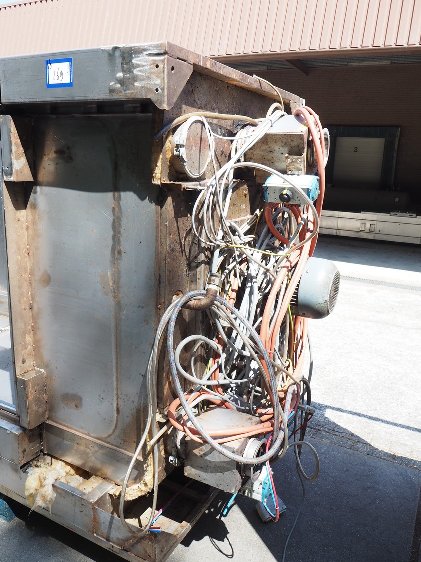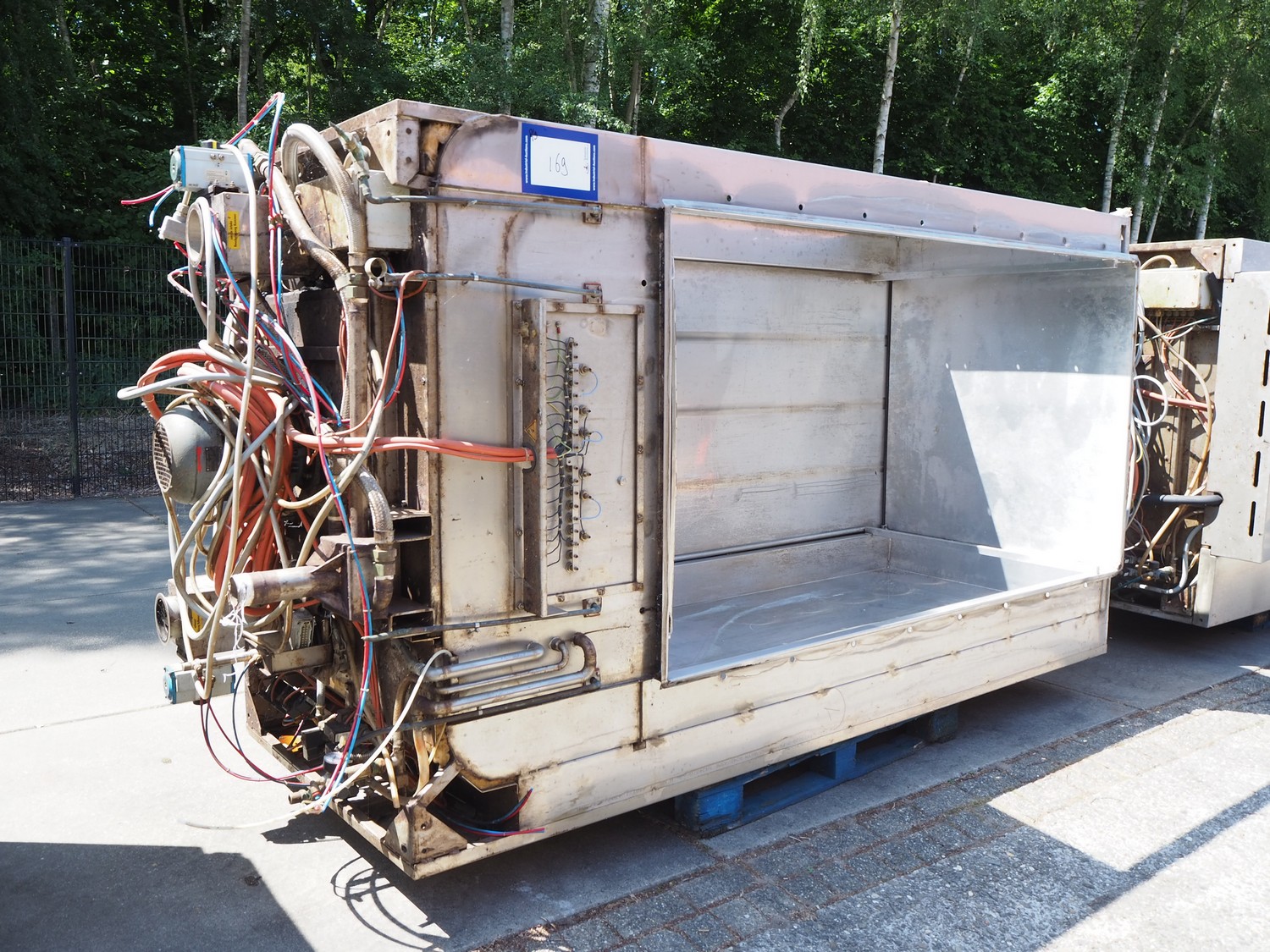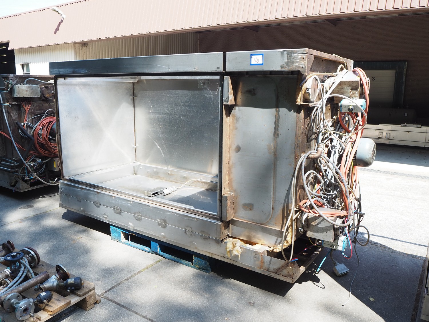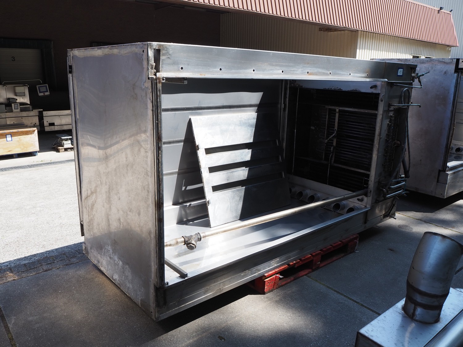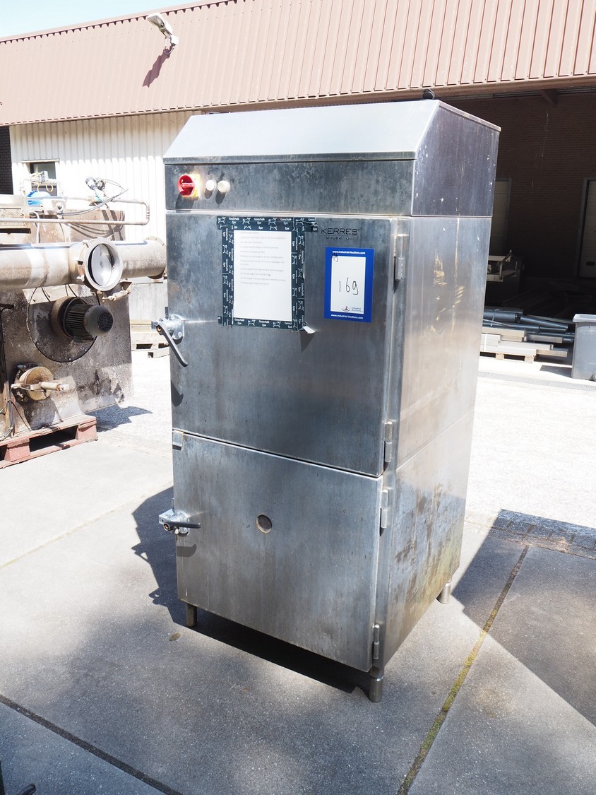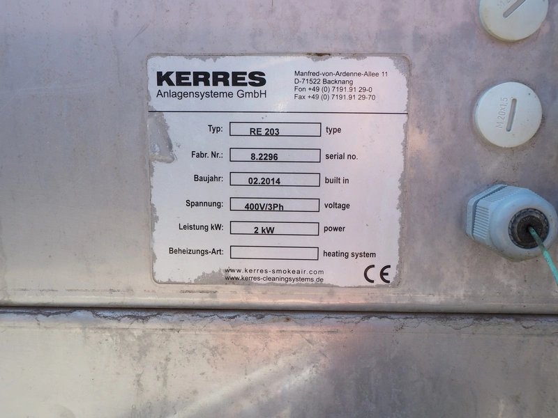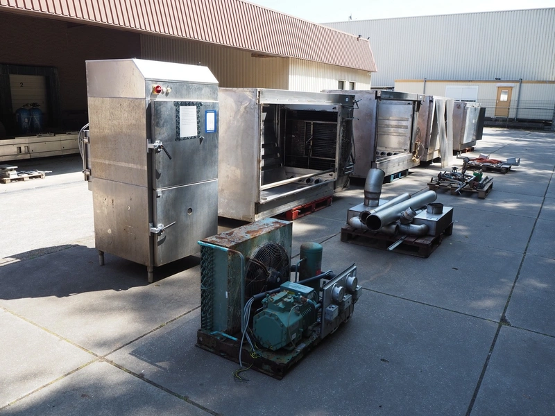 Kerres Anlagensysteme GmbH smoke chamber installation, consisting of: 4 sections of Kerres Anlagensysteme GmbH smoke chambers, inside dimensions: (4x) 1100 mm x 1100 mm x 2100 mm, total dimensions smoke chambers: (4x) 1600 mm x 1200 mm x 3000 mm, Kerres Anlagensysteme GmbH smoke generator for wood chips, type: RE 203, fabrication number: 8.2296, year of construction: 02.2014, 400 V, 3 Ph, 2 kW, dimensions: 850 mm x 1300 mm x 1830 mm, Bitzer Kühlmaschinenbau GmbH cooling compressor, type: LH64/FS76, serial number: 1685003971, dimensions: 900 mm x 750 mm x 700 mm, 3 pallets with parts, dimensions: (3x) 1200 mm x 800 mm x 500 mm.