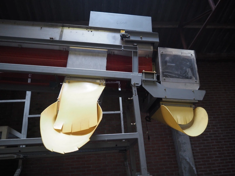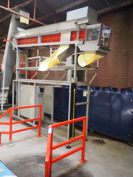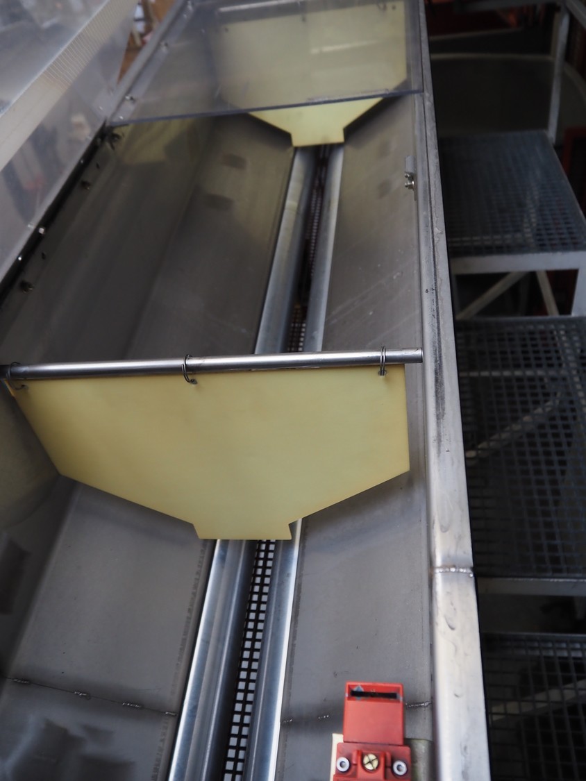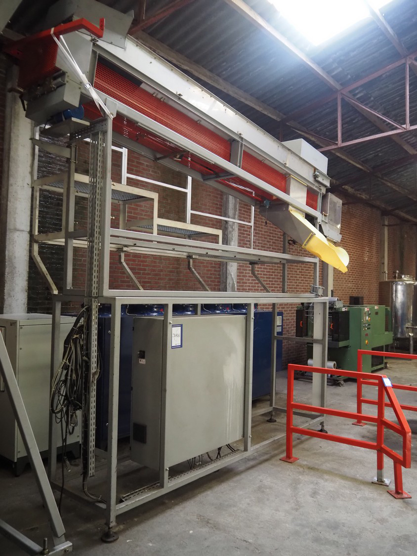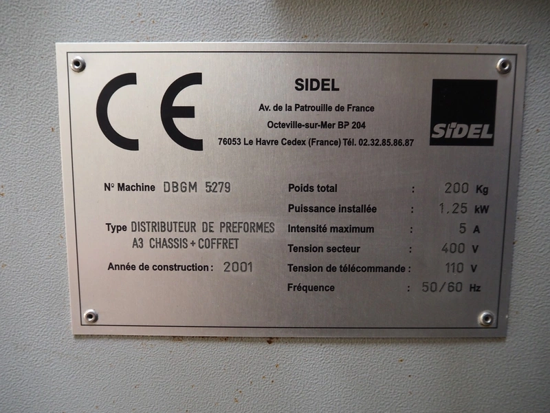 Sidel sorting conveyor, type: Distributeur De Preformes A3 Chassis + Coffret, machine number: DBGM 5279, year of construction: 2001, 400 V, 50/60 Hz, 5 A, 1.25 kW, 200 kg, infeed height: 3800 mm, outfeed height: 2800 mm, total dimensions: 4350 mm x 1800 mm x 3800 mm. Including 2 steel protection frames.