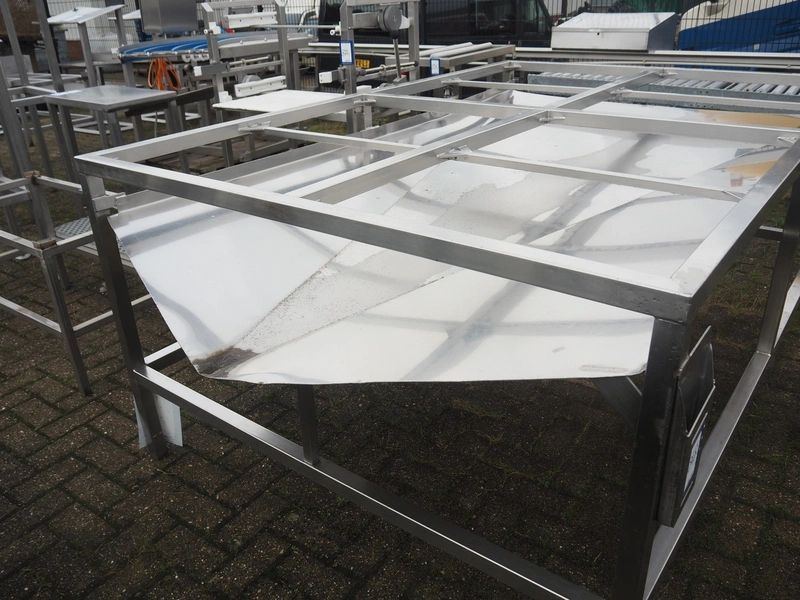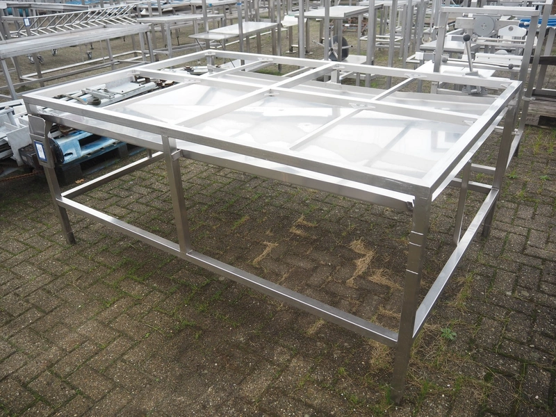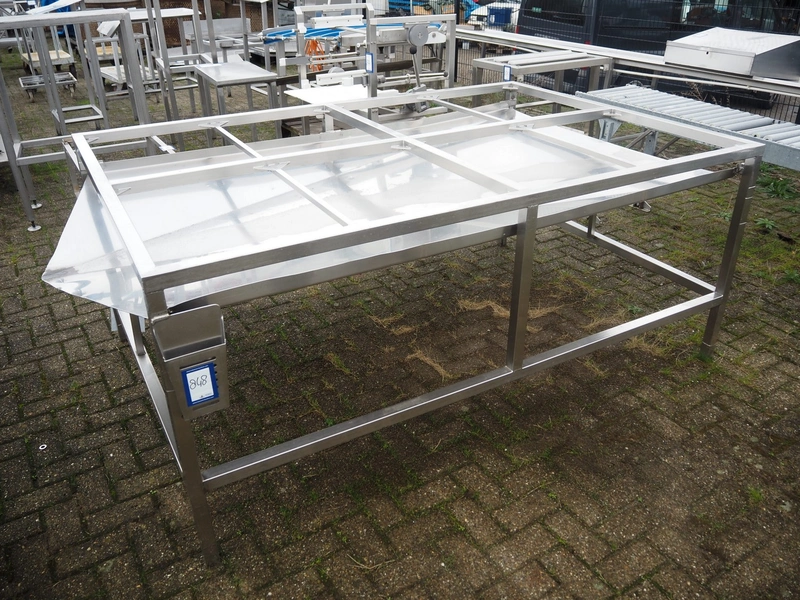 S/s table with dip tray, dimensions: 2320 mm x 1450 mm x 910 mm.