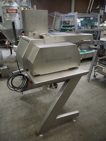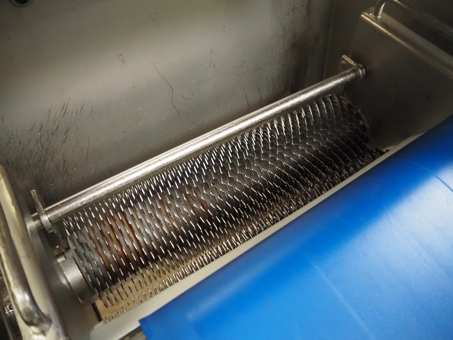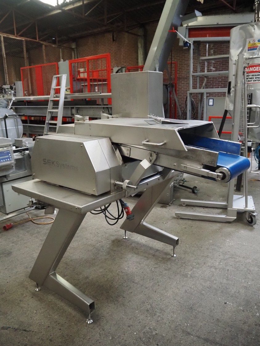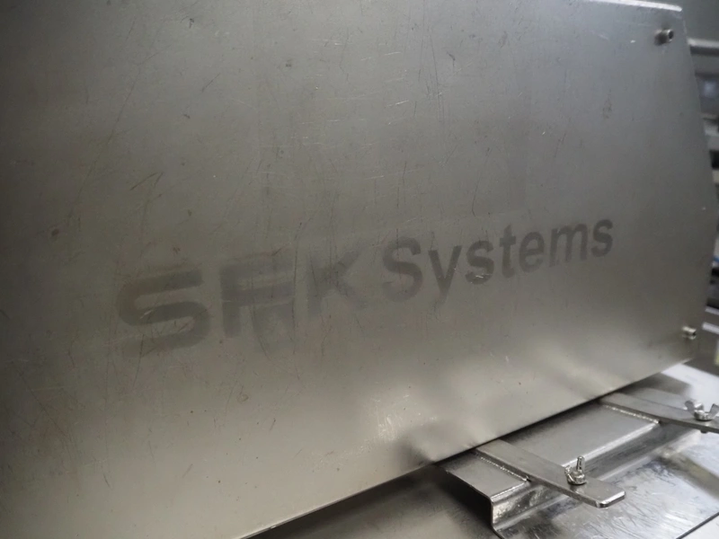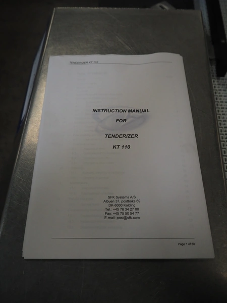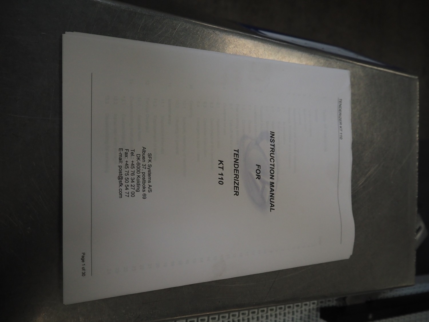 SFK Systems tenderizer, model: KT 110, plastic belt, belt width: 345 mm, working width: 375 mm, total dimensions: 1450 mm x 1320 mm x 1730 mm.