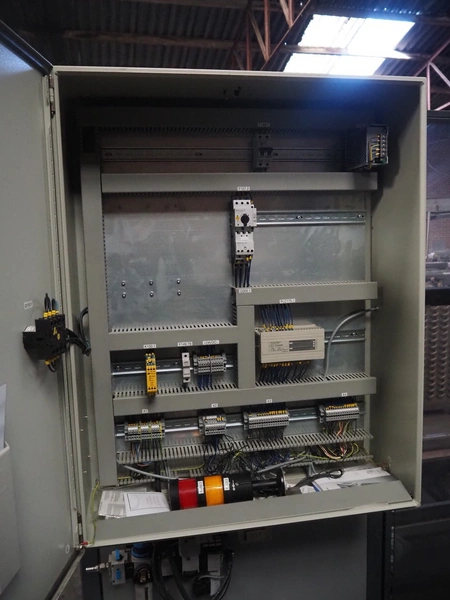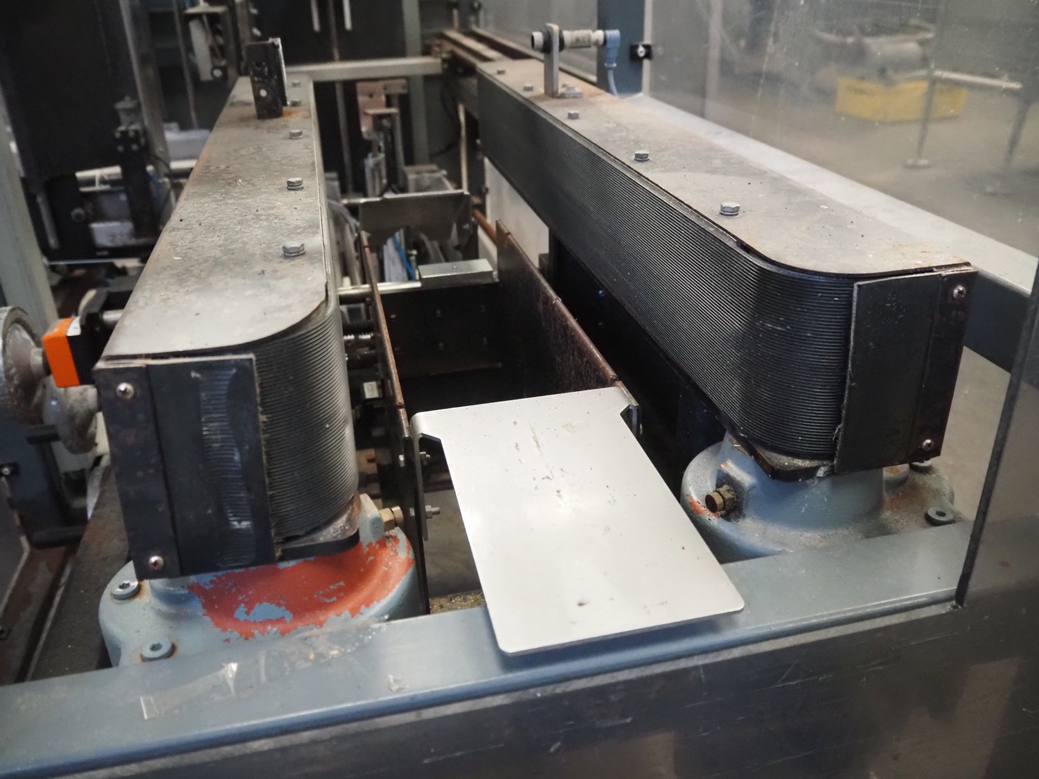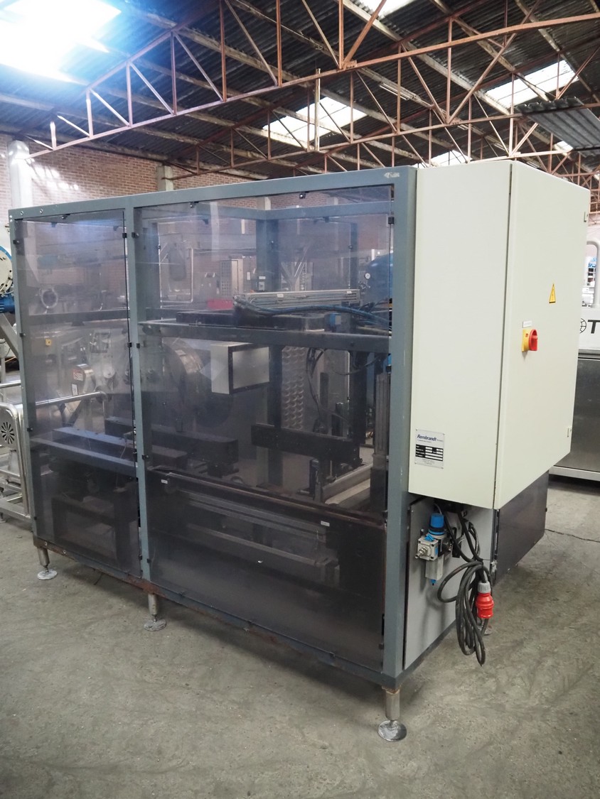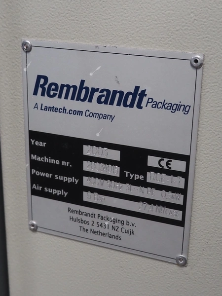 Rembrandt Packaging carton erector, type: RCE-1-T, serial number: 20034015, year of construction: 2003, 400 V, 3 Ph, 50 Hz, 0.5 kW, infeed working width: maximum 910 mm, clearance: 425 mm x 615 mm, distance between belts: 210 mm, total dimensions: 2510 mm x 1700 mm x 1880 mm.