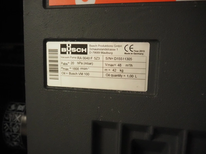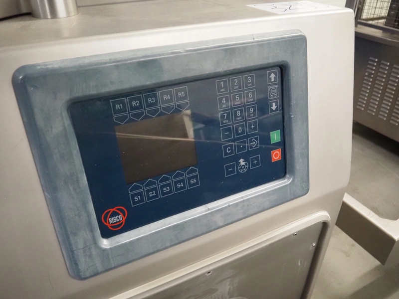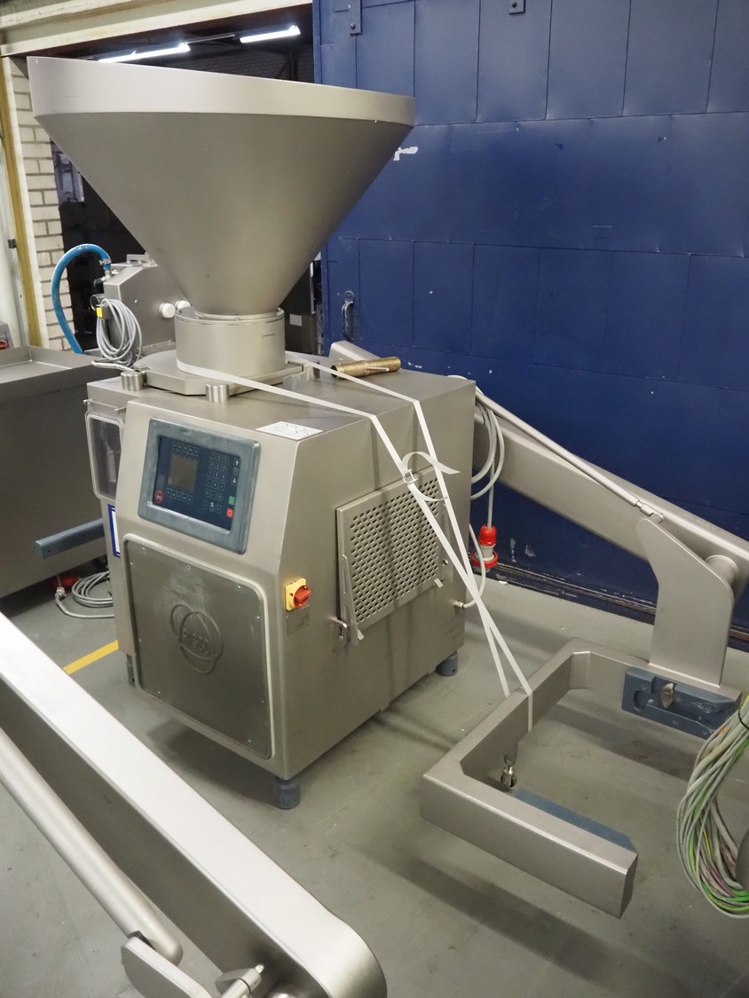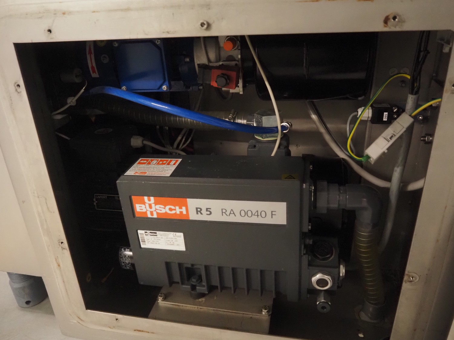 Risco S.P.A. vacuum filling machine with lifter for 200 litres meat bins, model: RS 605, serial number: S216011, year of construction: 2018, 400 V, 3 Ph, 50 Hz, 11.0 kW, weight: 995 kg, filling and portioning, with Busch vacuum pump, type: RA 0040 F 5Z3, dimensions: 2100 mm x 1300 mm x 2100 mm.