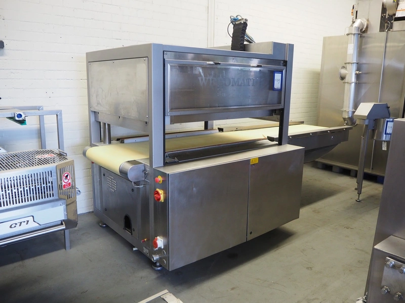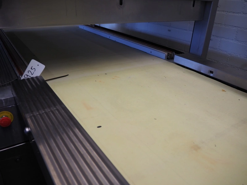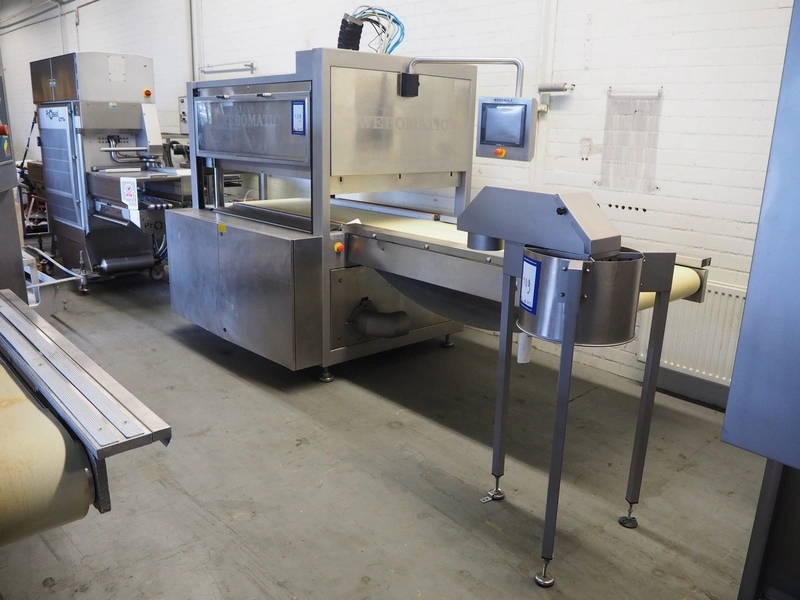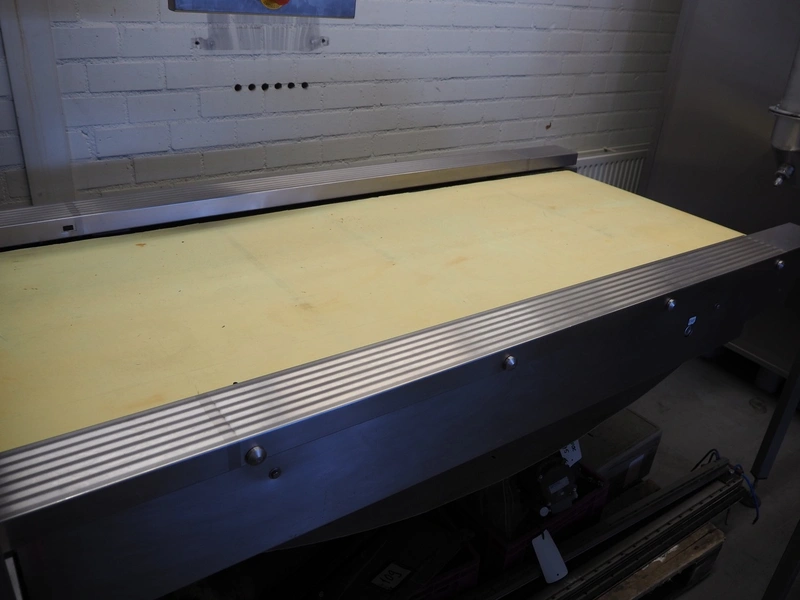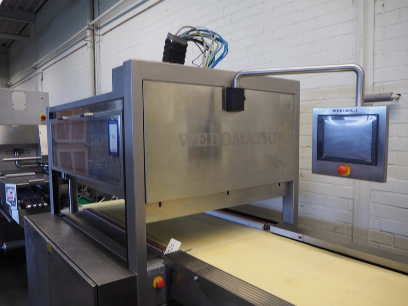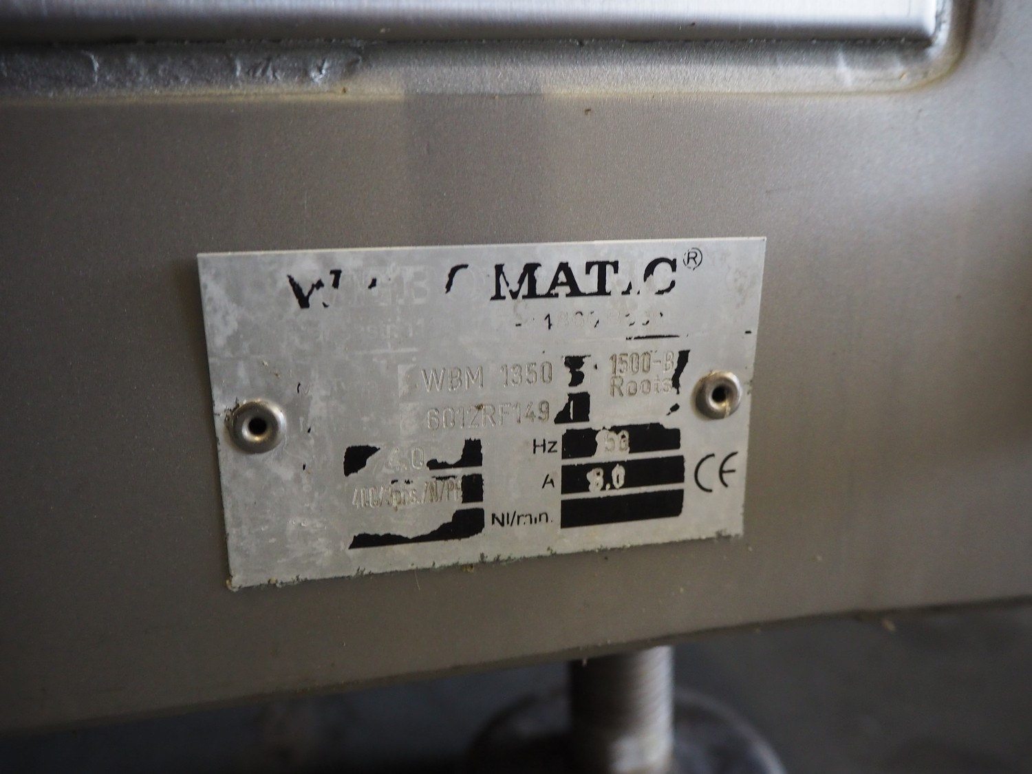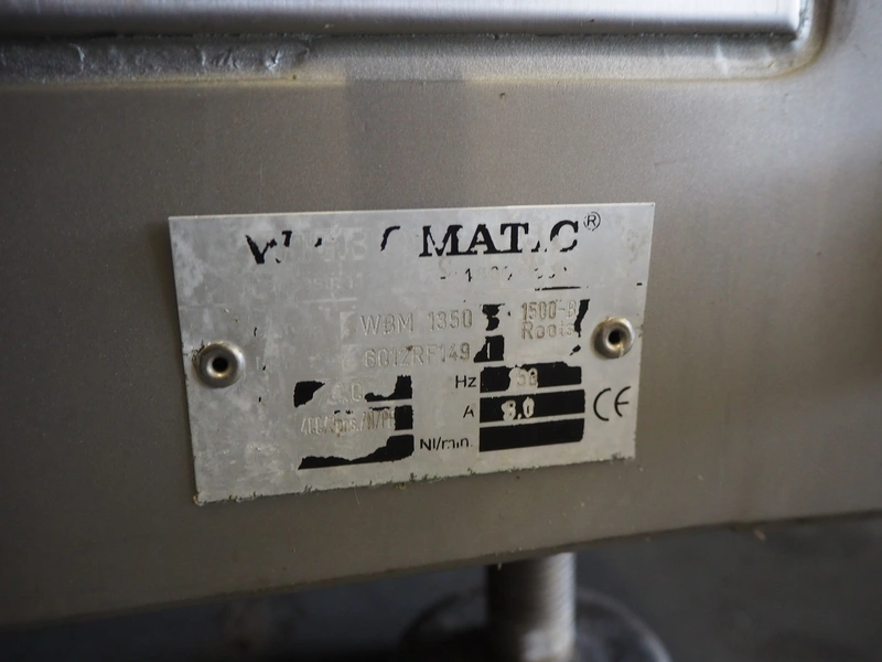 Webomatic belt vacuum machine, type: WBM 1350, serial number: 6012RF149, 400 V, 3 Ph, 50 Hz, 4 kW, weight: 2200 kg, pressure: 6 bar, capacity: 3 cycles/min, plastic belt, belt width: 800 mm, built-in Busch roots pump, type: Panda WV1500B roots, total dimensions: 3750 mm x 1500 mm x 2200 mm. Including trim removal unit, dimensions: 830 mm x 650 mm x 1380 mm.