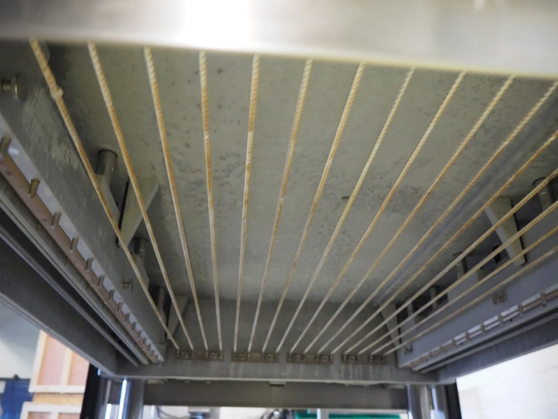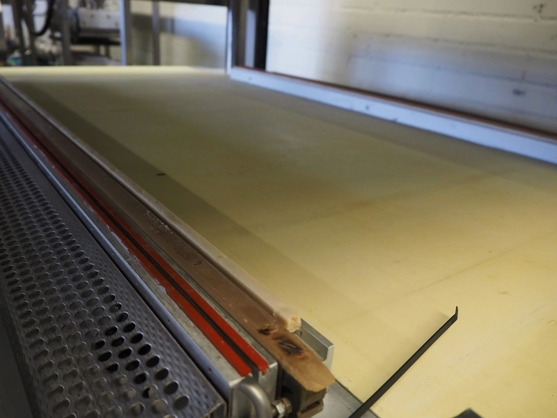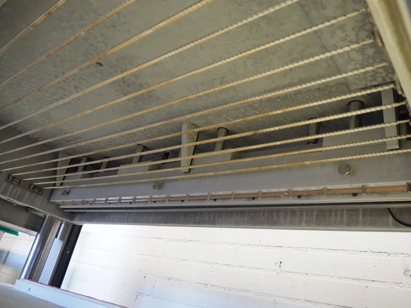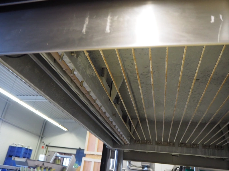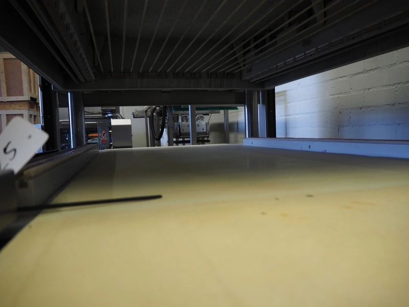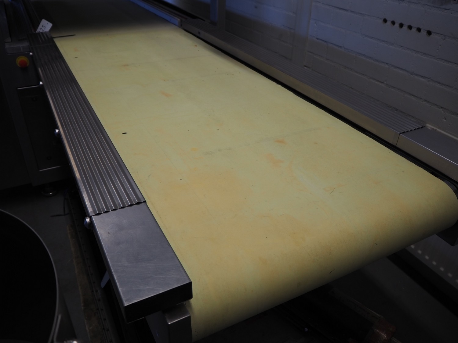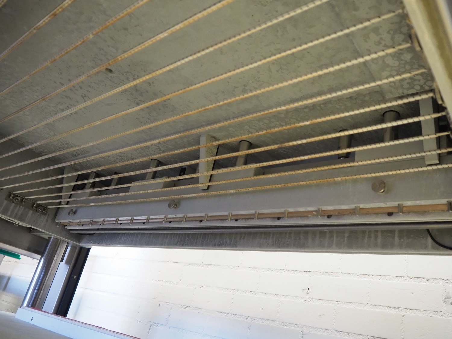 Webomatic belt vacuum machine, type: WBM 1350, serial number: 6012RF149, 400 V, 3 Ph, 50 Hz, 4 kW, weight: 2200 kg, pressure: 6 bar, capacity: 3 cycles/min, plastic belt, belt width: 800 mm, built-in Busch roots pump, type: Panda WV1500B roots, total dimensions: 3750 mm x 1500 mm x 2200 mm. Including trim removal unit, dimensions: 830 mm x 650 mm x 1380 mm.
