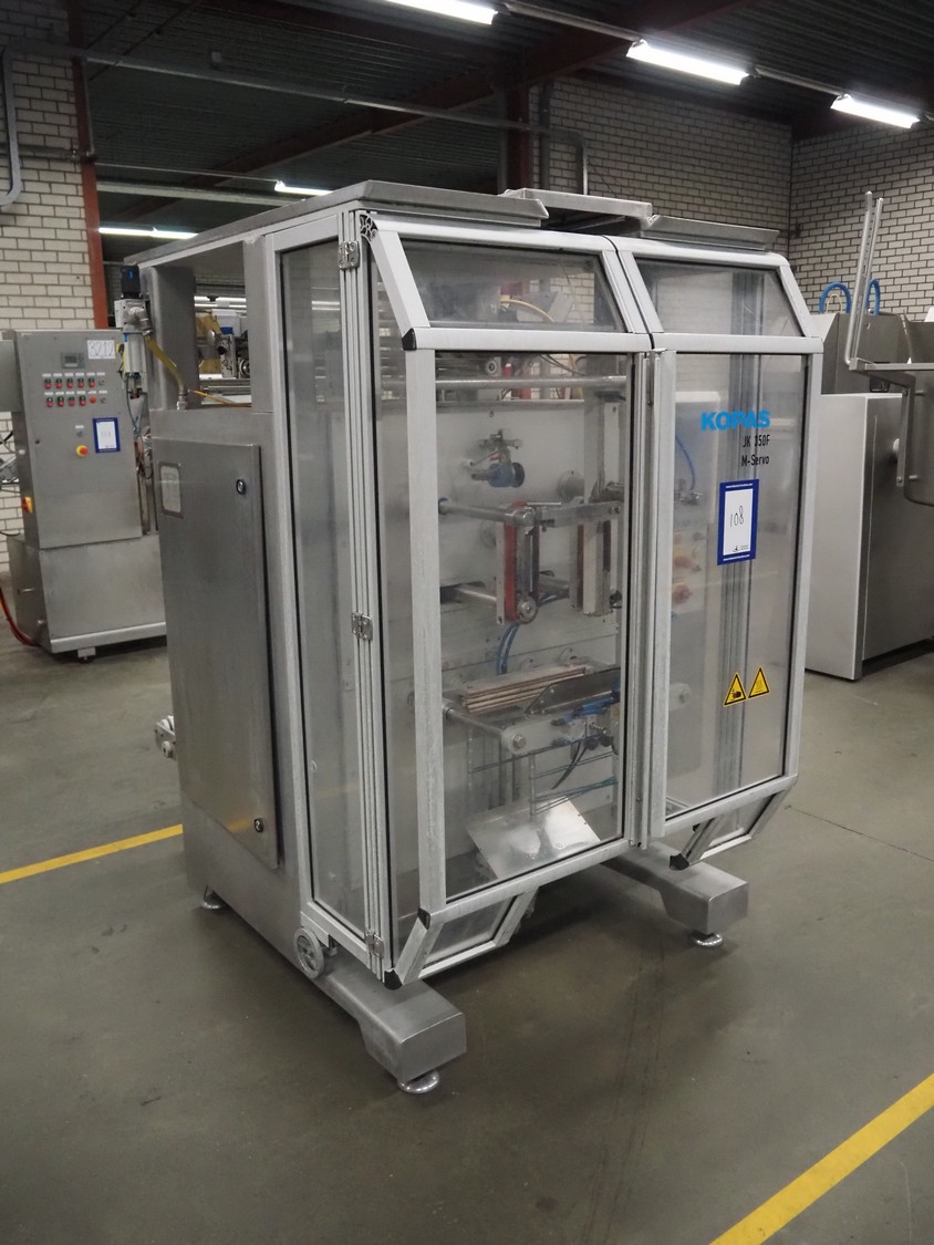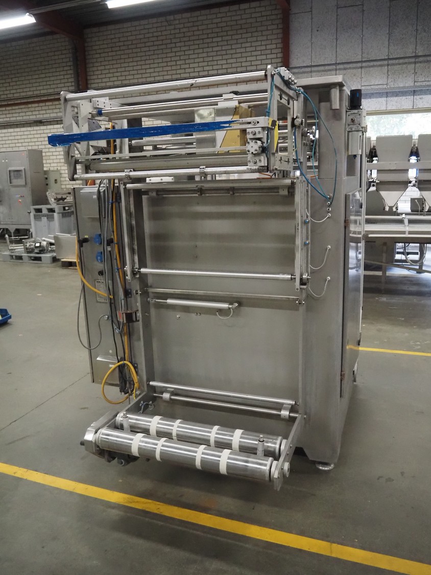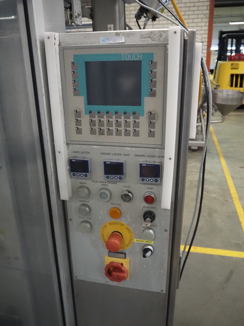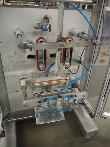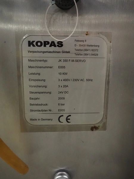KOPAS Verpackungsmaschinen GmbH vertical form, fill and seal machine, machine type: JK 350 F-M-SERVO, machine number: E005, 3x400 V / 230 V AC, 24 V DC, 3x20 A, 6 bar, 10 kW, vertical seal length: 450 mm, horizontal seal length: 400 mm, total dimensions: 1500 mm x 2200 mm x 2000 mm. Incomplete.