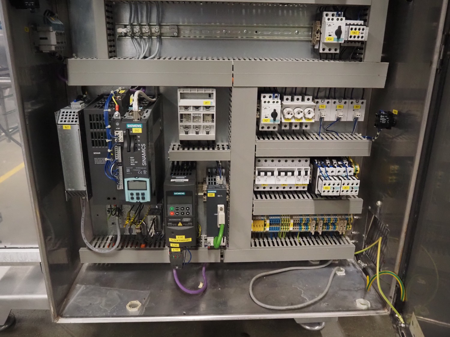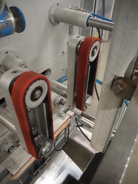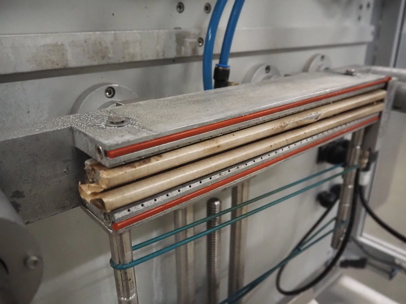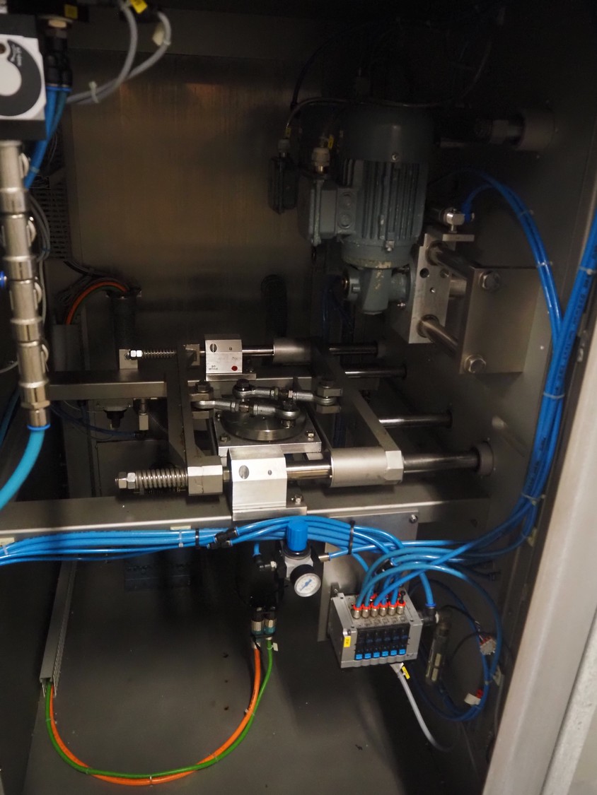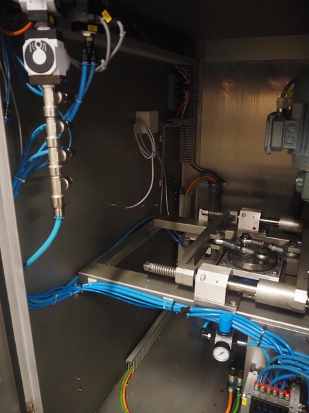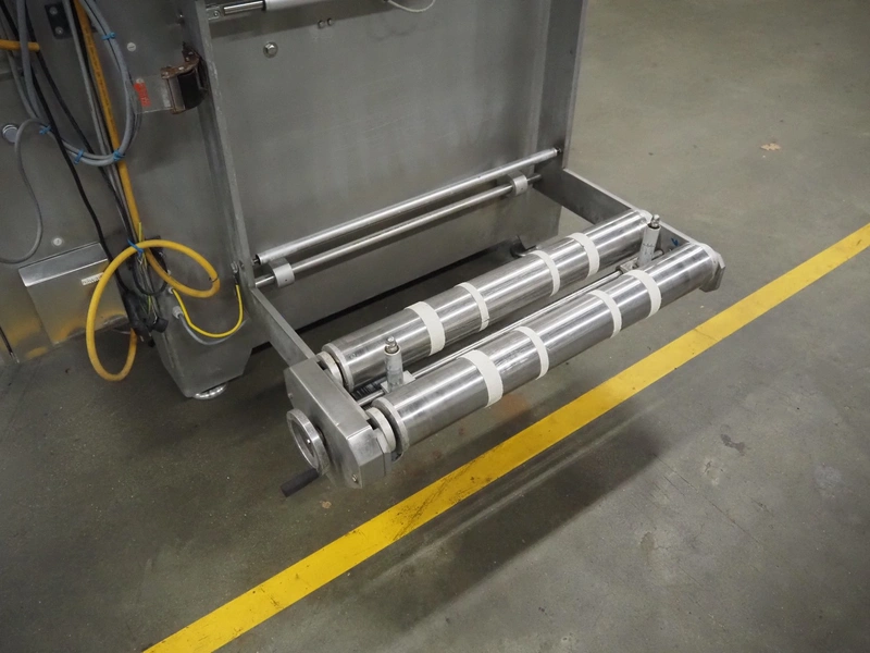 KOPAS Verpackungsmaschinen GmbH vertical form, fill and seal machine, machine type: JK 350 F-M-SERVO, machine number: E005, 3x400 V / 230 V AC, 24 V DC, 3x20 A, 6 bar, 10 kW, vertical seal length: 450 mm, horizontal seal length: 400 mm, total dimensions: 1500 mm x 2200 mm x 2000 mm. Incomplete.