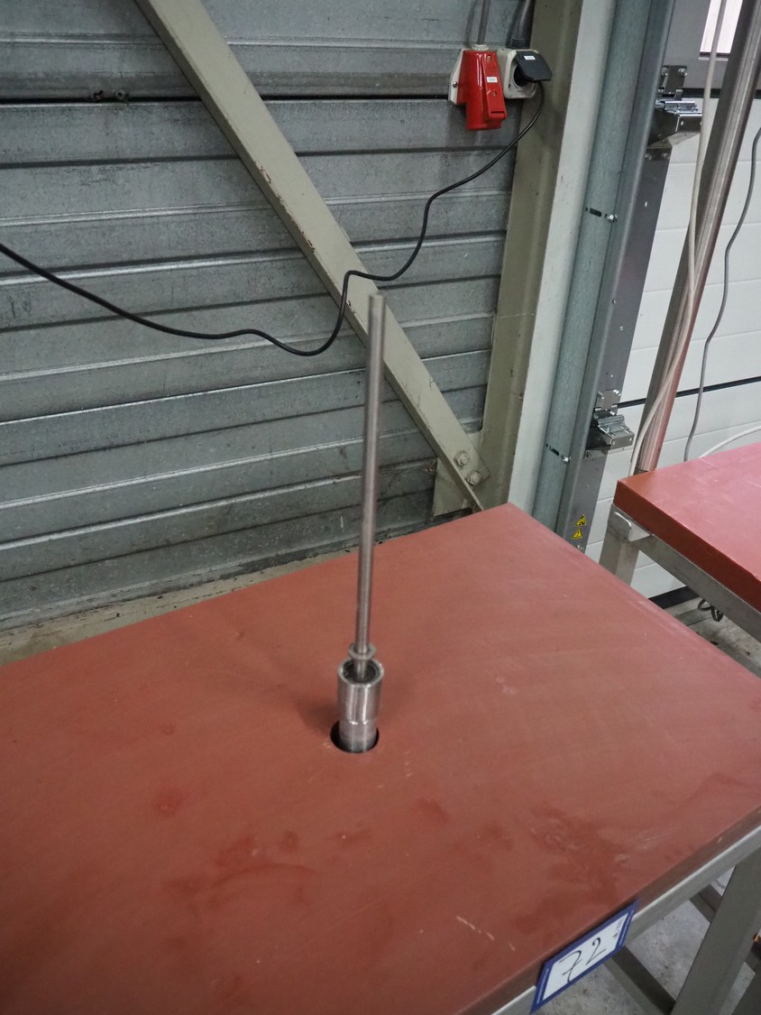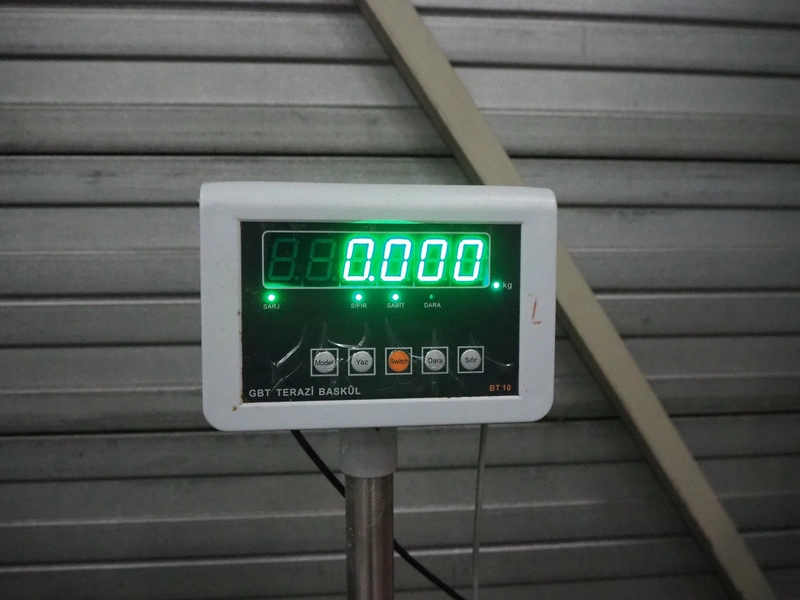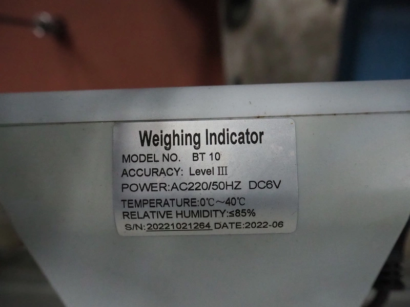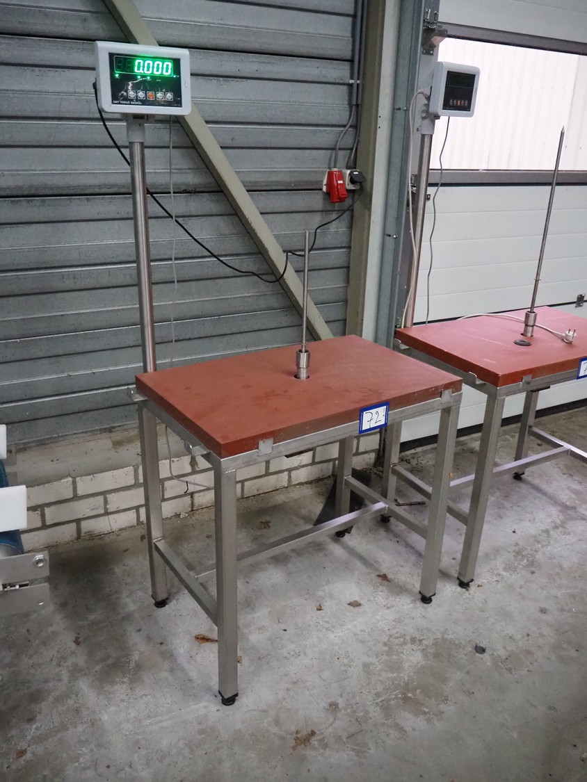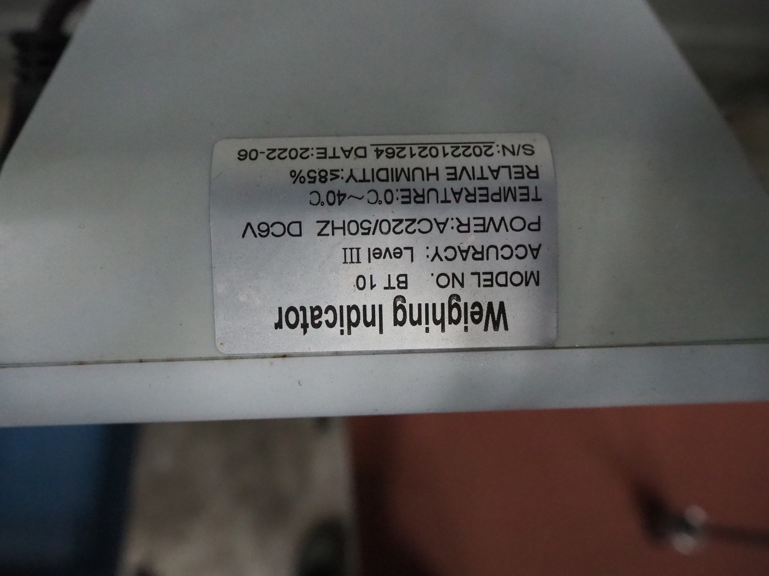 S/s table with plastic top and Kebab skewer with weighing unit, model: BT 10, serial number: 20221021264, year of construction: 2022-06, 220 V, 50 Hz, dimensions: 800 mm x 550 mm x 1650 mm.