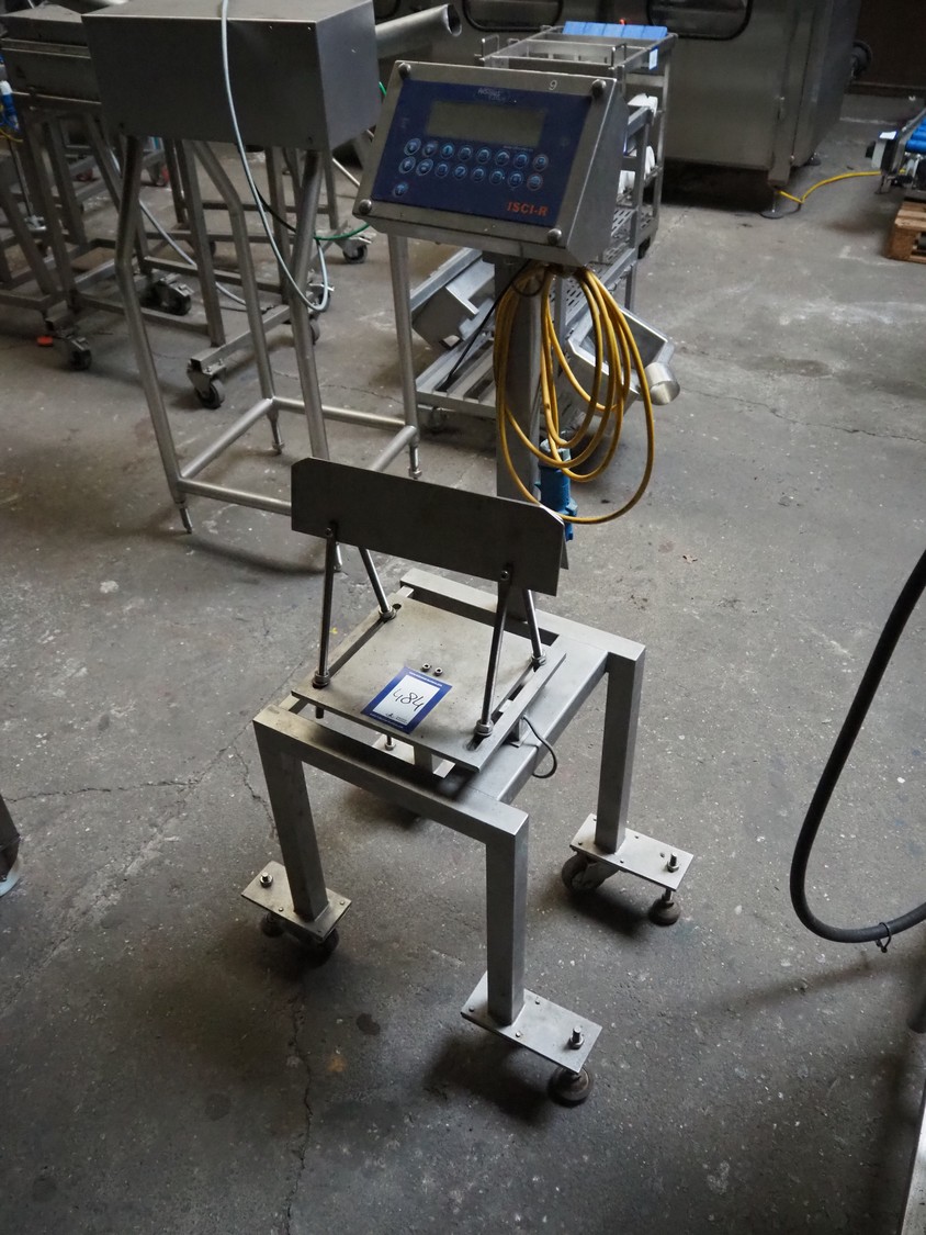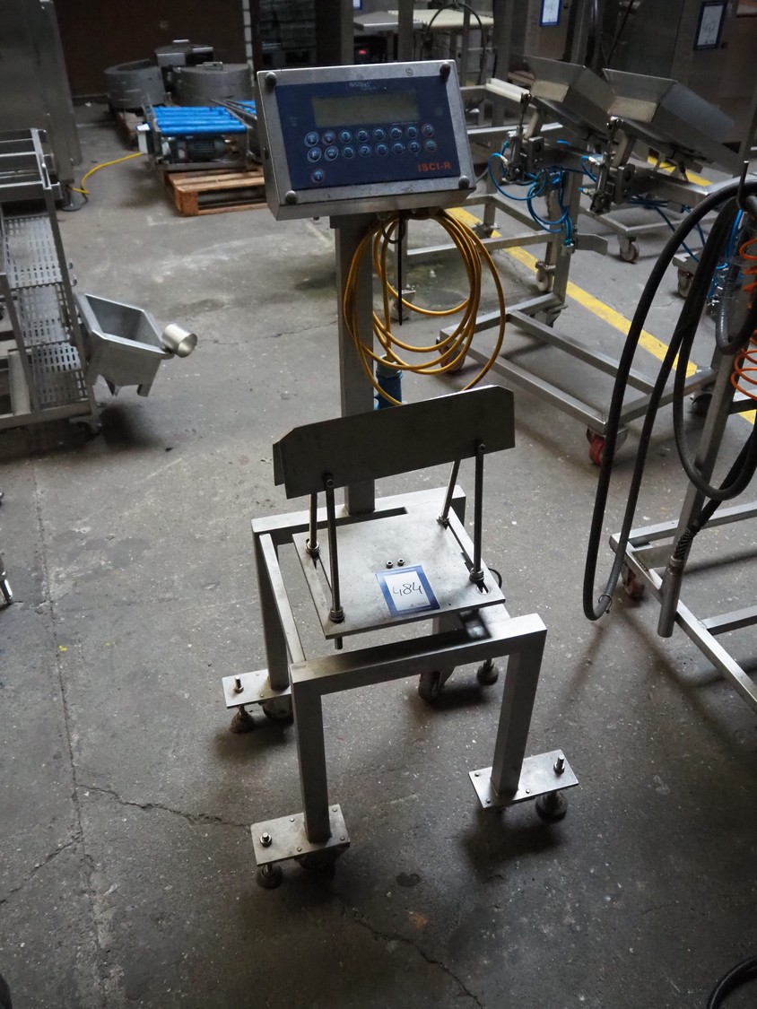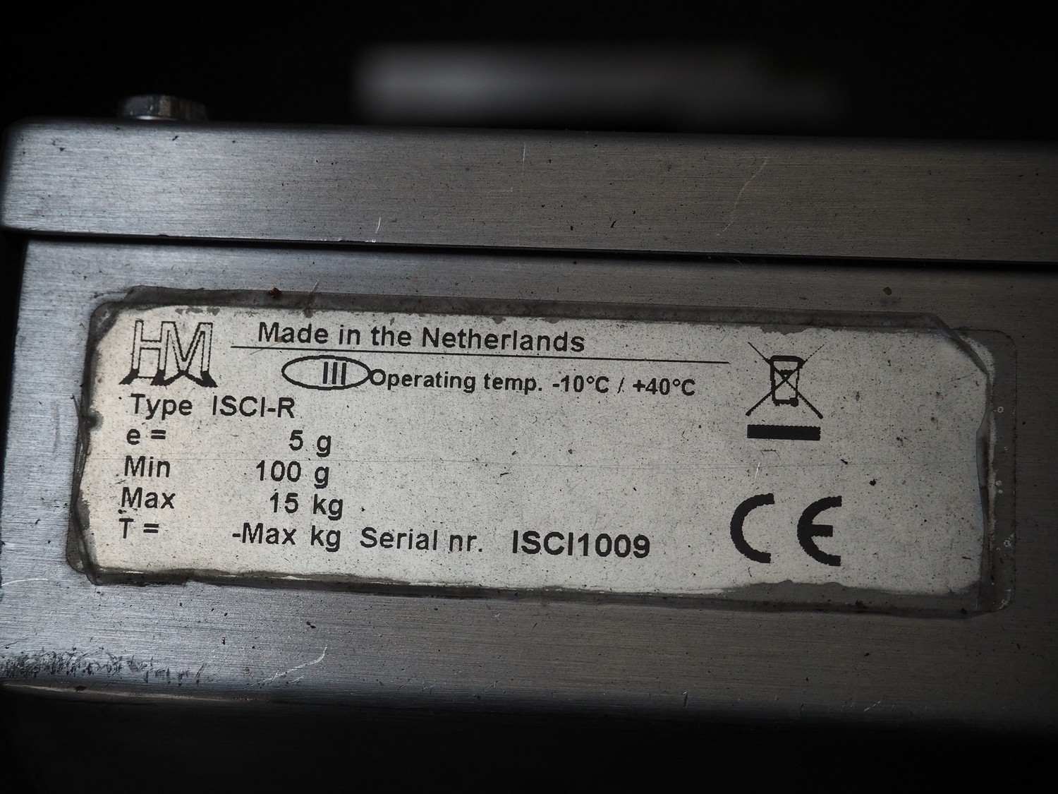HM mobile weighing scale, type: ISCI-R, serial number: ISCI1009, maximum weight: 15 kg, minimum weight: 100 gram, e= 5 gram, dimensions: 600 mm x 450 mm x 1300 mm.