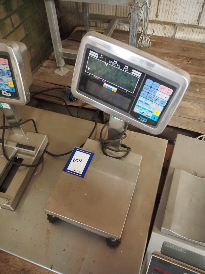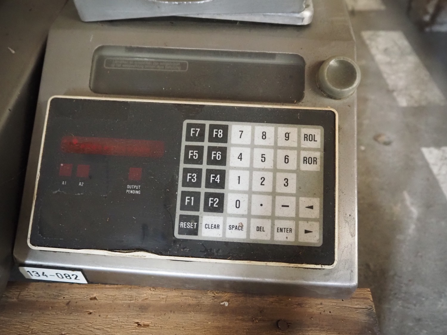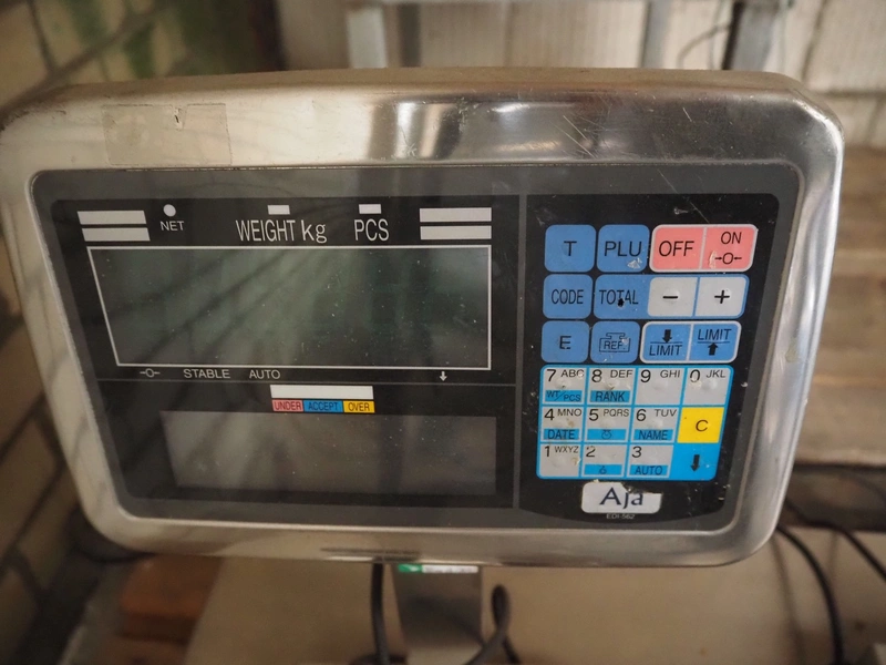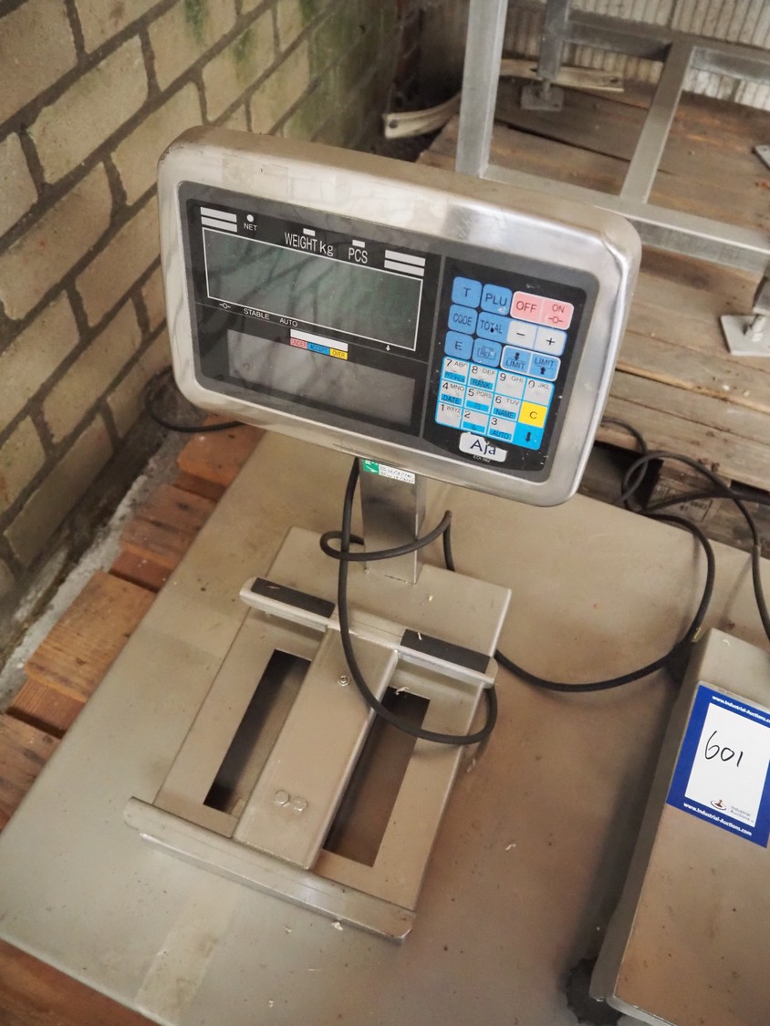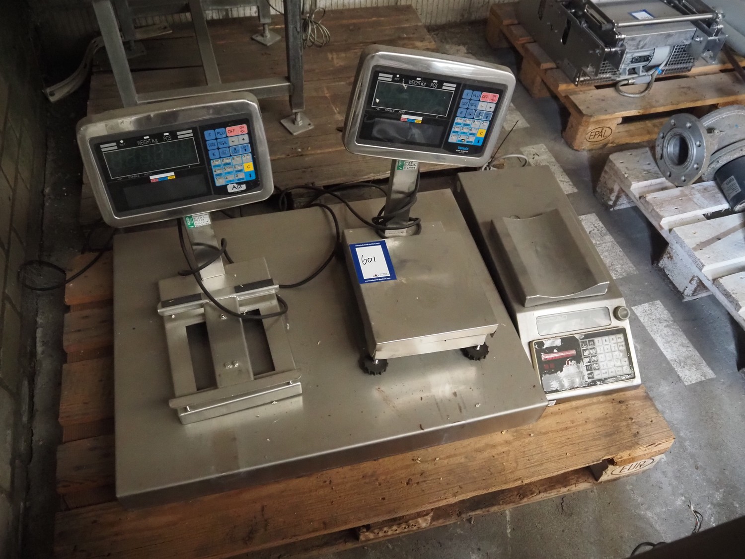 Pallet with 2 Aja weighing scales, dimensions scales: 240 mm x 240 mm, 1 scale missing, Weighing scale without indicator, dimensions: 800 mm x 600 mm, Buvv-Brown weighing scale, dimensions scale: 185 mm x 230 mm. Incomplete, technical condition unknown.