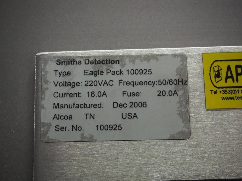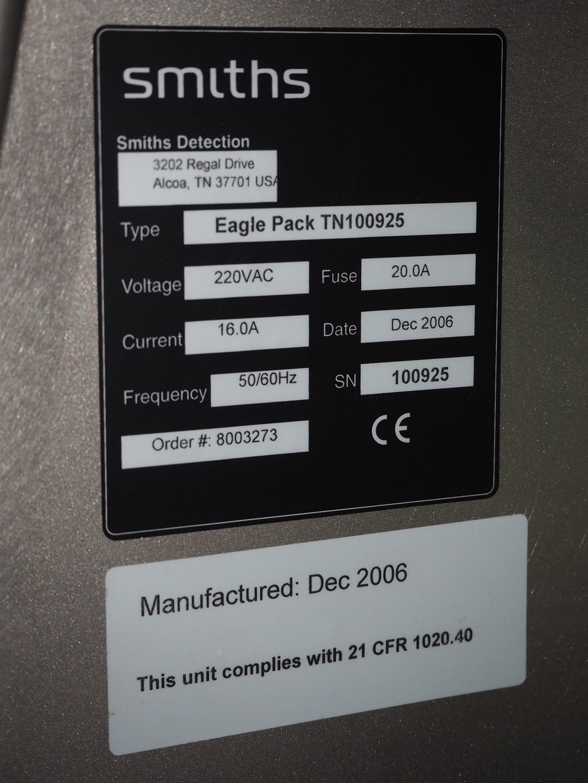Smiths X-ray scanner, type: Eagle Pack TN100925, serial number: 100925, year of construction: DEC 2006, 220 V, 50/60 Hz, 20.0/16.0 A, dimensions: 1130 mm x 800 mm x 2100 mm. Without belt.