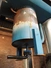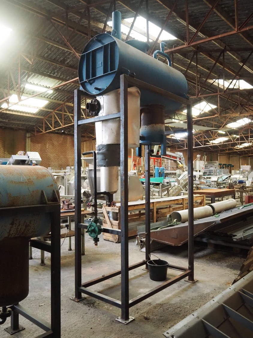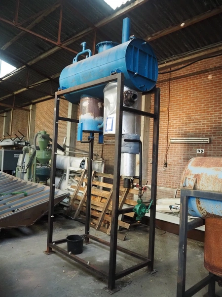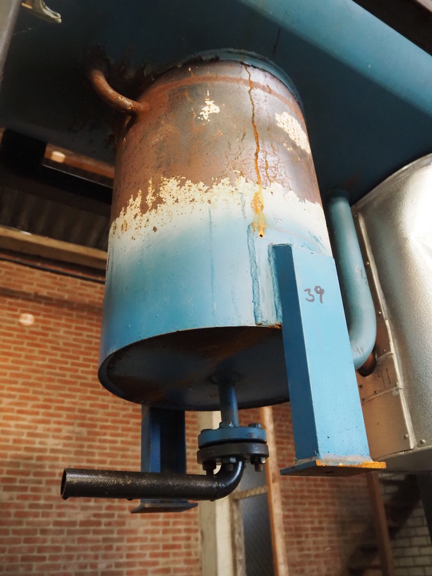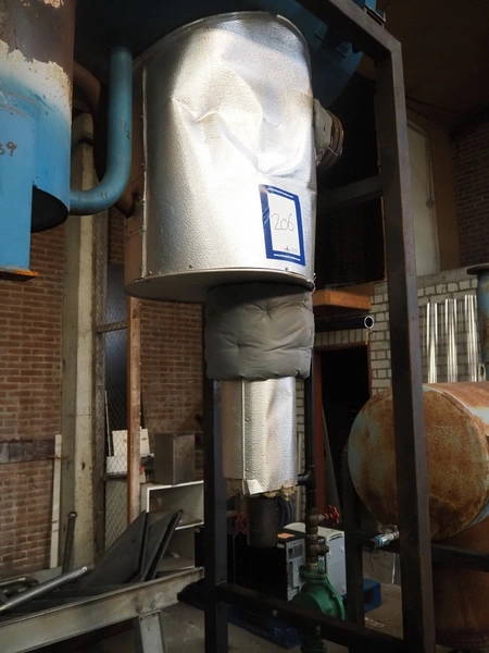 Steel vessel for steam boiler on steel frame, used to storage water to keep pressure on the water level, dimensions vessel: Ø 700 mm x 1400 mm, volume: approximately 530 liter, total dimensions: 1900 mm x 840 mm x 3550 mm.