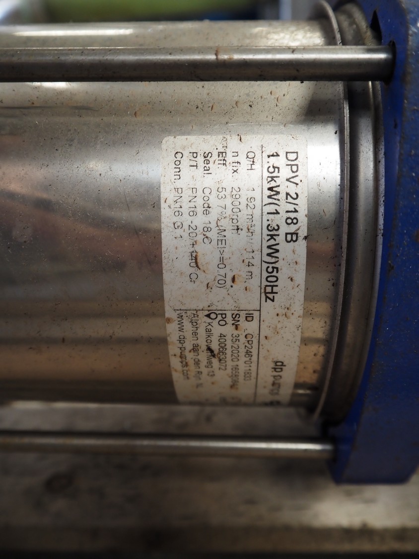 DP pumps centrifugal pump, type: DPV 2/18 B, 50 Hz, 1.5 kW, 2900 rpm, capacity; 1.92 m³ per hour, dimensions: 900 mm x 200 mm x 240 mm.