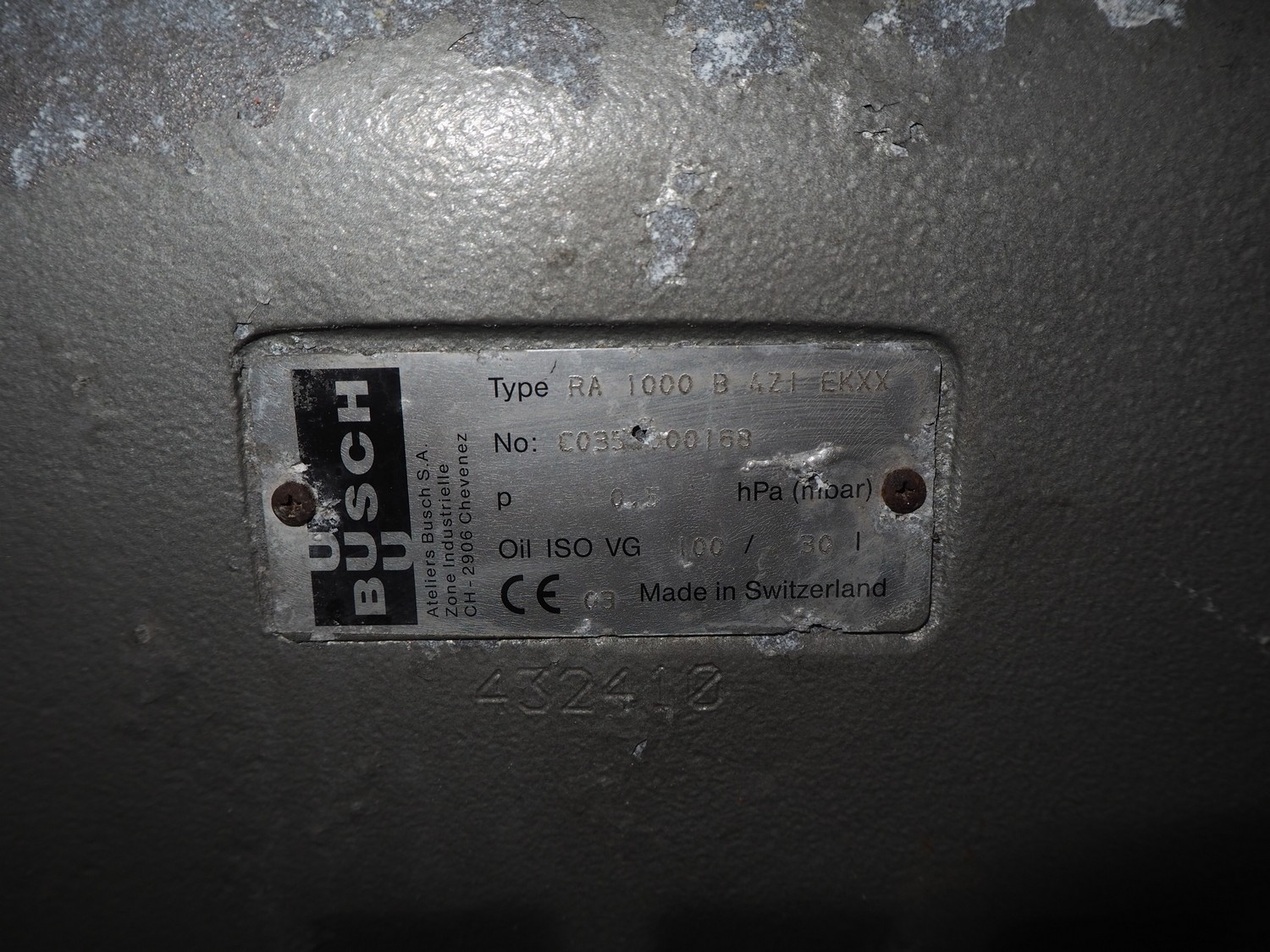 Busch vacuum pump, type: RA 1000 B 4ZI EKXX, year of construction: 2003, dimensions: 1850 mm x 1000 mm x 1650 mm.