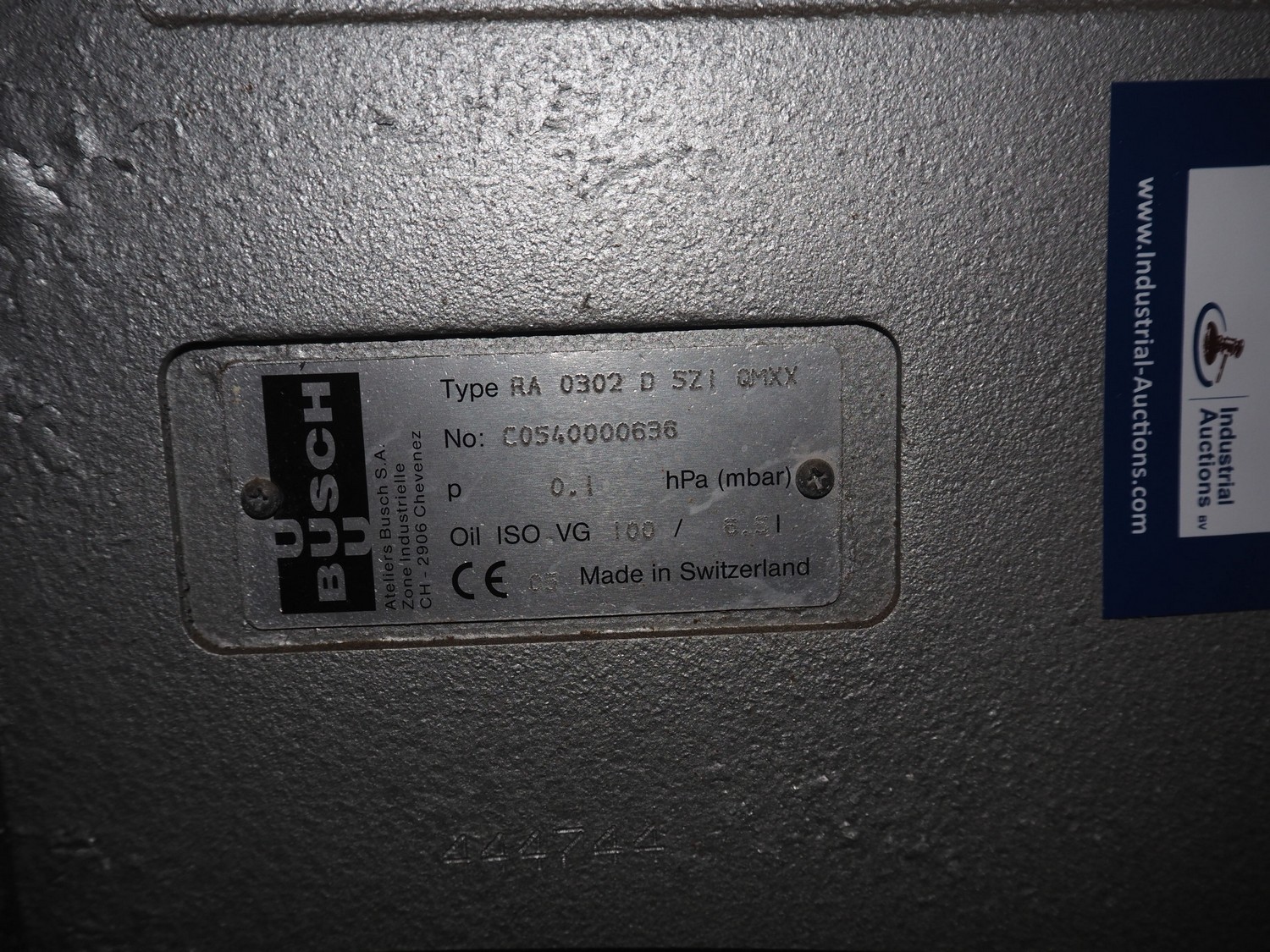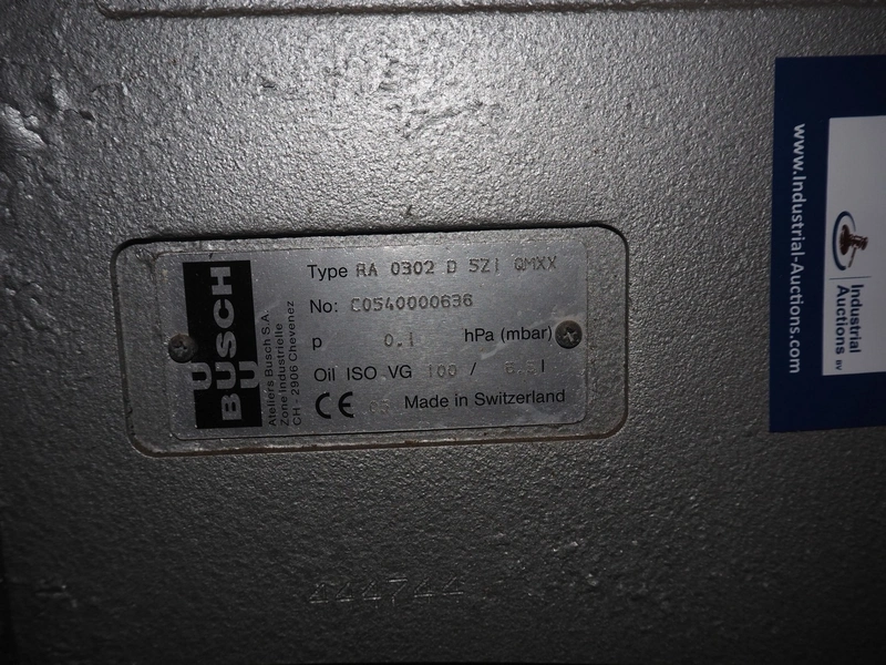 Busch vacuum pump on steel frame, type: RA 0302 D 5ZI, number: C0540000636, year of construction: 2005 capacity: 300 m³ per hour, dimensions: 1150 mm x 750 mm x 1150 mm.