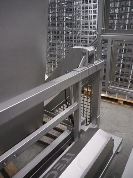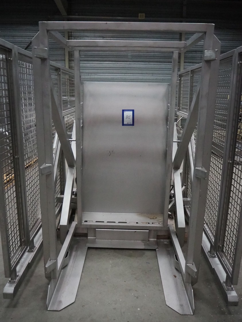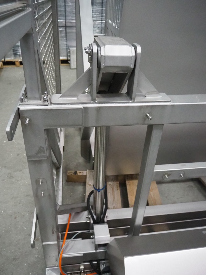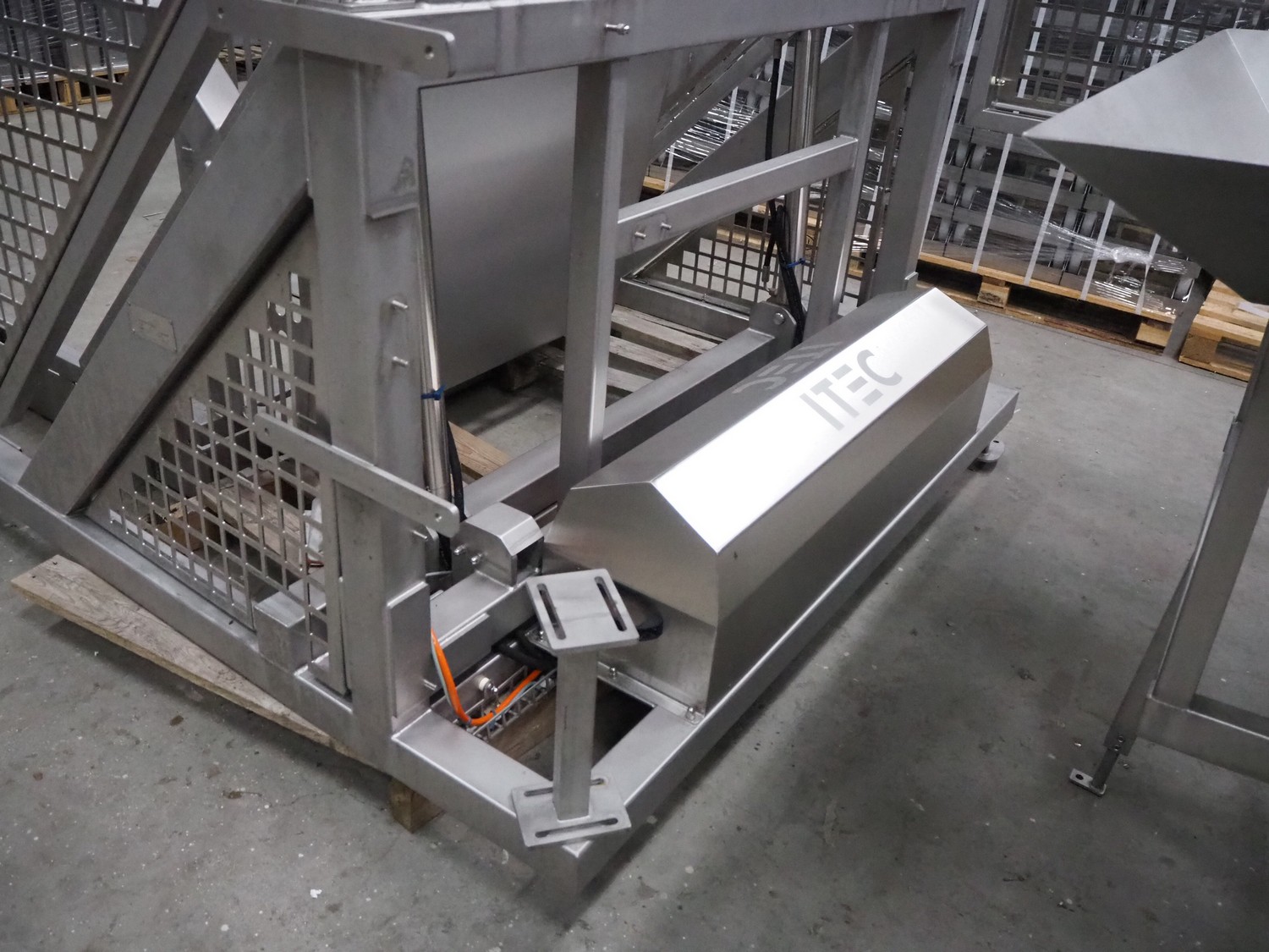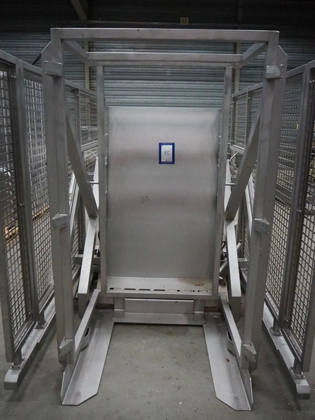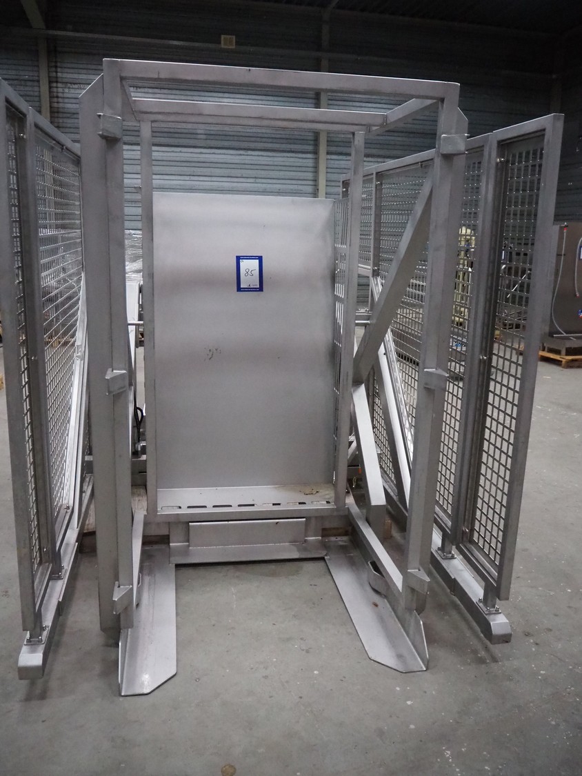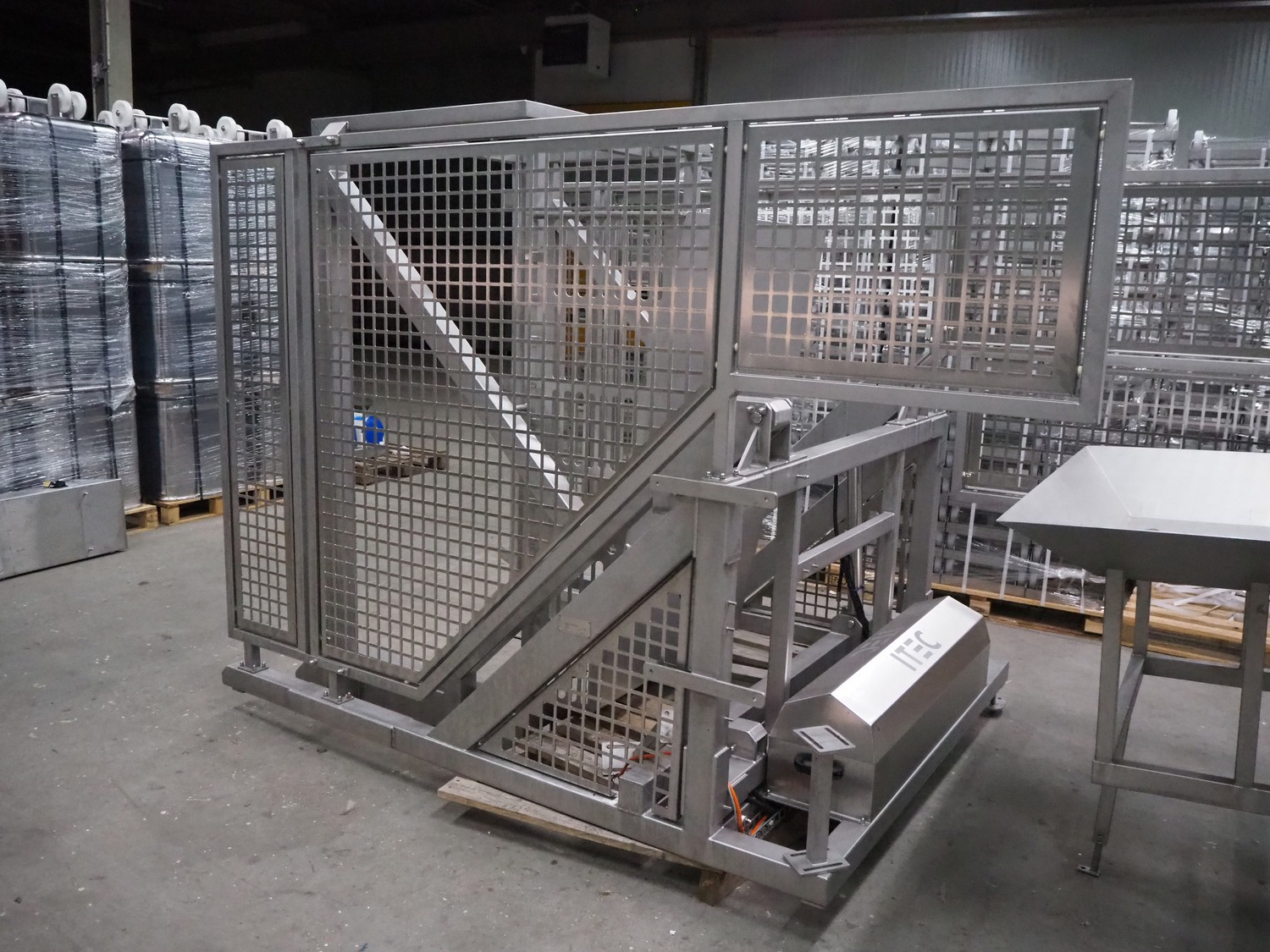 Itec Food Technology s/s tilting device for pallet boxes, type: 27200, series: 216, order number: 260216, year of construction: 10/2016, 400 V, 3 Ph, 50-60 Hz, 1.5 kW, maximum dimensions pallet boxes: 1050 mm x 1000 mm, total dimensions: 1800 mm x 2800 mm x 2200 mm.