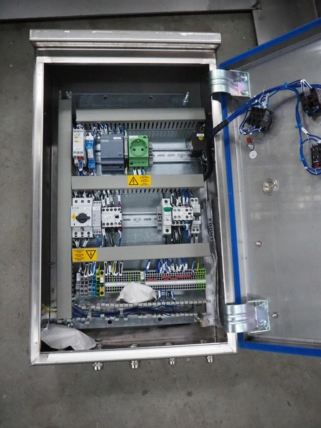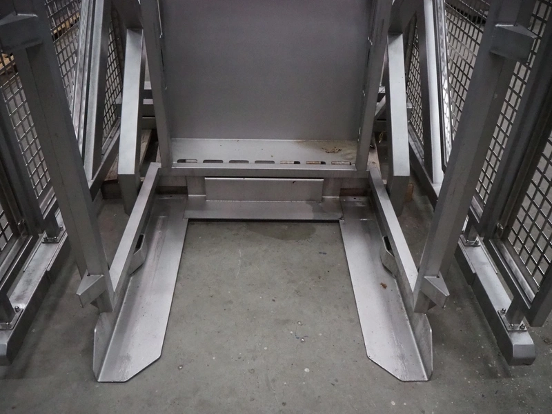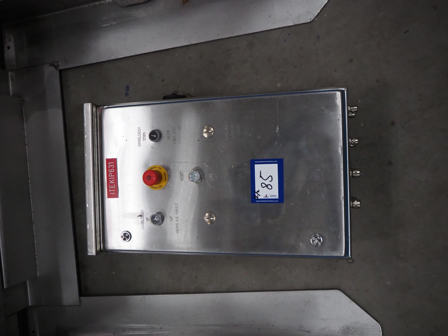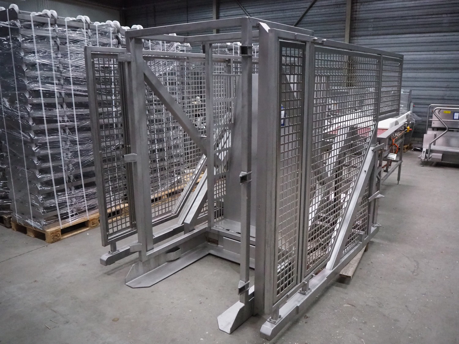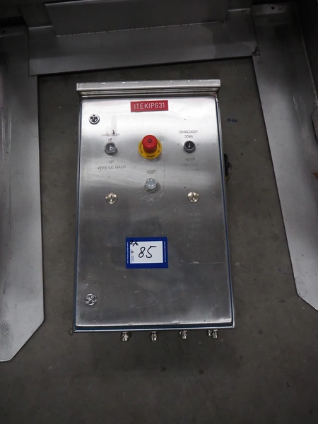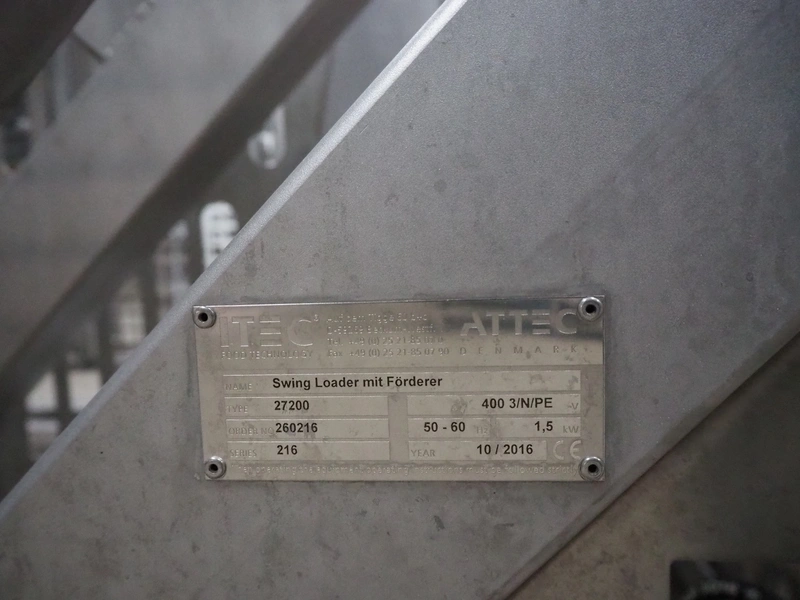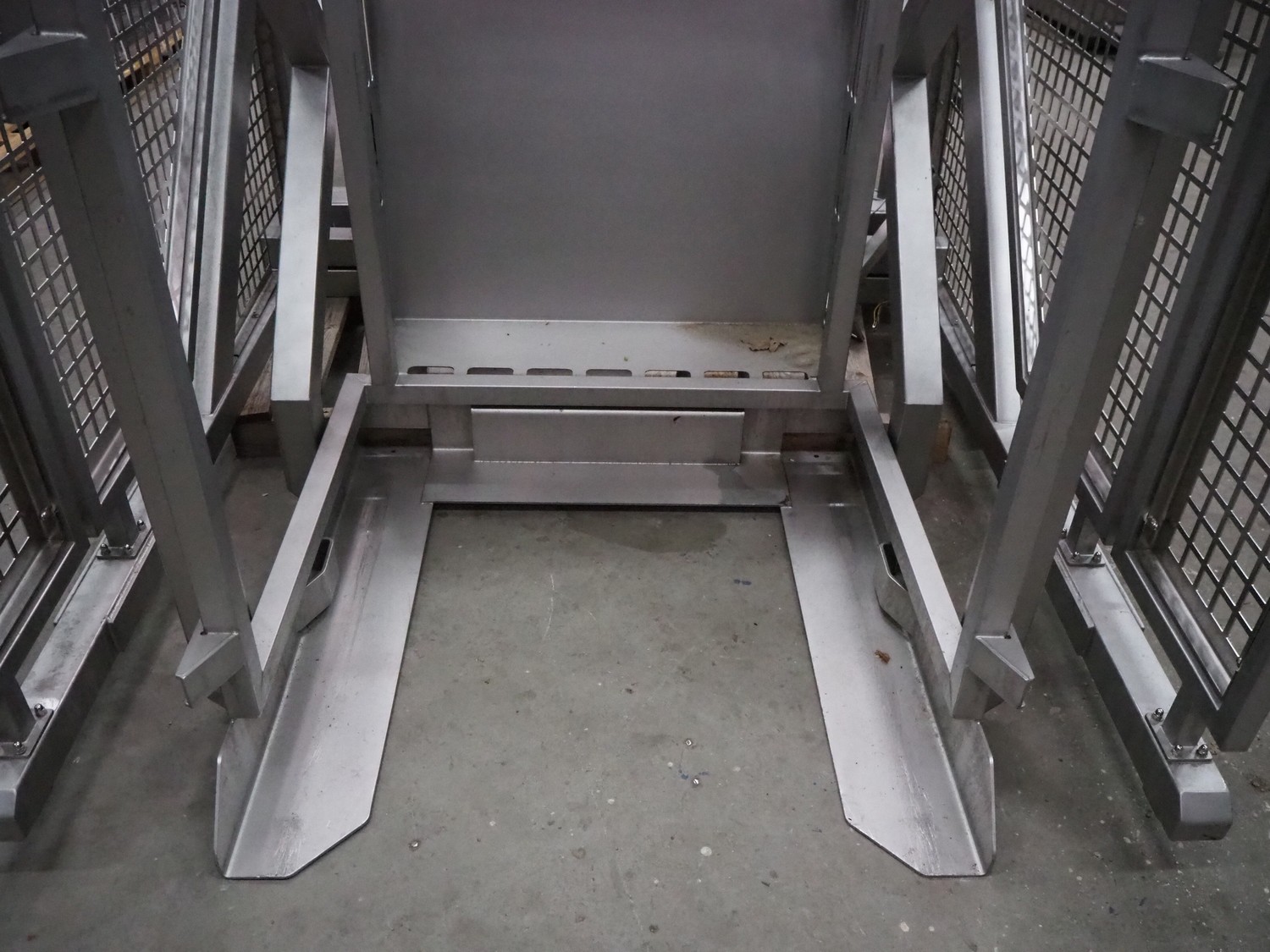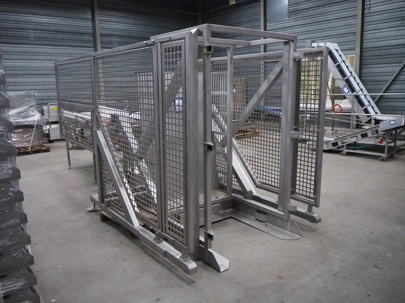 Itec Food Technology s/s tilting device for pallet boxes, type: 27200, series: 216, order number: 260216, year of construction: 10/2016, 400 V, 3 Ph, 50-60 Hz, 1.5 kW, maximum dimensions pallet boxes: 1050 mm x 1000 mm, total dimensions: 1800 mm x 2800 mm x 2200 mm.