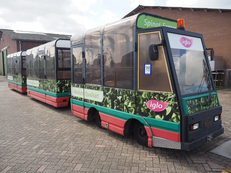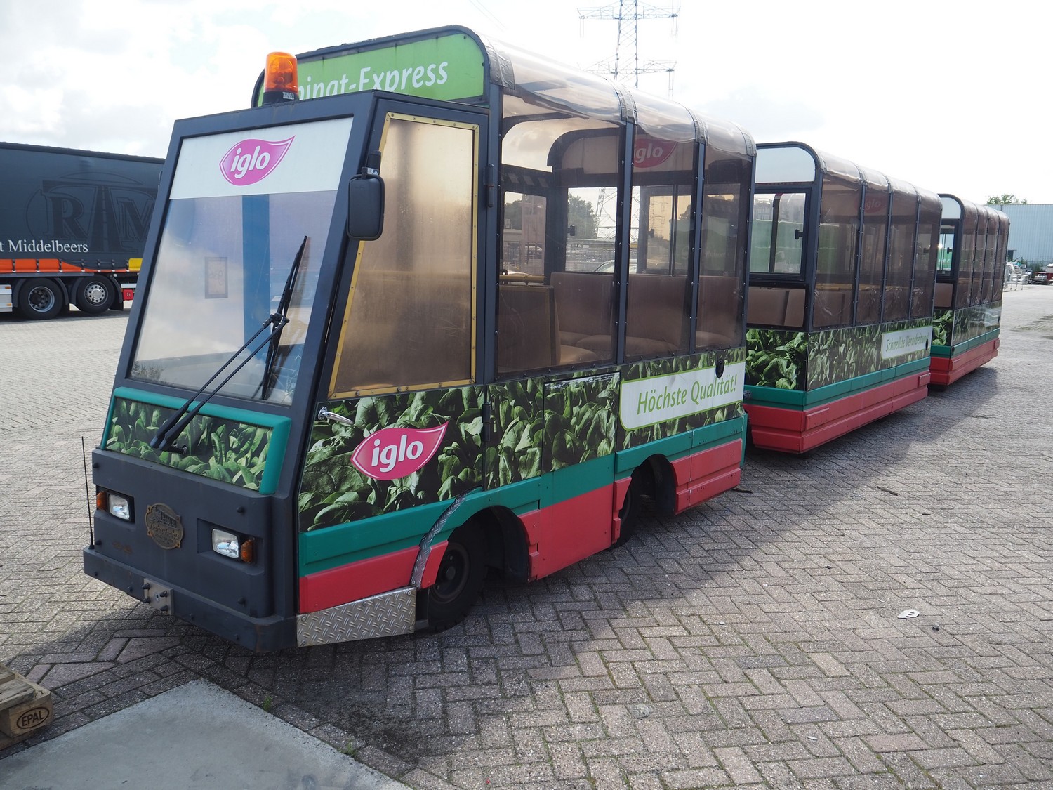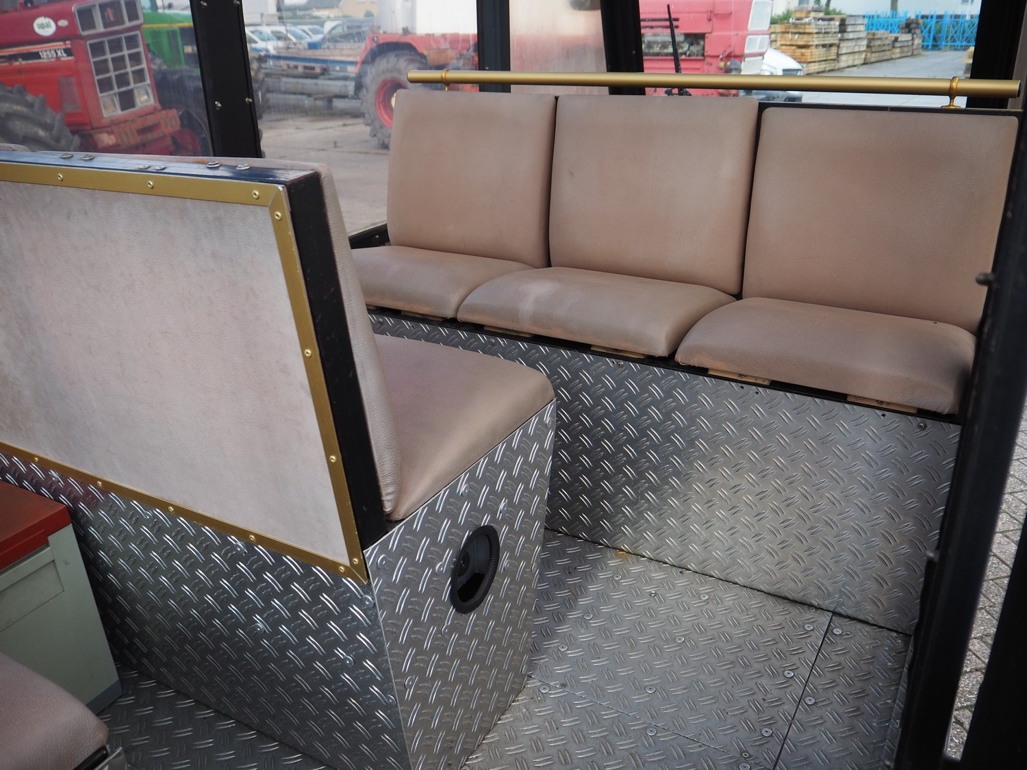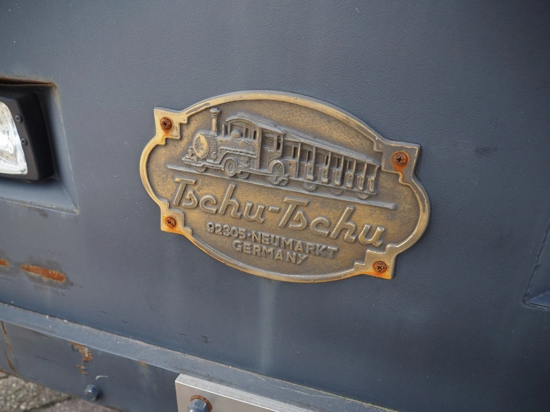 Tschu-Tschu-Bahnen electric train, type: EH, number: W09HEF23260T08001, year of construction: 2003, 48 V, weight: 4000 kg, 3 cabins, 29 passenger seats, dimensions each cabin: (1x) 3800 mm x 2550 mm x 1600 mm, (1x) 4200 mm x 2550 mm x 1600 mm, (1x) 4200 mm x 2550 mm x 1600 mm, total dimensions: 14100 mm x 2550 mm x 1600 mm. Without battery charger.