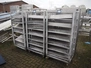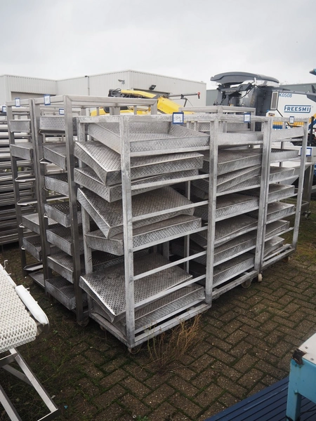 8 s/s trolleys with large amount of s/s bins with drains, diameter drains: 6 mm, dimensions bins: 750 mm x 440 mm x 100 mm, dimensions trolleys: (5x) 550 mm x 820 mm x 1660 mm and (3x) 550 mm x 820 mm x 1780 mm.