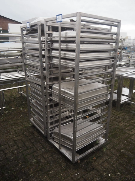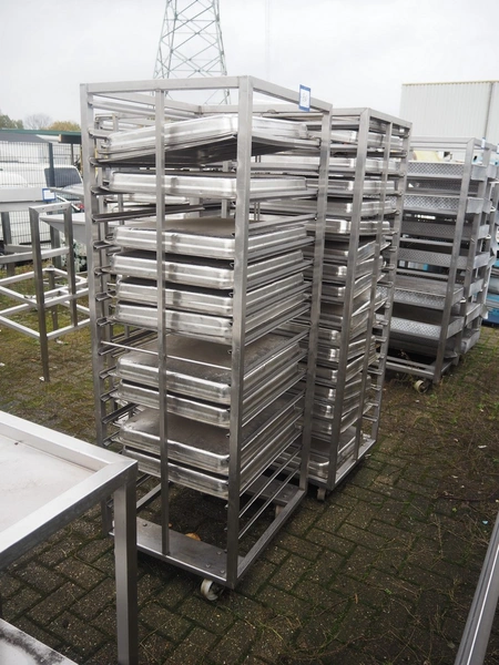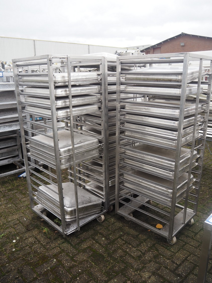 3 s/s trolleys with 28 s/s bins, dimensions bins: (28x) 520 mm x 640 mm x 65 mm, dimensions trolleys: (3x) 600 mm x 720 mm x 1780 mm.
