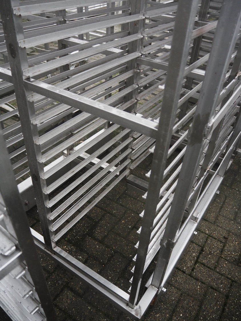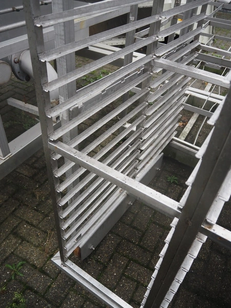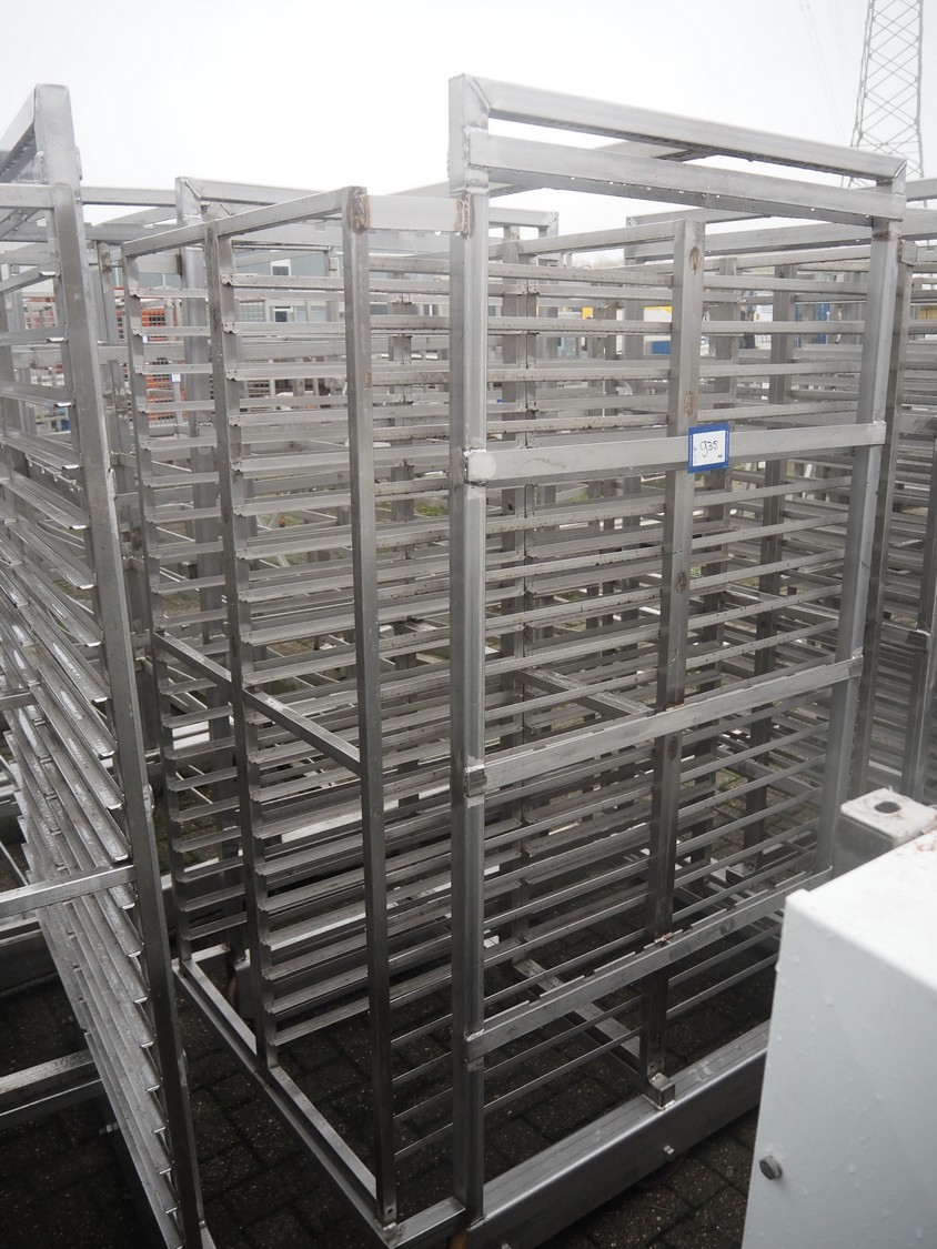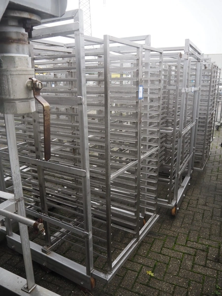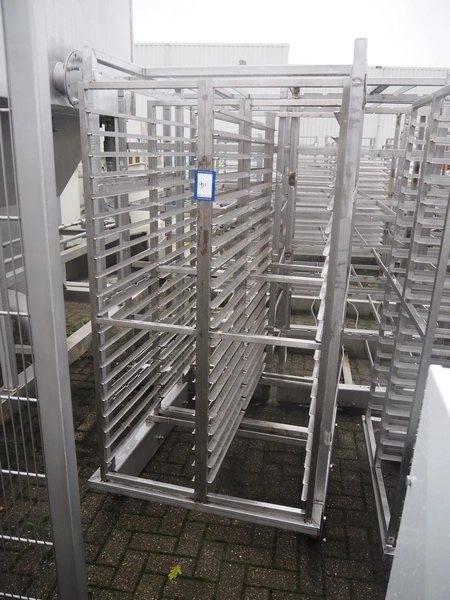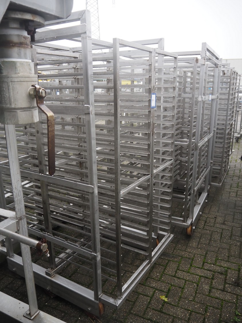 2 s/s trolleys for plates, (2x) 20 floors, dimensions each floor: 600 mm x 400 mm, distance between floors: 70 mm, total dimensions: (2x) 1000 mm x 1300 mm x 2000 mm.