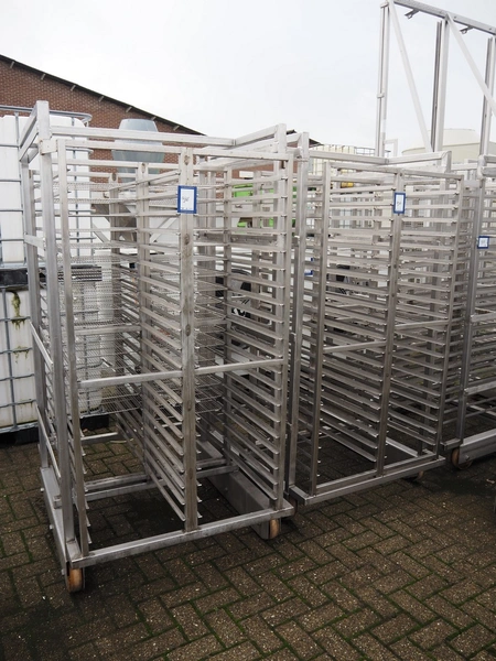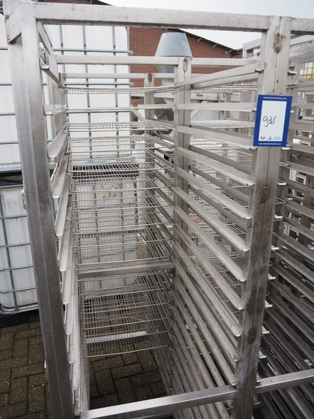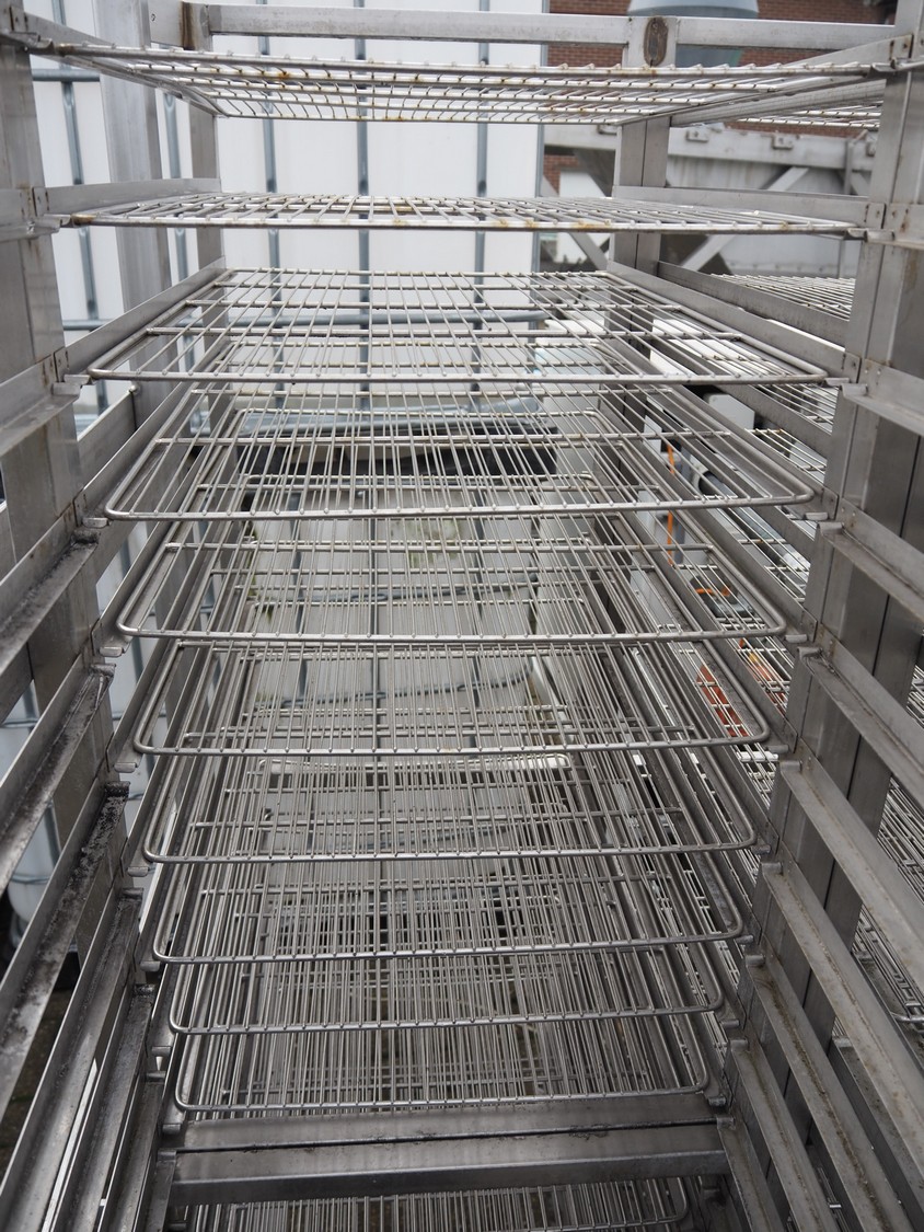 2 s/s trolleys for plates, (2x) 20 floors, dimensions each floor: 600 mm x 400 mm, distance between floors: 70 mm, total dimensions: (2x) 1000 mm x 1300 mm x 2000 mm.