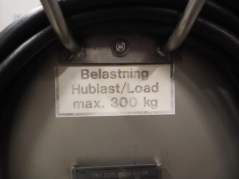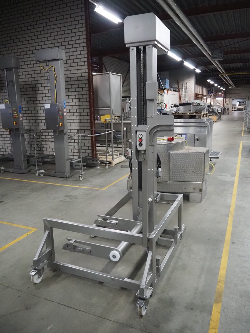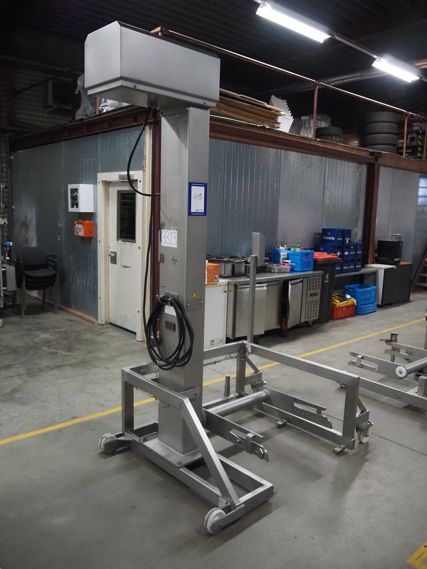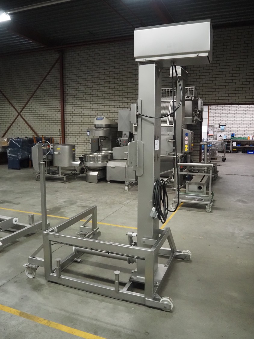 Carsoe mobile lifter for 200 litres meat bins, type: HKV 200, serial number: SM 98198, lifting height: 1400 mm, maximum load capacity: 300 kg, total dimensions: 2100 mm x 700 mm x 2300 mm.