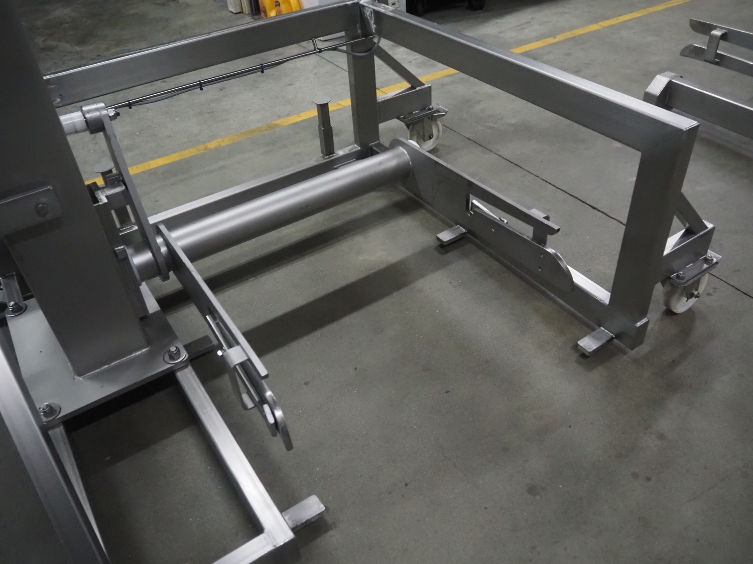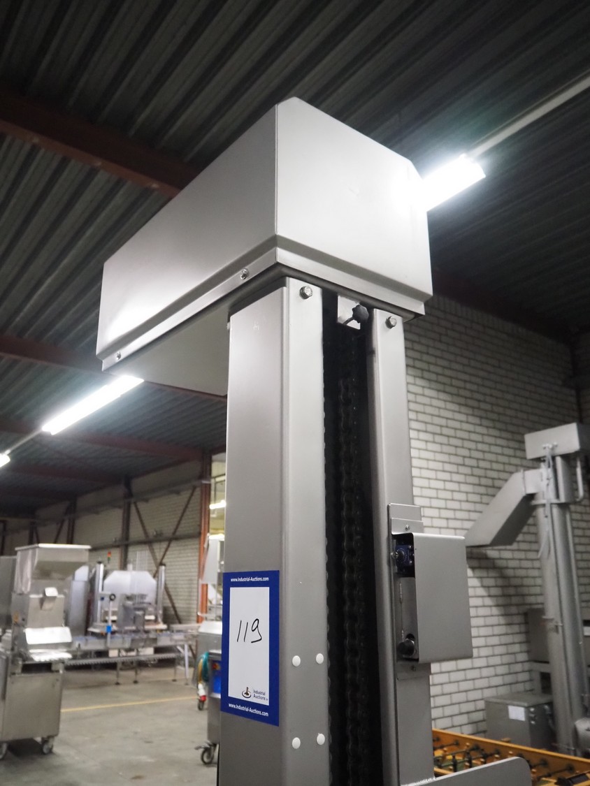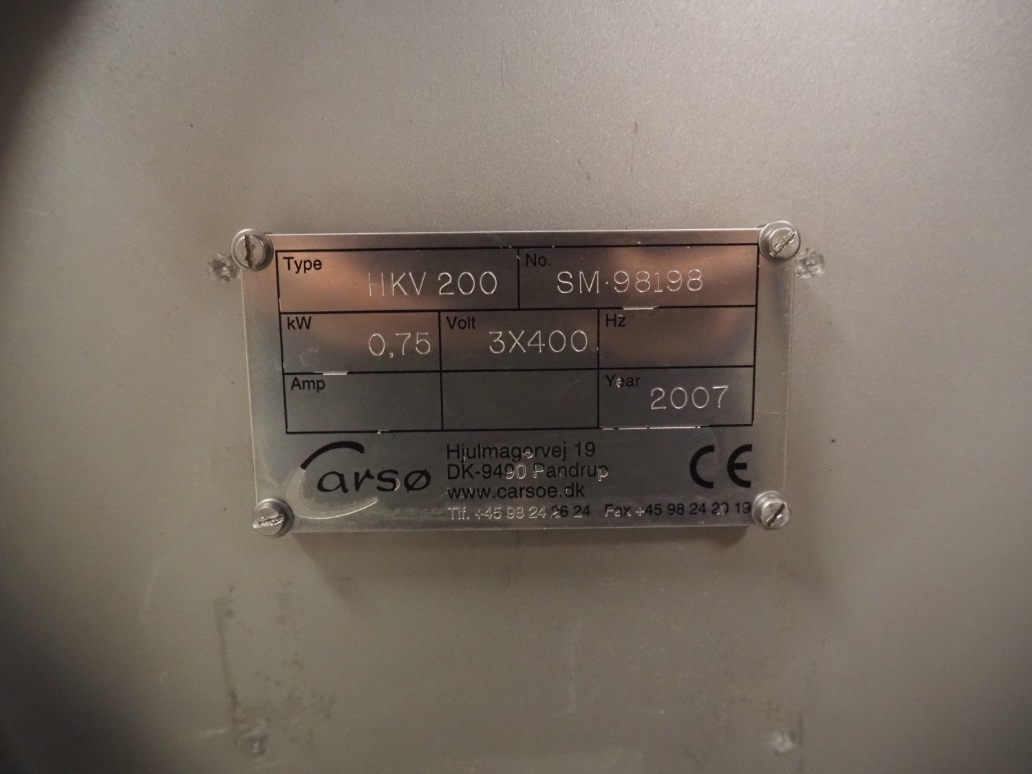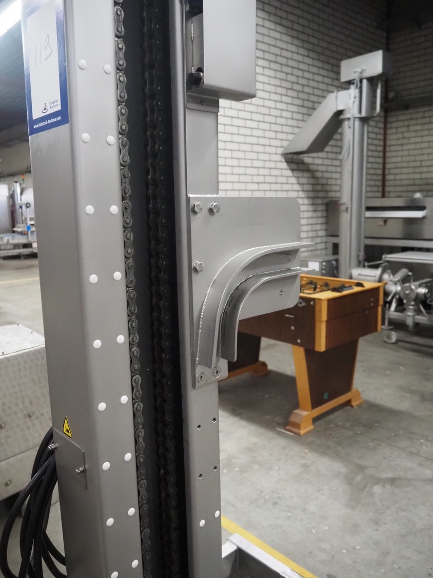 Carsoe mobile lifter for 200 litres meat bins, type: HKV 200, serial number: SM 98198, lifting height: 1400 mm, maximum load capacity: 300 kg, total dimensions: 2100 mm x 700 mm x 2300 mm.