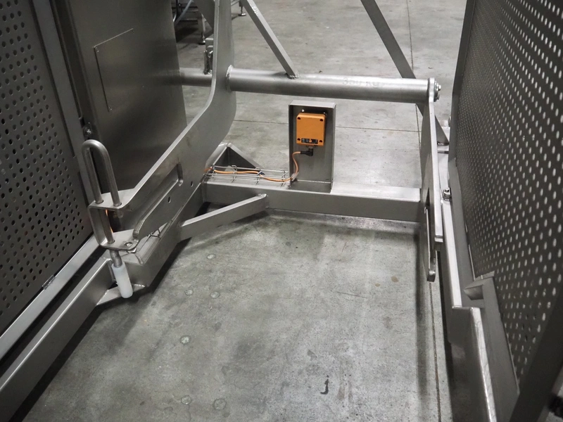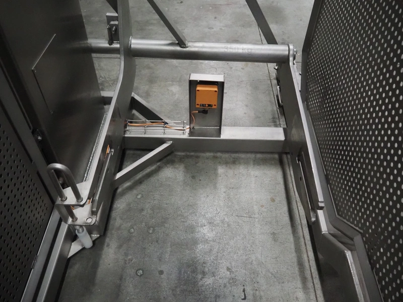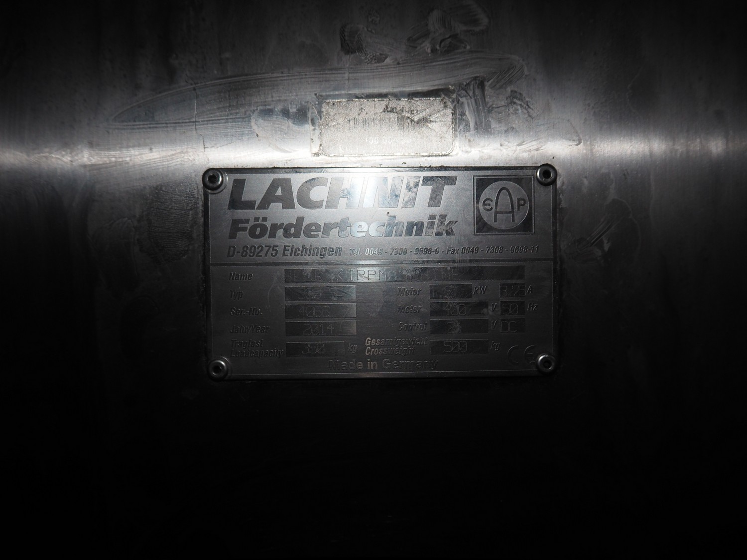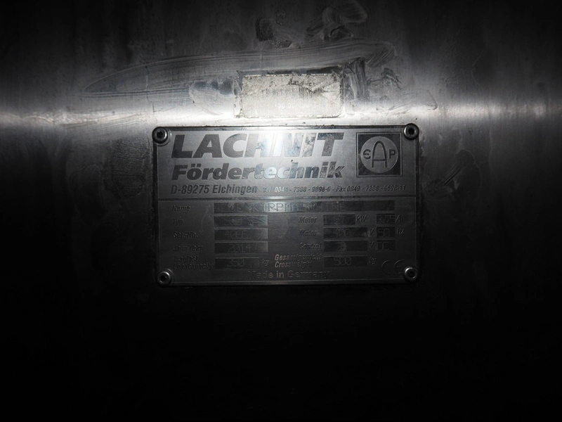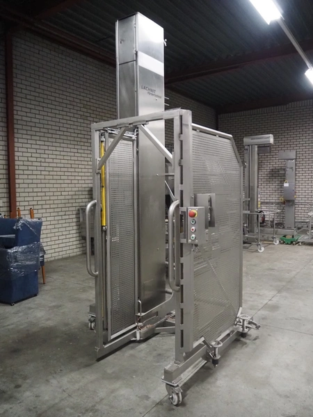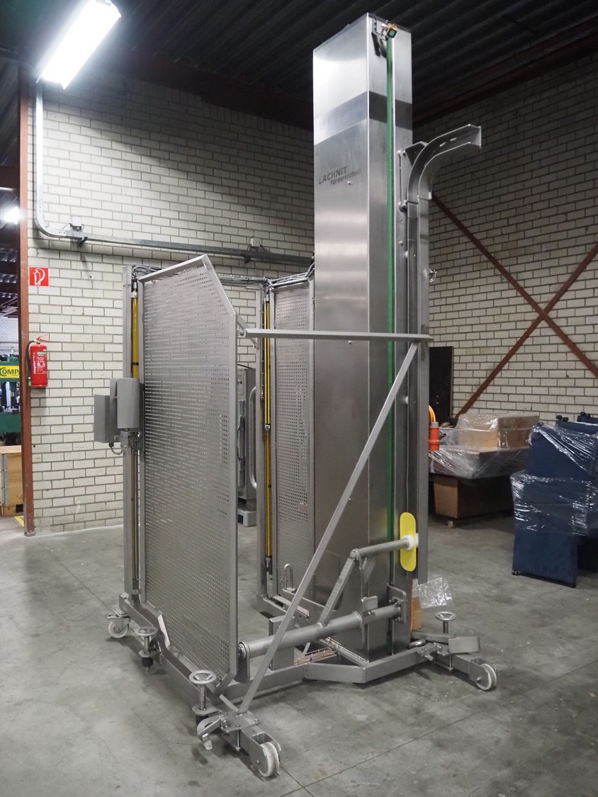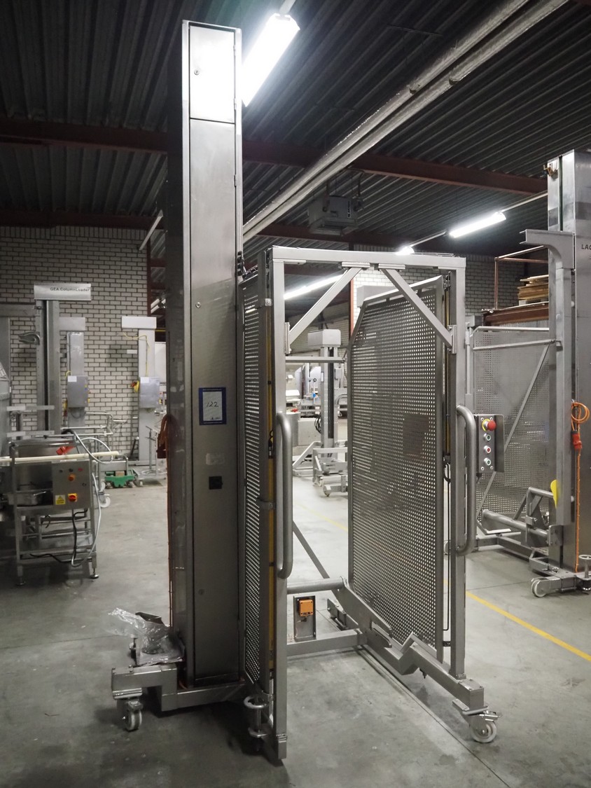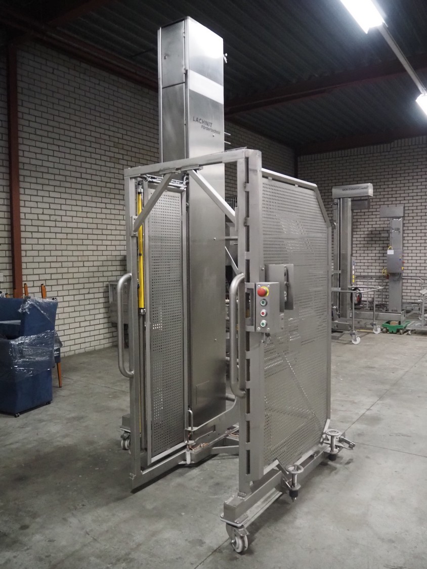 Lachnit Fördertechnik mobile lifter for 200 litres meat bins with safety cage, type: 300 S, serial number: 4066, year of construction: 2014, 400 V, 50 Hz, 3.75 A, 1.5 kW, lifting height: 2850 mm, maximum load capacity: 350 kg, weight: 500 kg, total dimensions: 1600 mm x 1850 mm x 3600 mm.